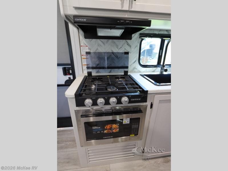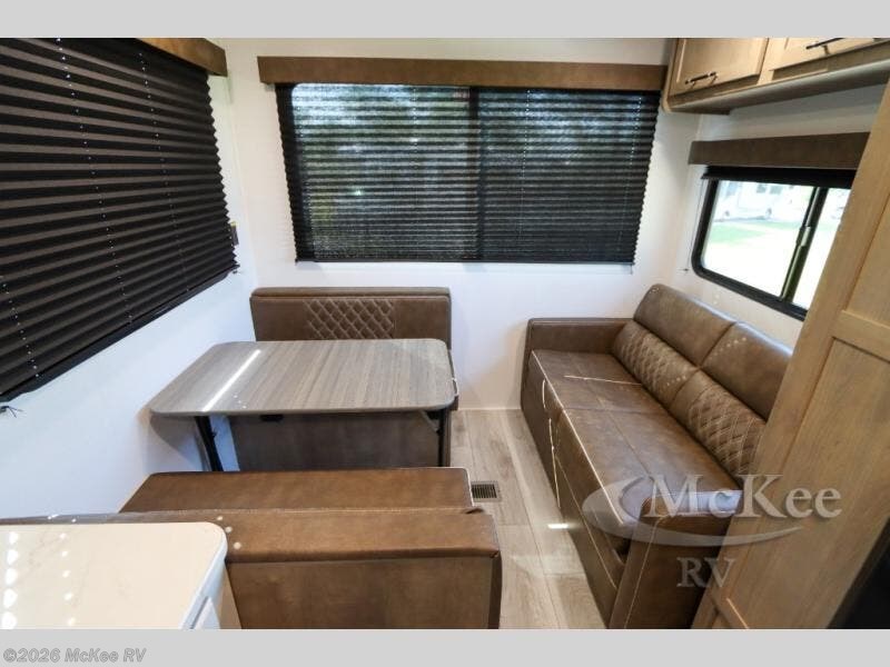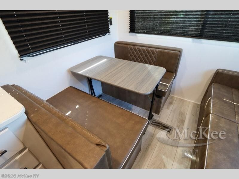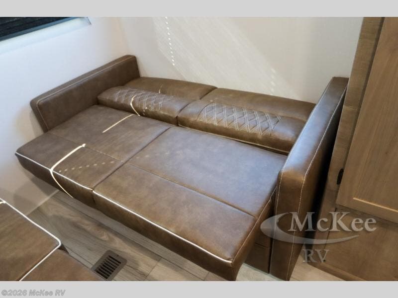 This trailer is perfect for your crew of four to six. There is a queen bed in the semi-private bedroom, along with dual closets and nightstands to keep your things tidy. You can dine each day on the booth dinette, relax on the sofa, and house additional guests here at night. The kitchen includes everything you need to prepare meals each day, including a gas range, microwave, and a 10 cu. ft. 12V refrigerator for cold items. And the full bath on board lets you stay clean throughout each camping trip!