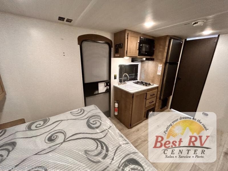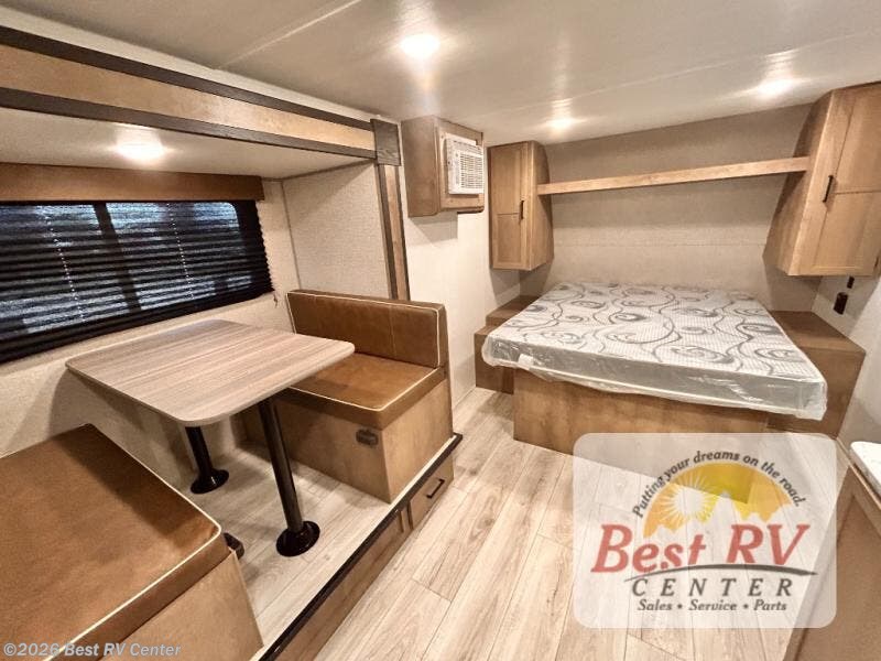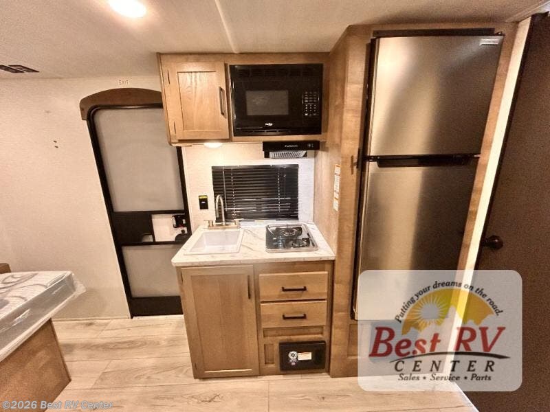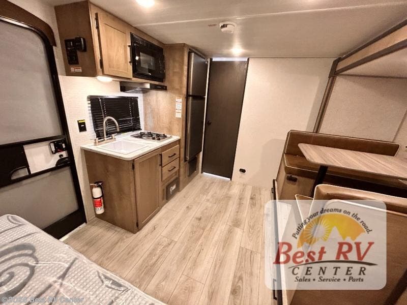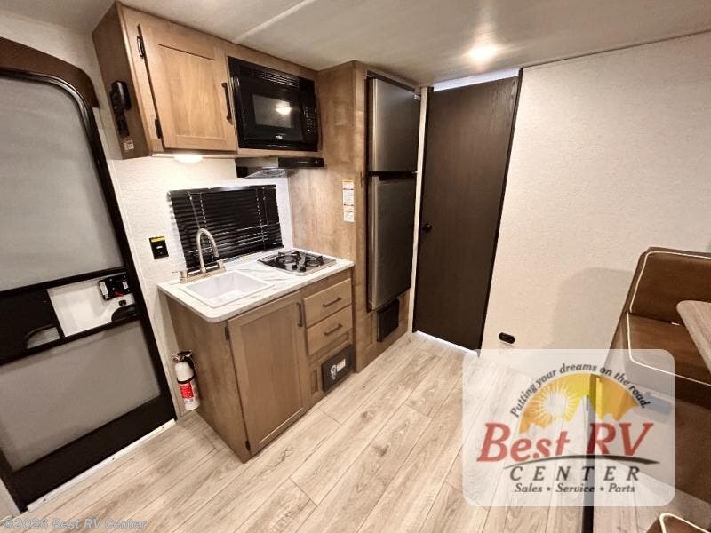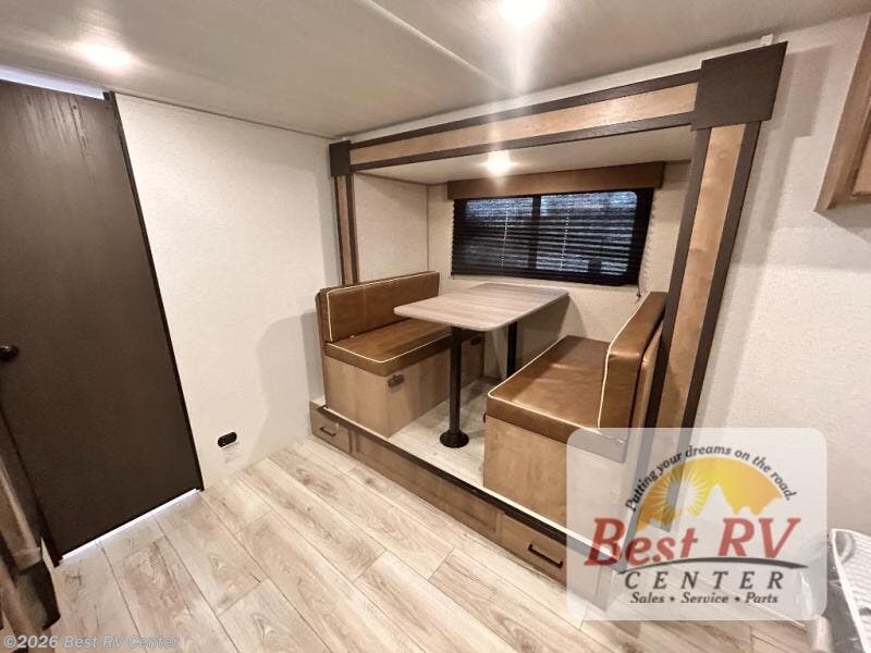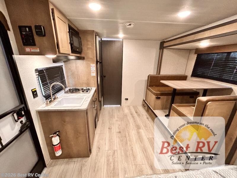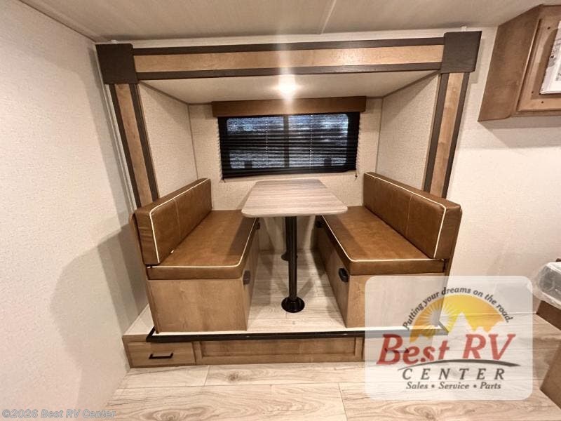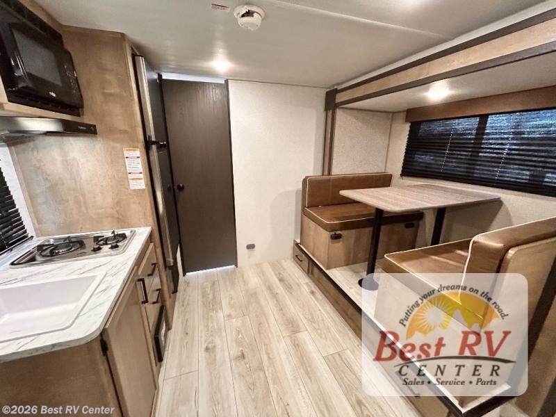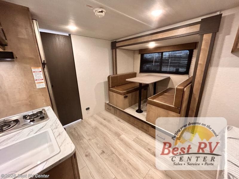 This is the perfect couple's RV with a walk-around queen bed up front with dual closets and nightstands, and a spacious rear bathroom. The galley kitchen offers a two burner cooktop and a sink to wash the dishes, plus there is a 7.7 cu. ft. 12V refrigerator for the cold items. You two can dine at the booth dinette slide which offers more floor space, plus there is drawer storage for your hand towels, pots and/or blankets. The 10' power awning provides protection so you can sit on your camping chairs while enjoying the outdoors.