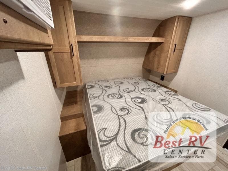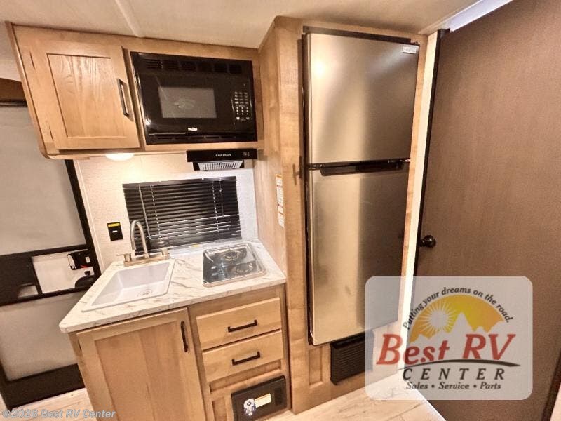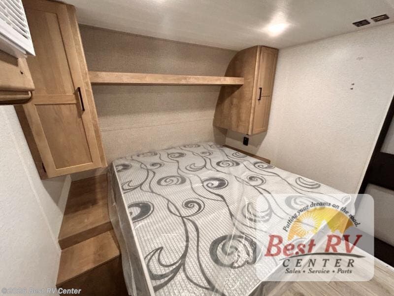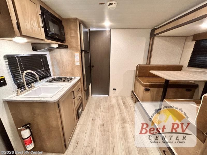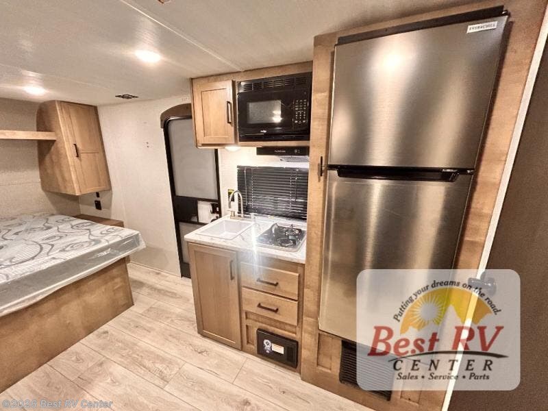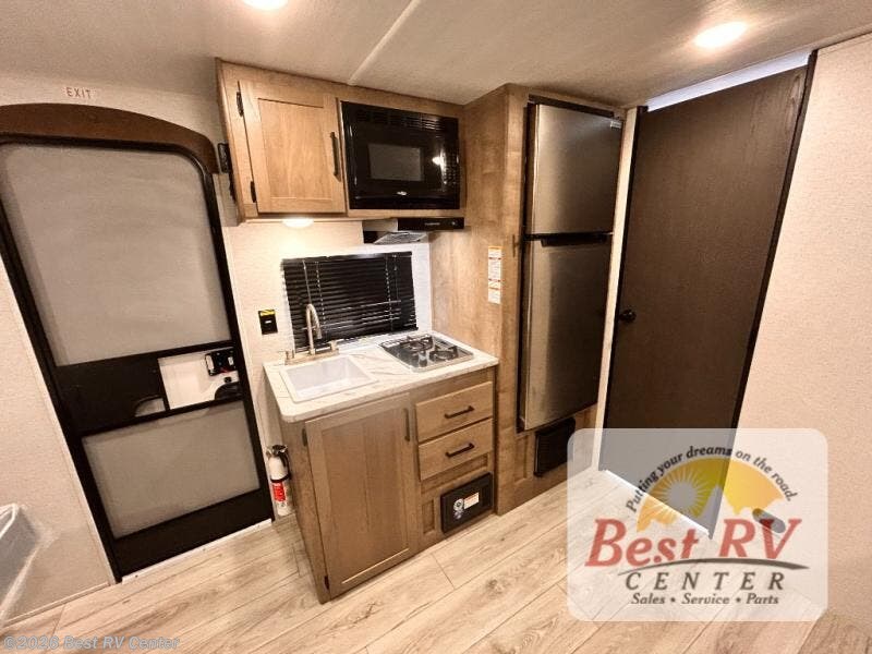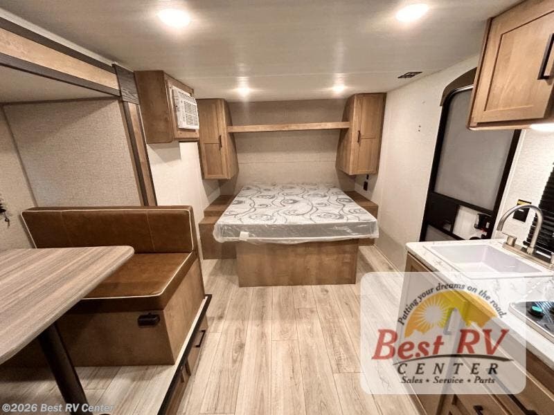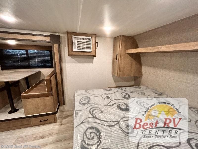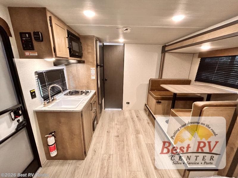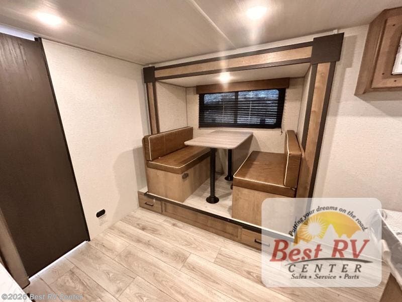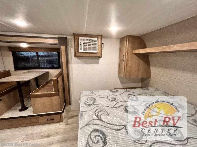 This is the perfect couple's RV with a walk-around queen bed up front with dual closets and nightstands, and a spacious rear bathroom. The galley kitchen offers a two burner cooktop and a sink to wash the dishes, plus there is a 7.7 cu. ft. 12V refrigerator for the cold items. You two can dine at the booth dinette slide which offers more floor space, plus there is drawer storage for your hand towels, pots and/or blankets. The 10' power awning provides protection so you can sit on your camping chairs while enjoying the outdoors.