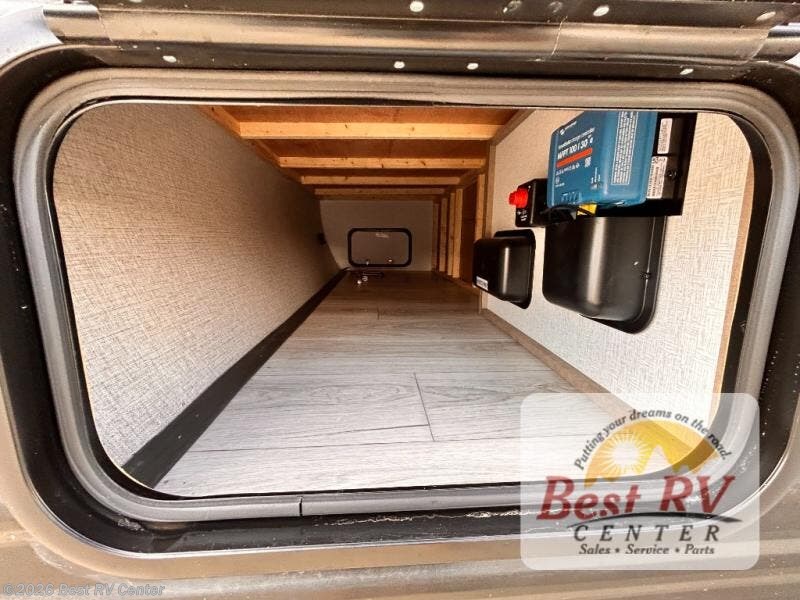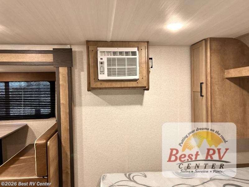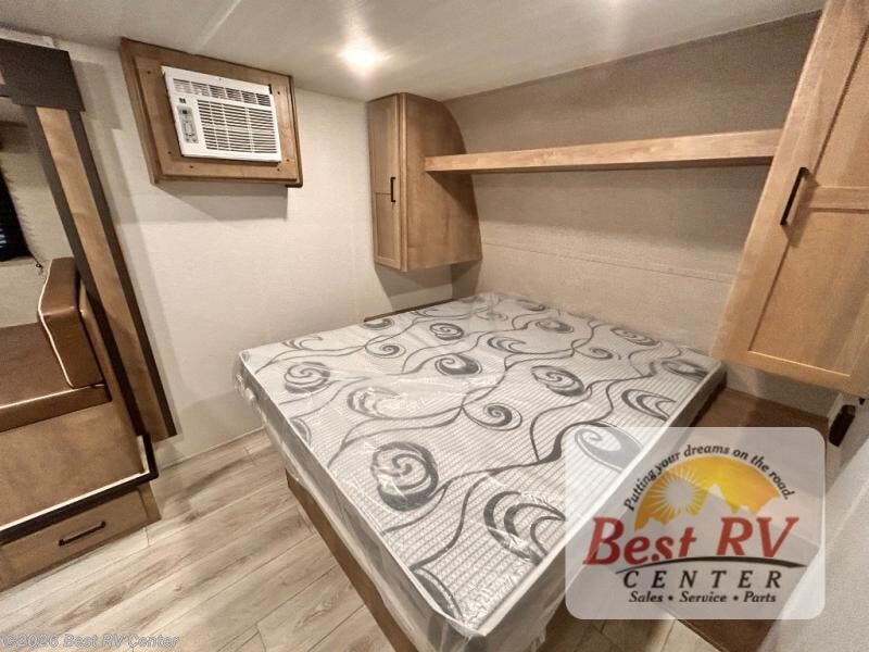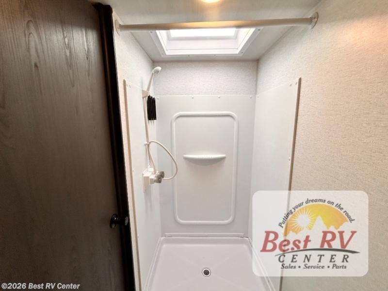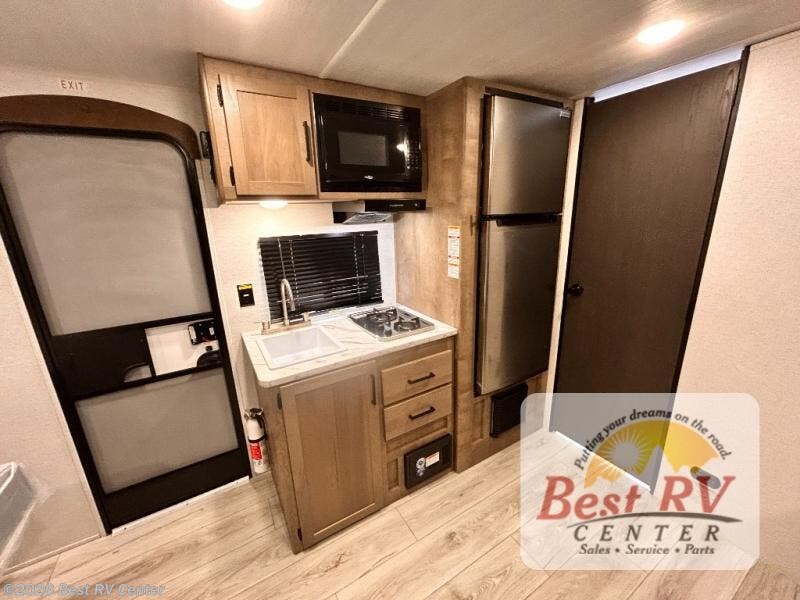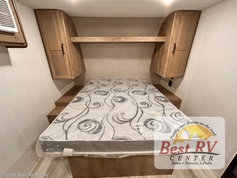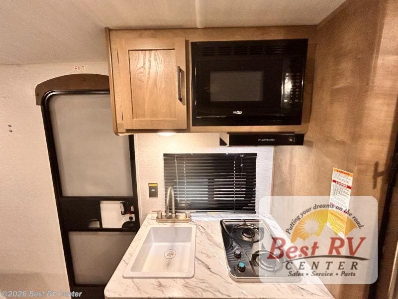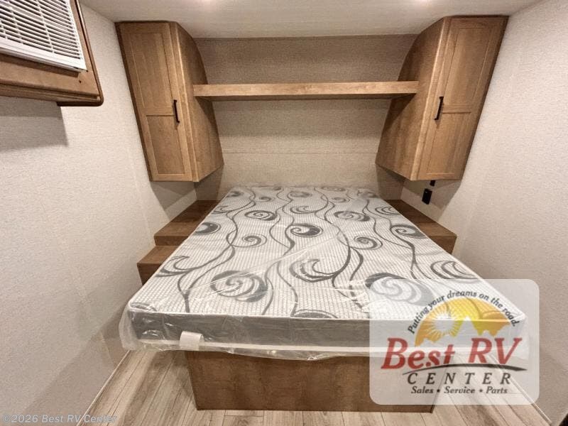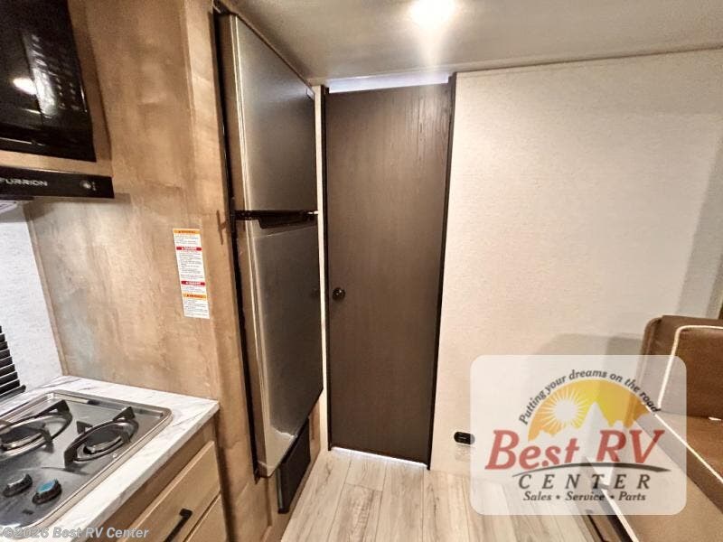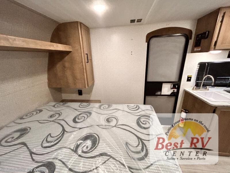 This is the perfect couple's RV with a walk-around queen bed up front with dual closets and nightstands, and a spacious rear bathroom. The galley kitchen offers a two burner cooktop and a sink to wash the dishes, plus there is a 7.7 cu. ft. 12V refrigerator for the cold items. You two can dine at the booth dinette slide which offers more floor space, plus there is drawer storage for your hand towels, pots and/or blankets. The 10' power awning provides protection so you can sit on your camping chairs while enjoying the outdoors.