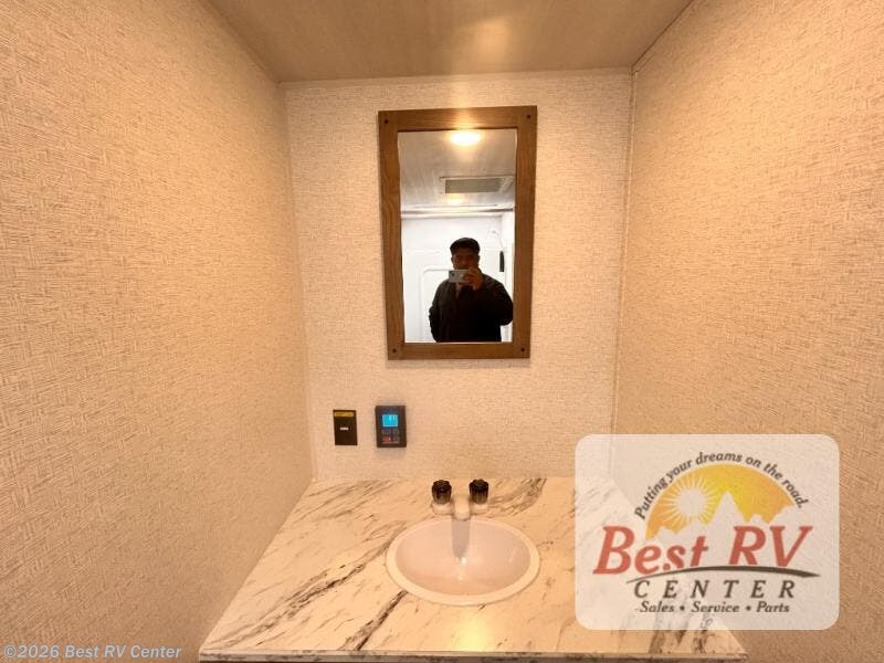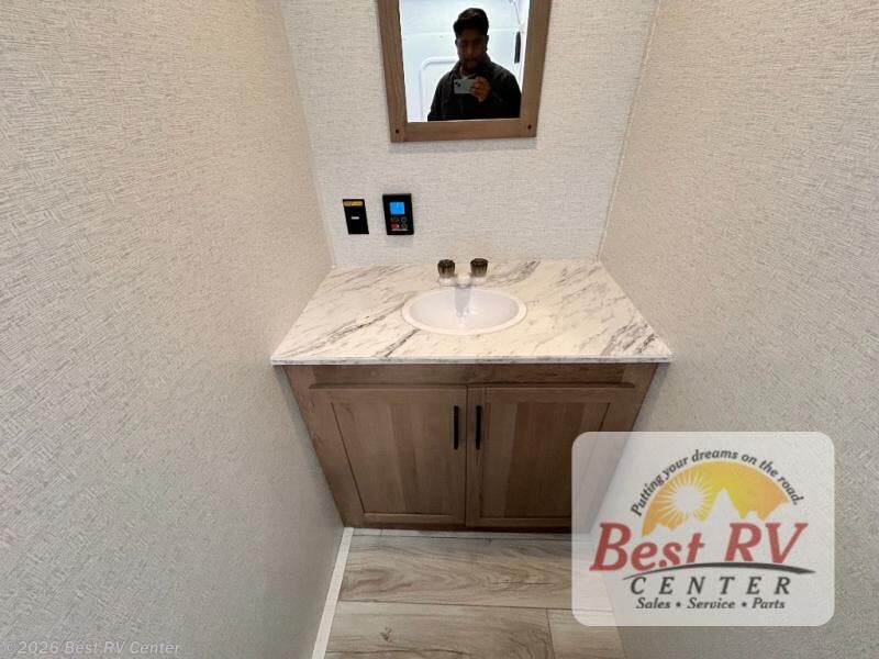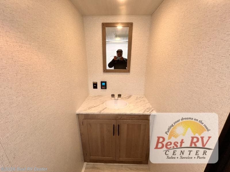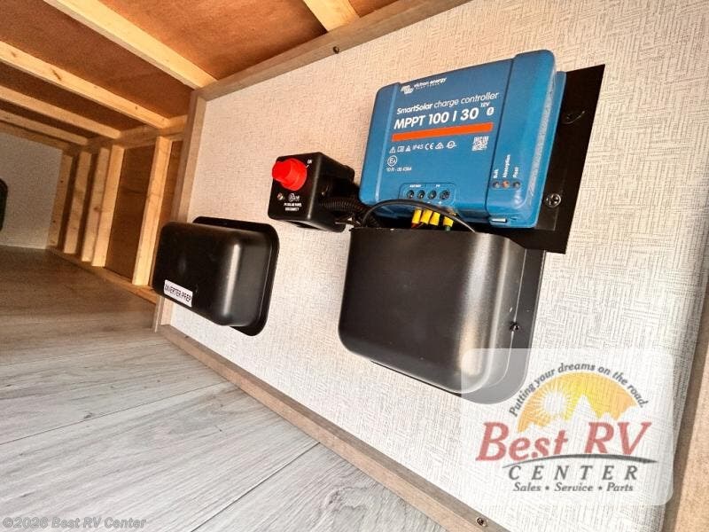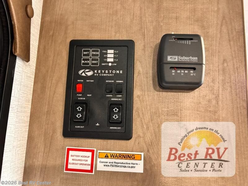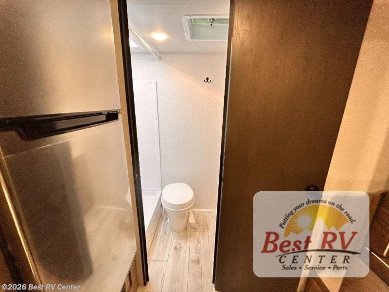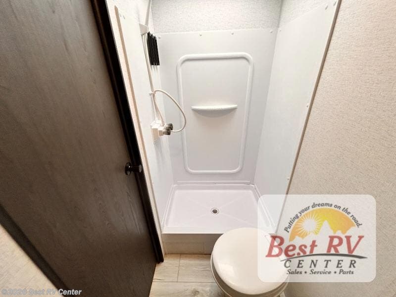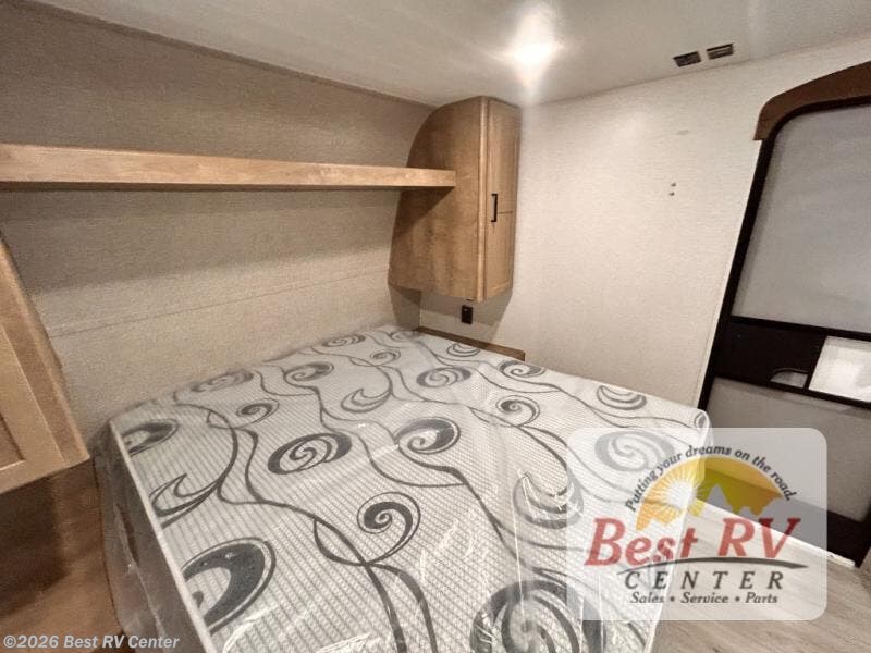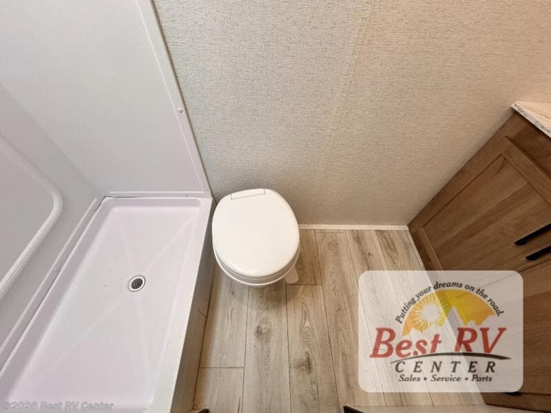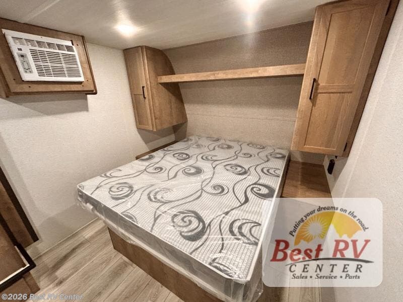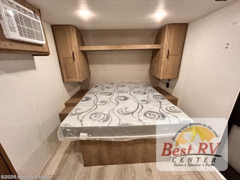 This is the perfect couple's RV with a walk-around queen bed up front with dual closets and nightstands, and a spacious rear bathroom. The galley kitchen offers a two burner cooktop and a sink to wash the dishes, plus there is a 7.7 cu. ft. 12V refrigerator for the cold items. You two can dine at the booth dinette slide which offers more floor space, plus there is drawer storage for your hand towels, pots and/or blankets. The 10' power awning provides protection so you can sit on your camping chairs while enjoying the outdoors.