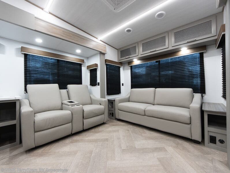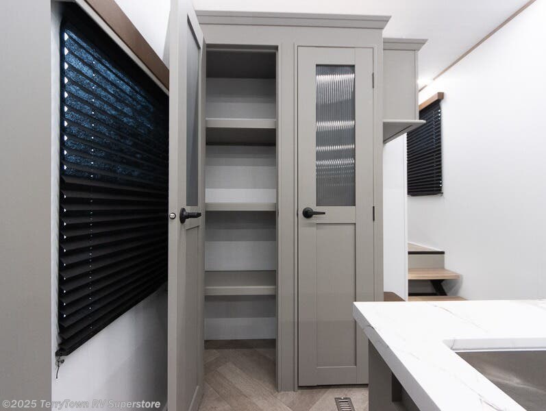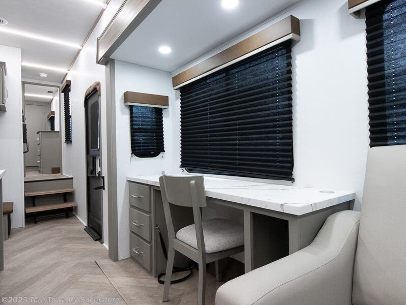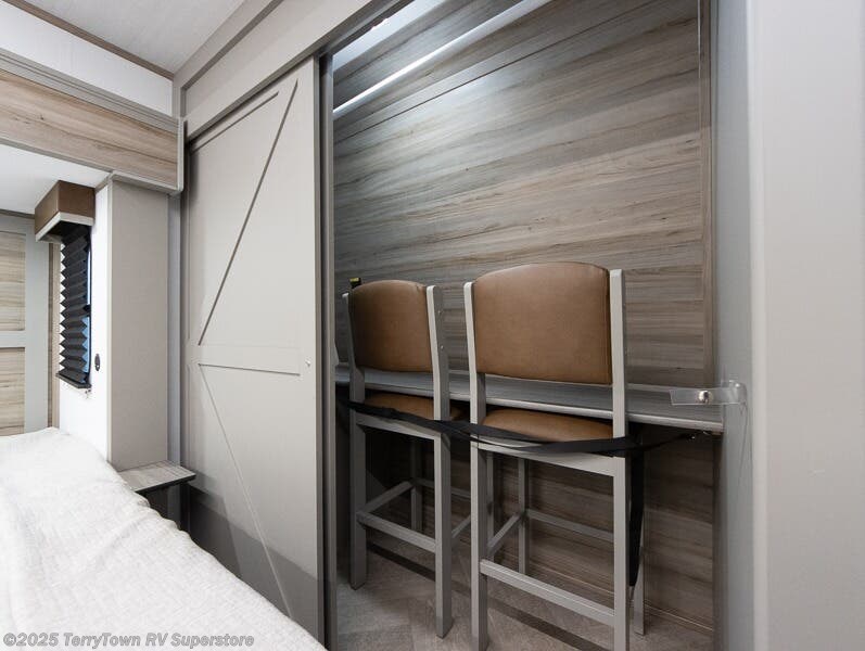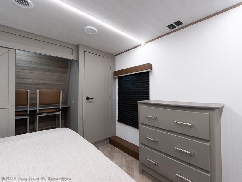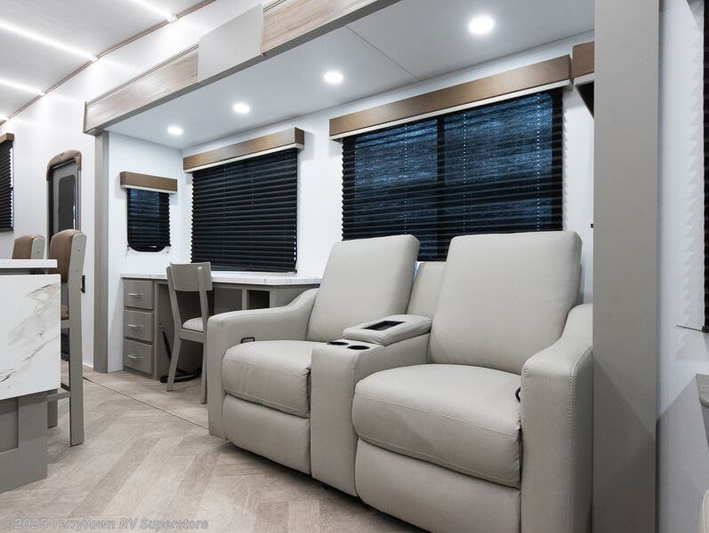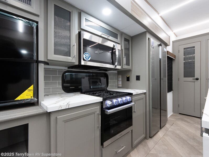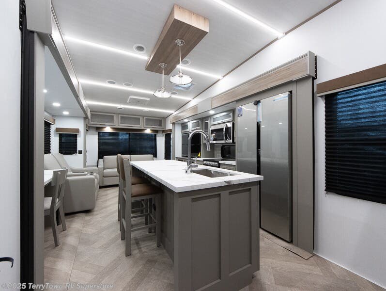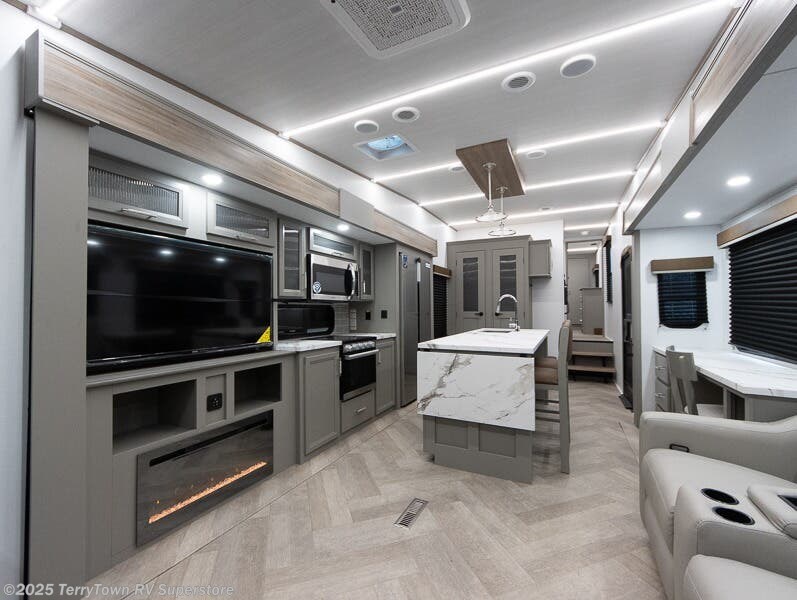 It will be so easy to enjoy camping trips or extended stays in this spacious fifth wheel! There are dual opposing slides in the combined kitchen and living area, giving you plenty of space to relax on the full reclining theater seating across from the fireplace and 50" TV. There is also a desk with drawers and a chair where you can get some work done if needed. The chef of your group will love the 7' kitchen island and double door pantry for dry goods, snacks and more. Your guests can sleep on the rear sofa, while you take the front private bedroom with a king bed slide out. You can keep your things organized in the dresser, wardrobe, and linen closet with stackable washer and dryer prep.