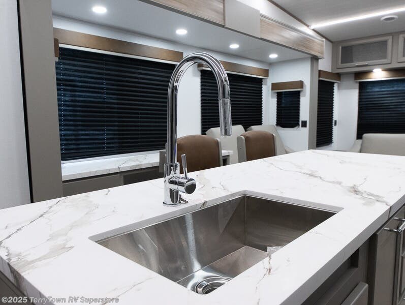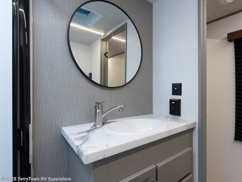 The Sprinter fifth wheels by Keystone feature spacious living areas, plenty of storage, and outstanding towability. Each unit is constructed with 2" aluminum framed and laminated sidewalls, a fully walkable roof, and dual layer insulation to help extend your camping season. The heated pass-through storage includes lockable slam latch baggage doors so you can easily pack your gear, and the one-touch 4-point leveling system features return hookup memory to have you set up in no-time. Head inside to find Congoleum vinyl flooring, Thomas Payne luxury collection furniture, residential style seamless marbled countertops, and an upgraded bedspread to name a few comforts. The Sprinter also includes a Girard tankless on-demand water heater, a central command center, plus a 30k BTU furnace and two A/C units to ensure your comfort!