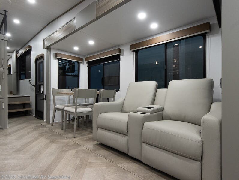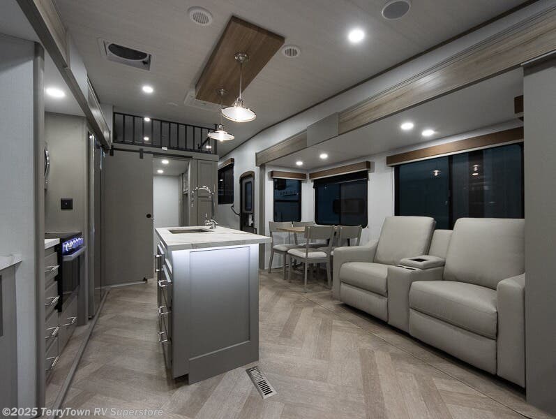 This unit not only has a king-size bed up front in a private bedroom, but it also has a second bedroom with a queen-size tri-fold sofa, making it perfect to invite friends along. Above this second bedroom you'll also have more sleeping space in a loft with storage, and another tired camper can sleep on the 72" sofa out in the main living area. The kitchen offers you an island for more room while cooking and a pantry for your snacks. Sit down and eat a hot meal at the booth dinette with hinged storage access, and get even more comfortable on the full-reclining theater seating with massage, lights, and USB.