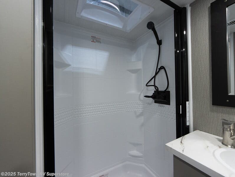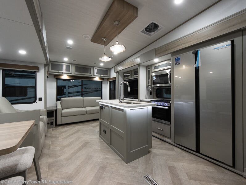 The Sprinter fifth wheels by Keystone feature spacious living areas, plenty of storage, and outstanding towability. Each unit is constructed with 2" aluminum framed and laminated sidewalls, a fully walkable roof, and dual layer insulation to help extend your camping season. The heated pass-through storage includes lockable slam latch baggage doors so you can easily pack your gear, and the one-touch 4-point leveling system features return hookup memory to have you set up in no-time. Head inside to find Congoleum vinyl flooring, Thomas Payne luxury collection furniture, residential style seamless marbled countertops, and an upgraded bedspread to name a few comforts. The Sprinter also includes a Girard tankless on-demand water heater, a central command center, plus a 30k BTU furnace and two A/C units to ensure your comfort!