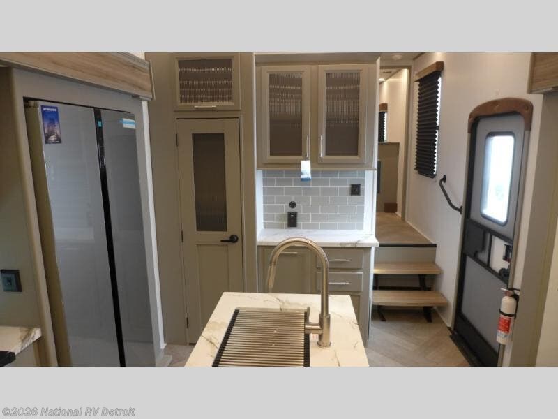 The Sprinter fifth wheels by Keystone feature spacious living areas, plenty of storage, and outstanding towability. Each unit is constructed with 2" aluminum framed and laminated sidewalls, a fully walkable roof, and dual layer insulation to help extend your camping season. The heated pass-through storage includes lockable slam latch baggage doors so you can easily pack your gear, and the one-touch 4-point leveling system features return hookup memory to have you set up in no-time. Head inside to find Congoleum vinyl flooring, Thomas Payne luxury collection furniture, residential style seamless marbled countertops, and an upgraded bedspread to name a few comforts. The Sprinter also includes a Girard tankless on-demand water heater, a central command center, plus a 30k BTU furnace and two A/C units to ensure your comfort!