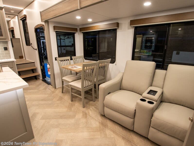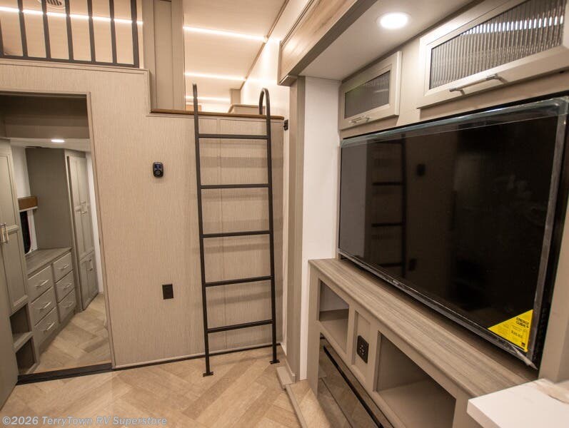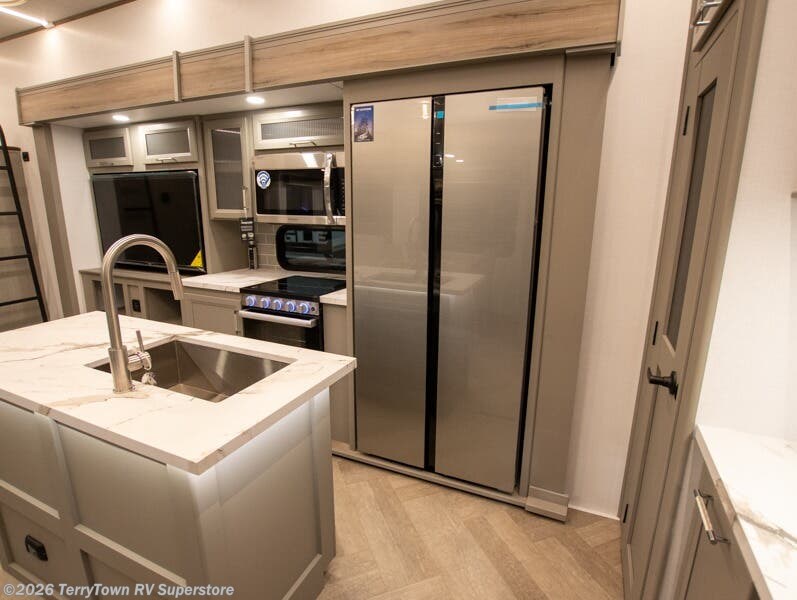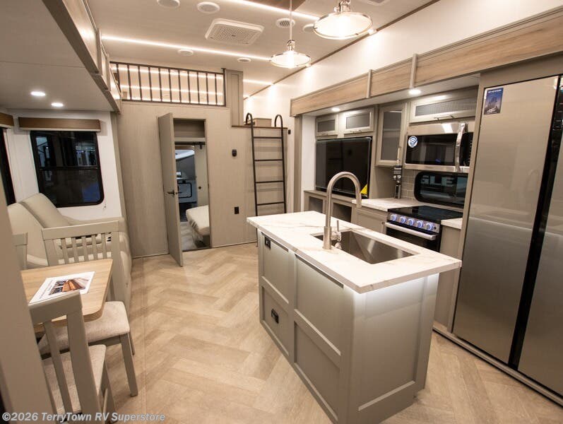 Two bedrooms and two full baths make this fifth wheel perfect for camping with friends and family! The front bedroom includes a king bed slide out with storage underneath, a wardrobe with a shelf, plus a closet with washer and dryer prep if you want to add these appliances. The master suite includes a second king bed slide out, dual wardrobes and a dresser, plus a full rear bath with one of the dual entry doors. There is also a loft area above this room with plenty of space, an entertainment/gaming center, and a ladder. Everyone can meet in the main living area to relax on the theater seating or dine at the booth dinette. And a full kitchen is complete with an island, pantry, 16 cu. ft. 12V refrigerator, and a hutch to name a few convenient features!