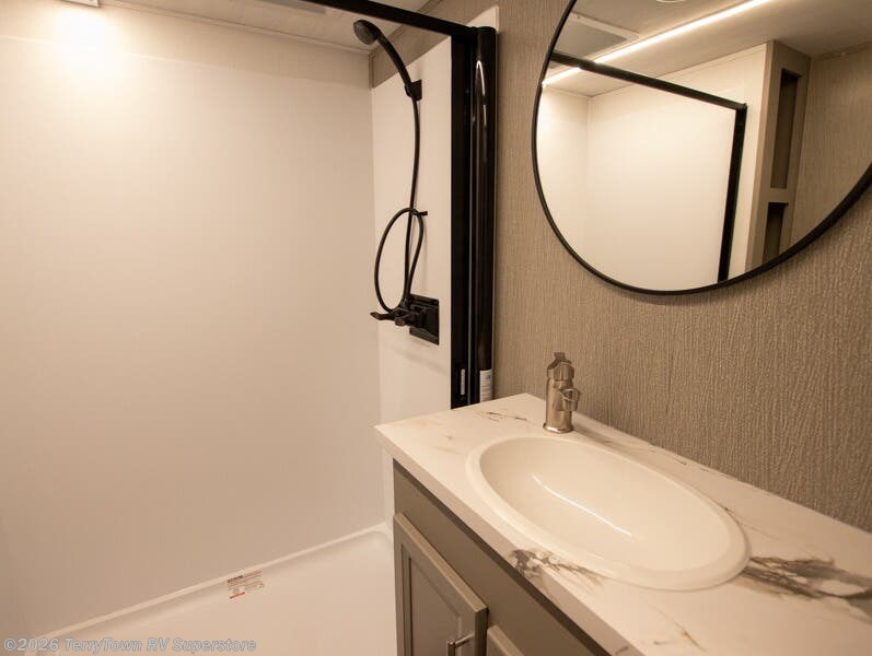 The Sprinter fifth wheels by Keystone feature spacious living areas, plenty of storage, and outstanding towability. Each unit is constructed with 2" aluminum framed and laminated sidewalls, a fully walkable roof, and dual layer insulation to help extend your camping season. The heated pass-through storage includes lockable slam latch baggage doors so you can easily pack your gear, and the one-touch 4-point leveling system features return hookup memory to have you set up in no-time. Head inside to find Congoleum vinyl flooring, Thomas Payne luxury collection furniture, residential style seamless marbled countertops, and an upgraded bedspread to name a few comforts. The Sprinter also includes a Girard tankless on-demand water heater, a central command center, plus a 30k BTU furnace and two A/C units to ensure your comfort!