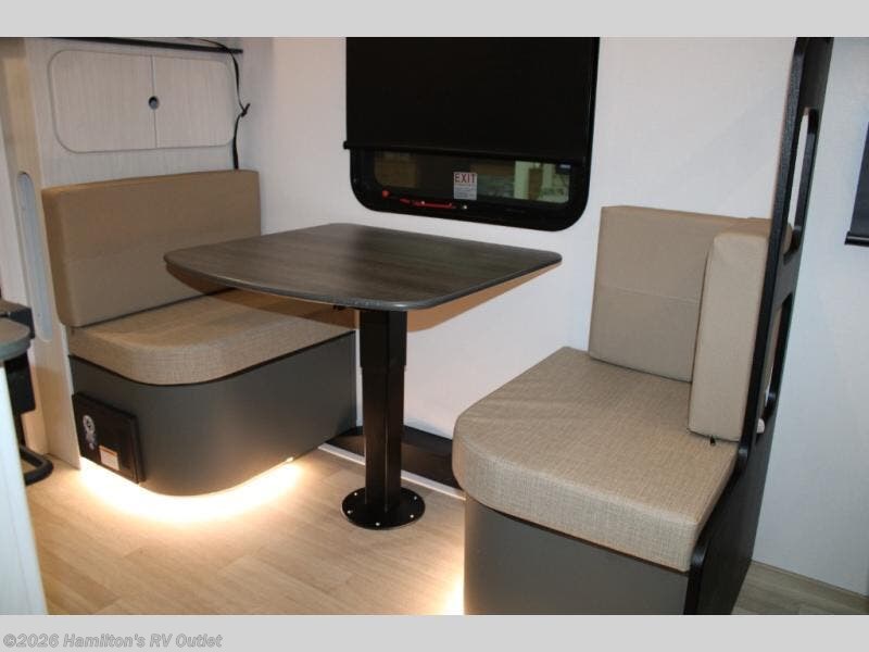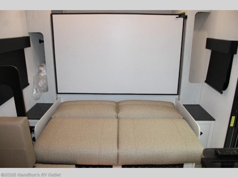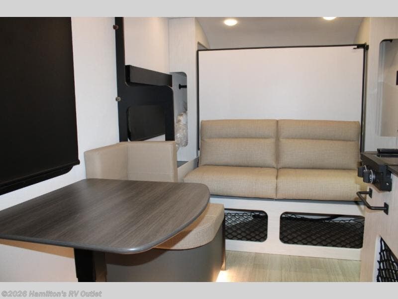 This single axle trailer is both cozy and versatile since there is a fold down sofa/Murphy bed up front! Now you can easily convert seating space into sleeping space, plus there are dual bedside closets to keep your things tidy. A two burner cooktop and air fryer/convection microwave will let you cook meals each day, and a booth dinette provides a place to dine together. You can also choose to add the optional flip-up bunk above the dinette if you need more sleeping space. And don't overlook the full rear bath that will allow you to freshen up without having to leave your camper!