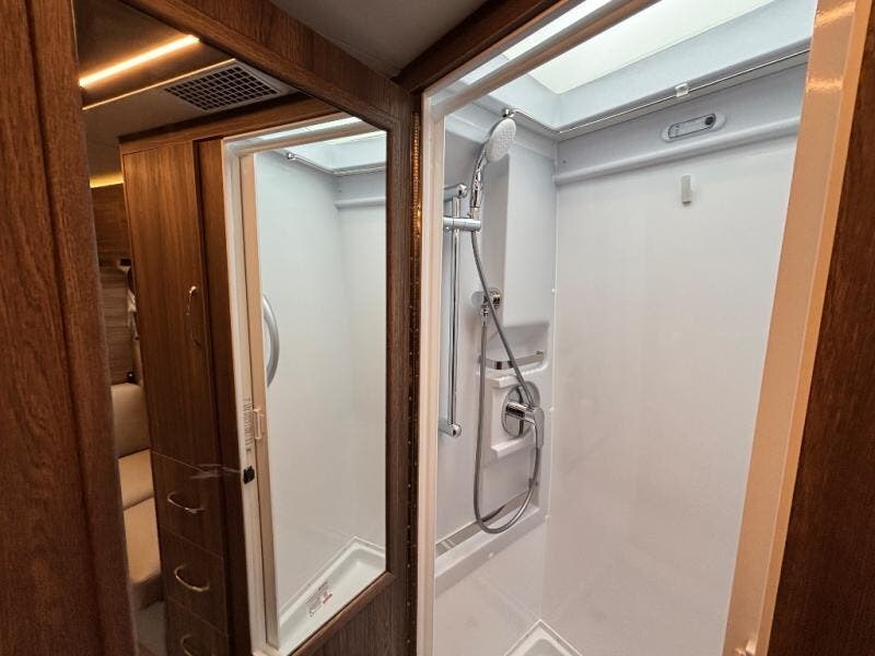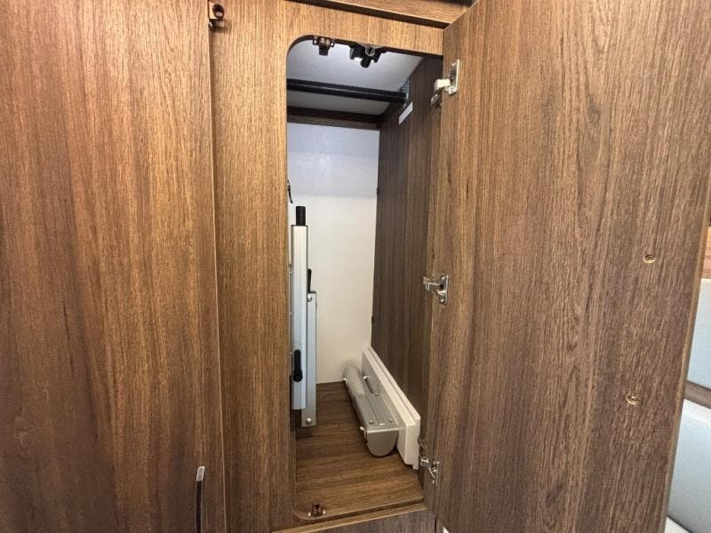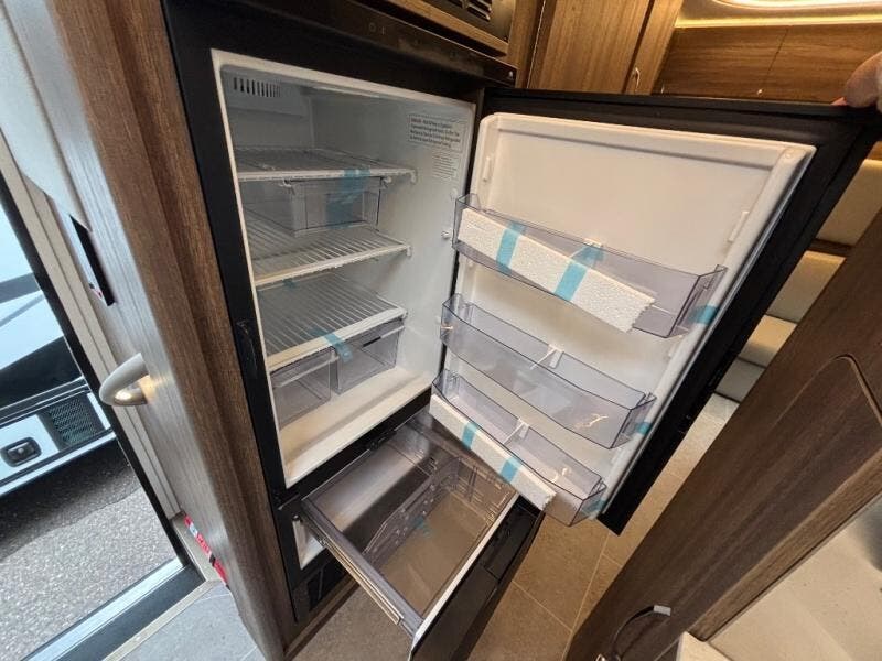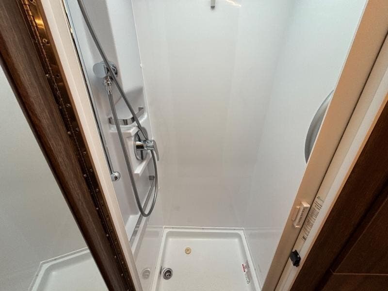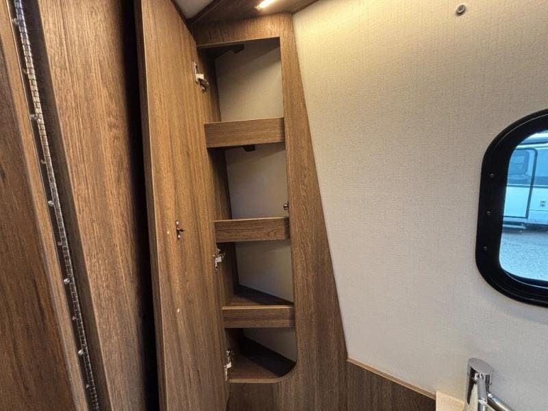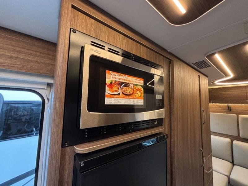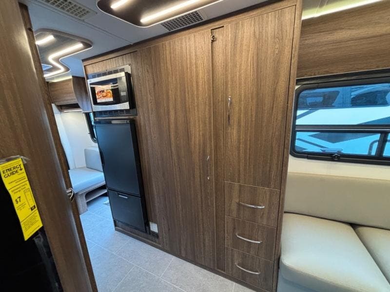 In the rear lounge, stretch out on the sofa, enjoy movie nights on the 28" Smart TV, or lower the Murphy bed when it’s time to recharge. In the morning, the bed folds neatly into the wall to reveal a spacious lounge again. A stainless-steel convection microwave, deep galley storage, and a full pull-out pantry make cooking easy wherever your travels take you.