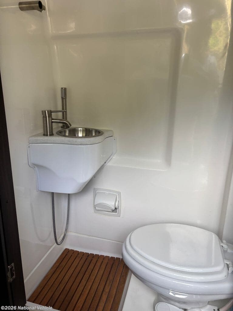 The fully equipped galley includes an induction cooktop, refrigerator, stainless steel sink, and microwave, giving you everything needed to prepare meals on the road. A convenient wet bath with shower, sink, and toilet provides the comfort and functionality of a full bathroom in a compact footprint.