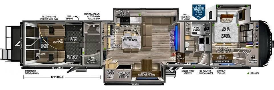 Inside, it's designed to accommodate up to 9 people with three slide-outs, a front bedroom featuring a king bed slide, a walk-in closet, and a full bathroom. Additionally, there is a half bath in the garage/loft area that can be folded away.