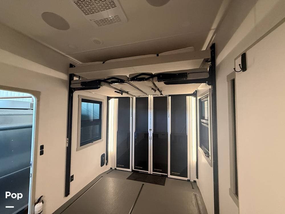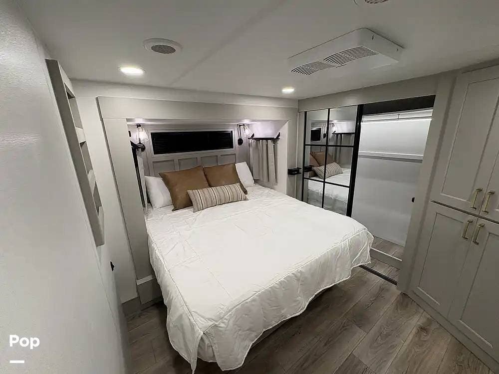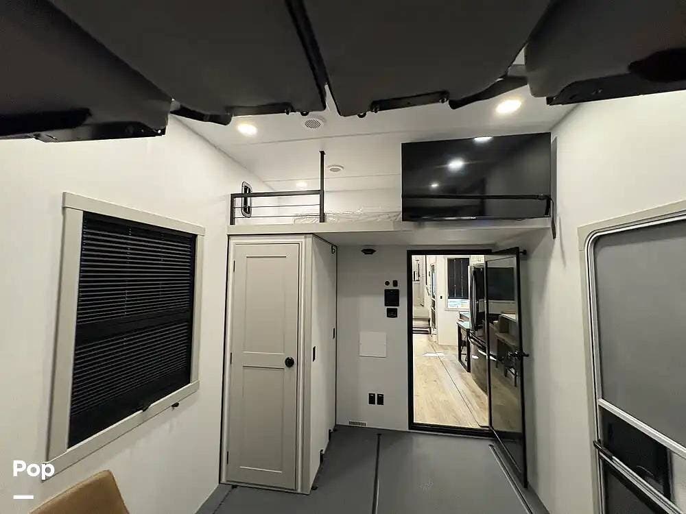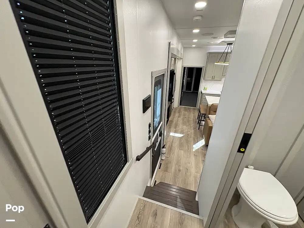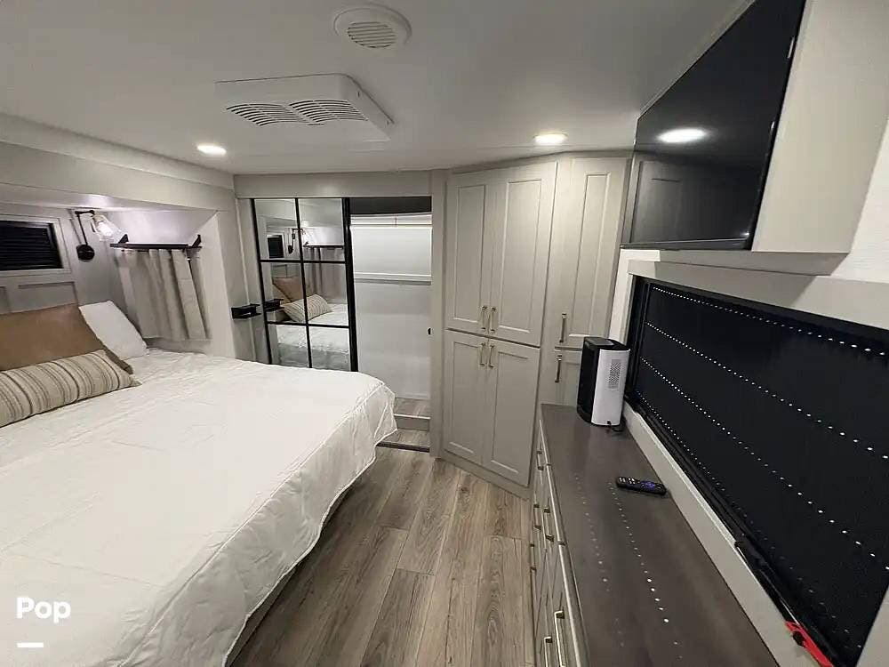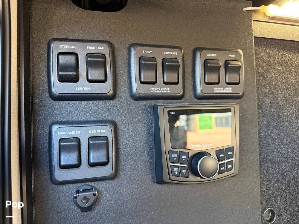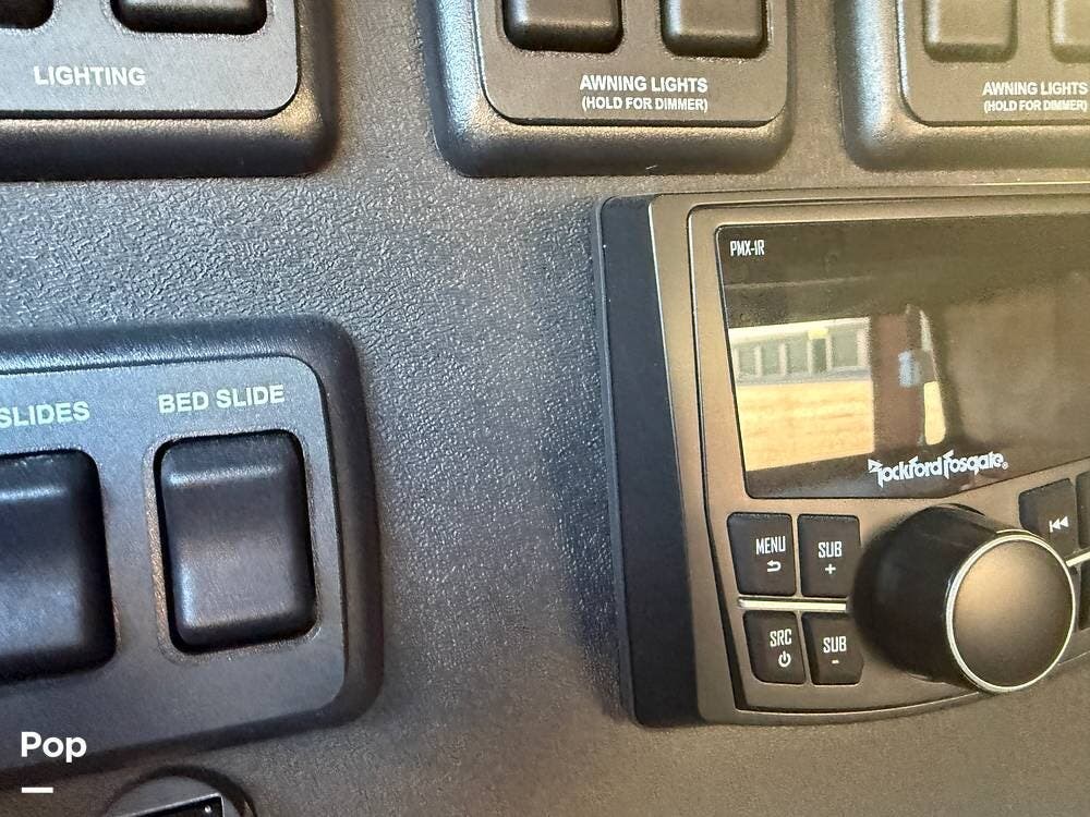 Other creature comforts include Rockford Fosgate audio throughout, motion-activated LED lighting, floating steps, integrated window screens and blackout blinds, residential-style trim, and solid construction and a low-maintenance roof.