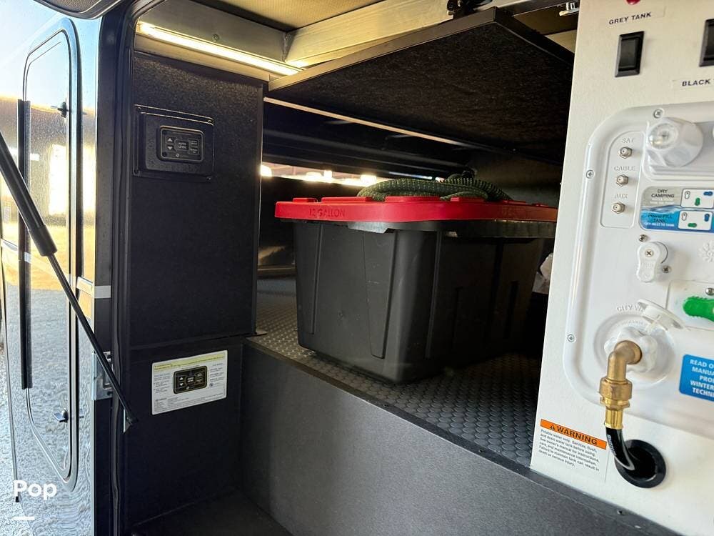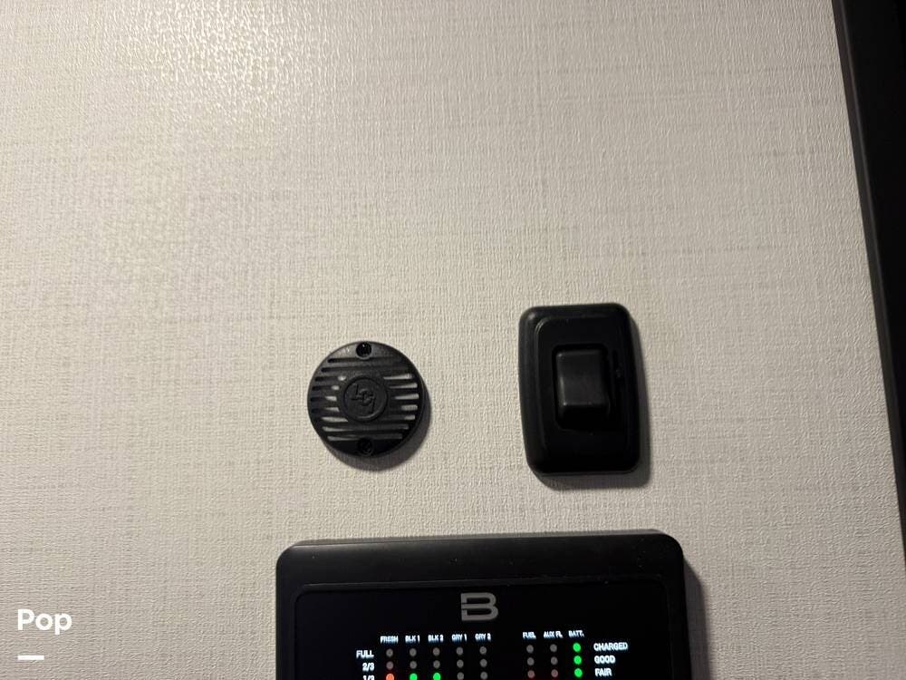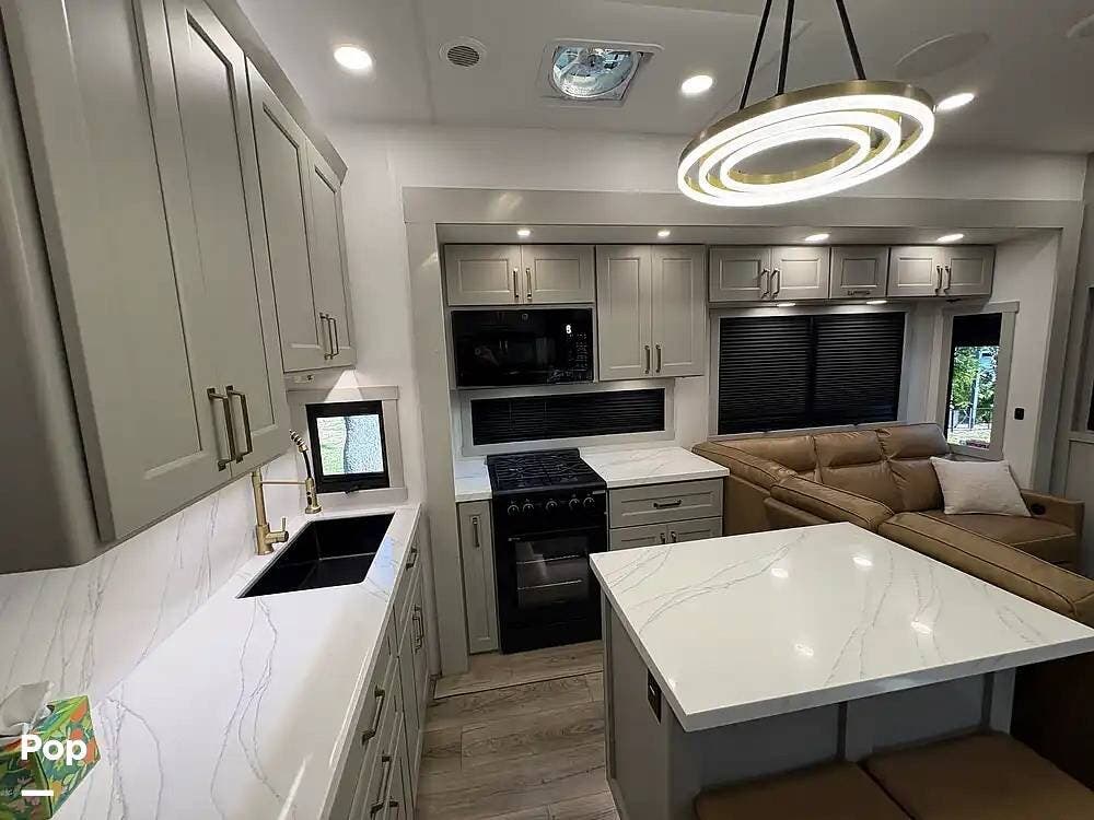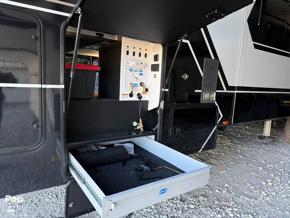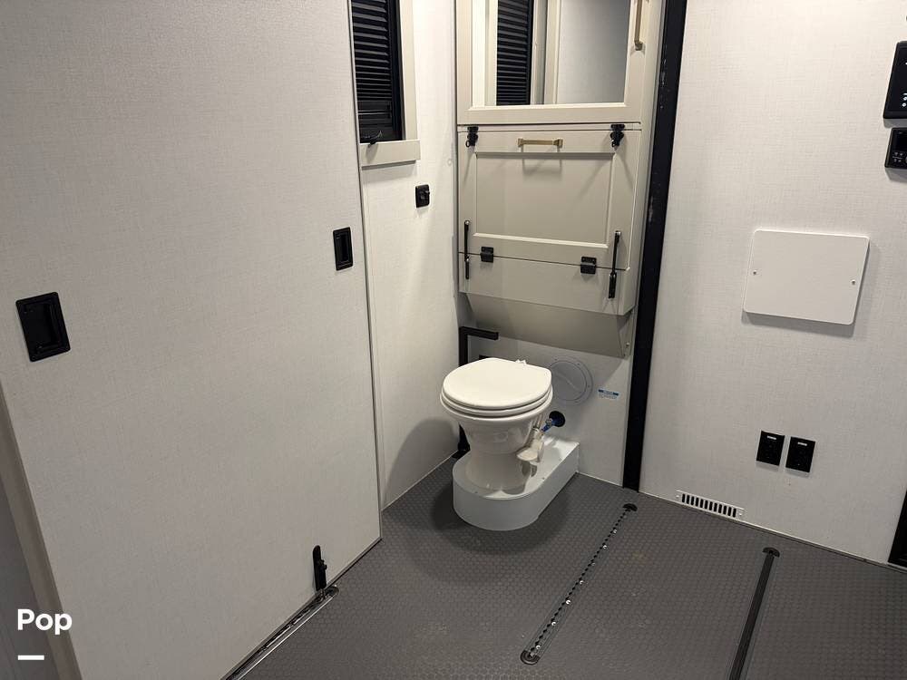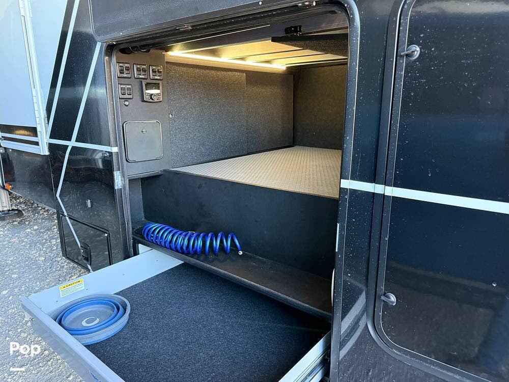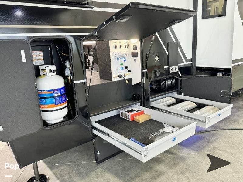 Other creature comforts include Rockford Fosgate audio throughout, motion-activated LED lighting, floating steps, integrated window screens and blackout blinds, residential-style trim, and solid construction and a low-maintenance roof.