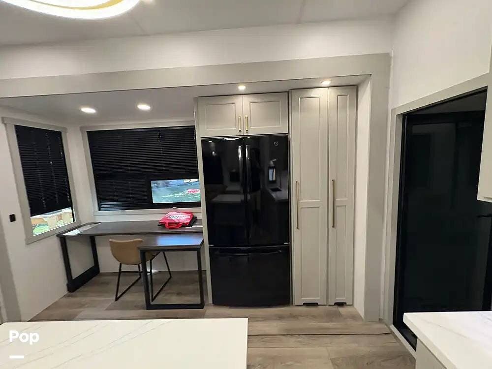 The kitchen is well-appointed: you get a 19 cu. ft. GE Energy Star refrigerator, a 24-inch oven with a four-burner range, an air fryer convection microwave, solid surface countertops, and an island with seating. There's also a convertible dining table/desk, pull-out trash bins, and hidden pet feeding bowls.