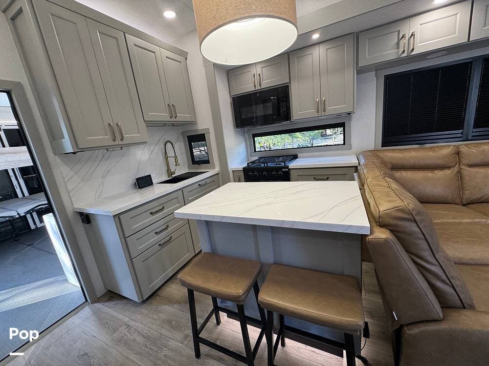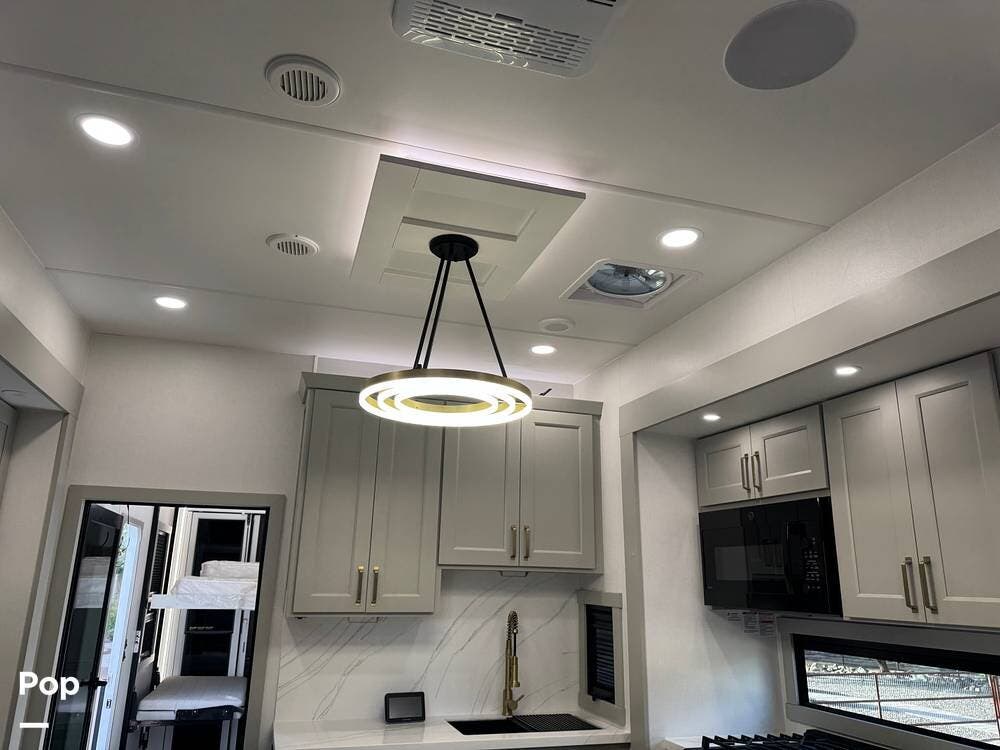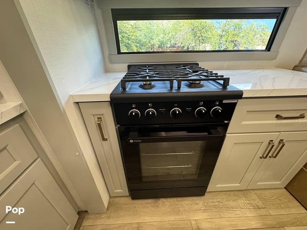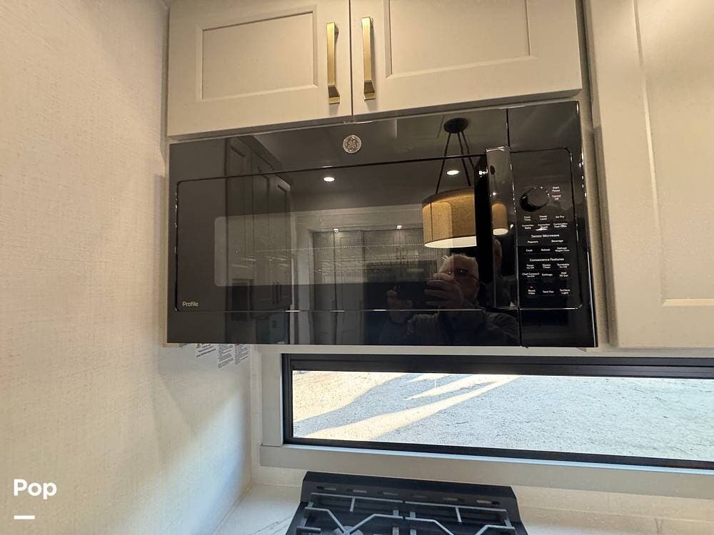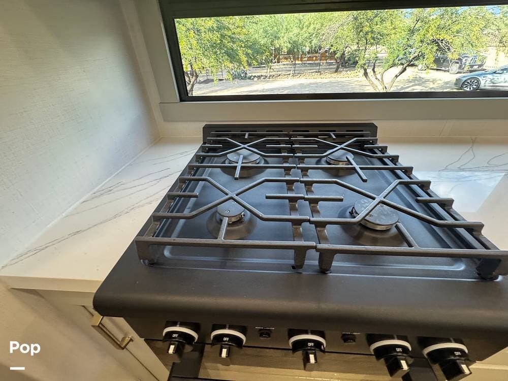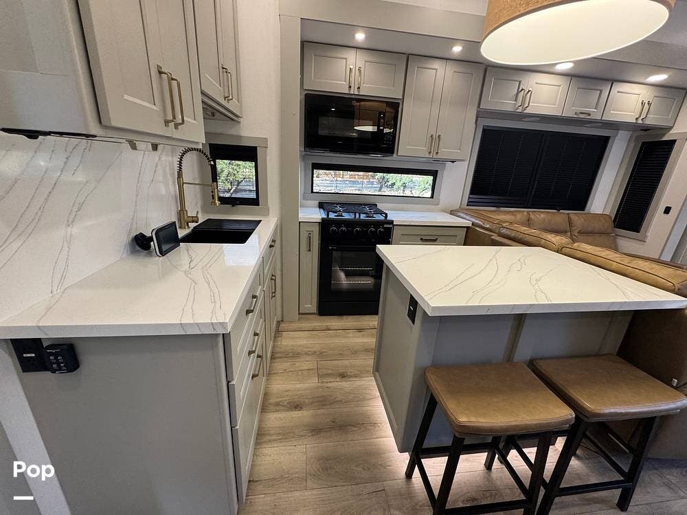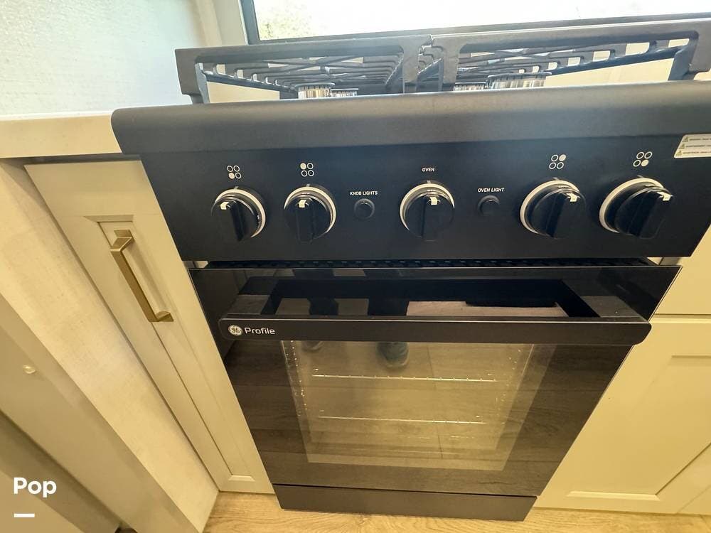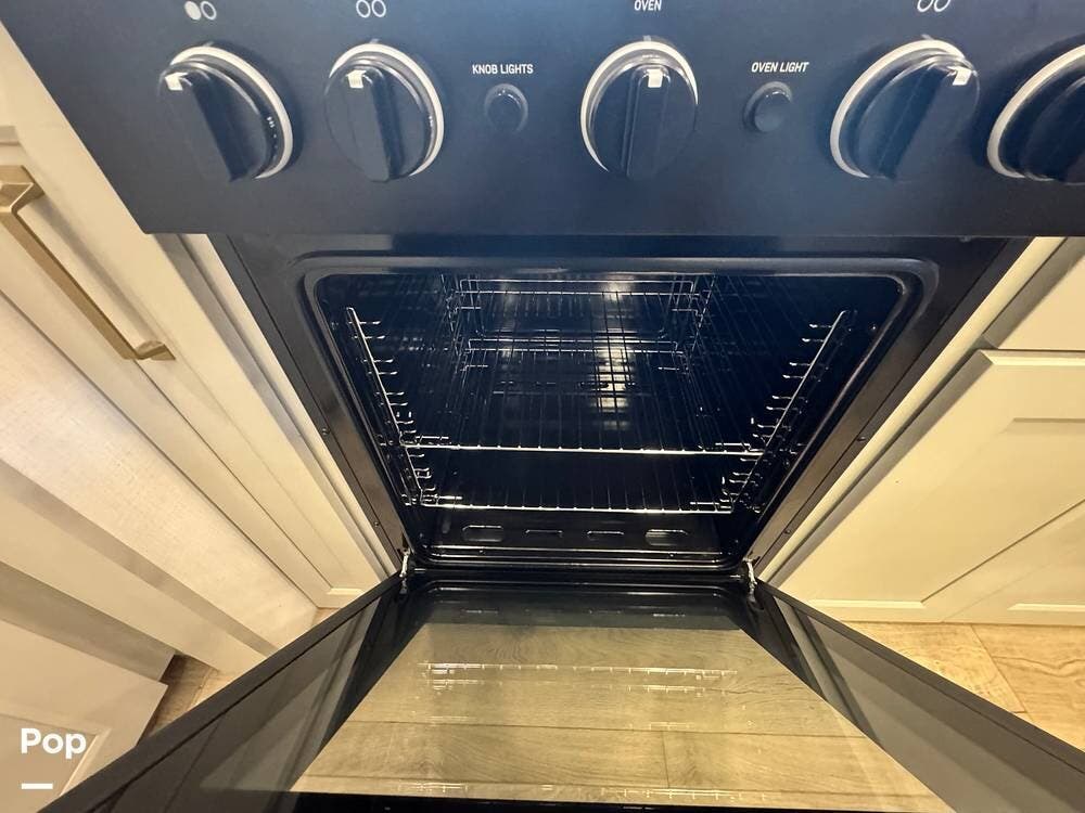 The kitchen brings real home conveniences: a 19 cu. ft. fridge (Energy Star, with ice maker and filtered water), a 4-burner cooktop with oven, convection microwave, and enough for serious meals rather than just convenience food.