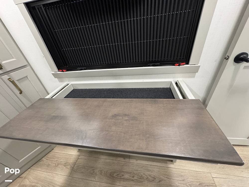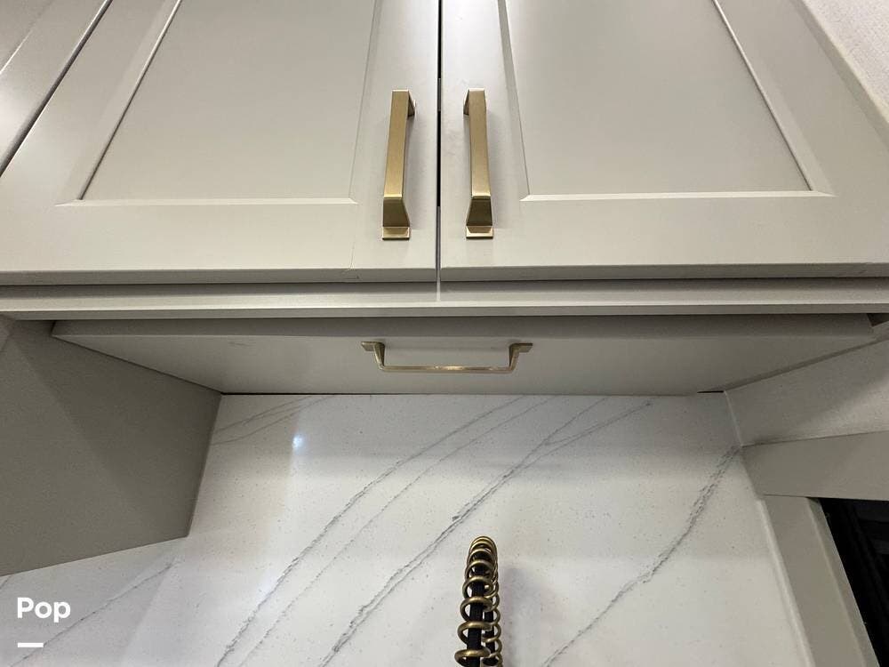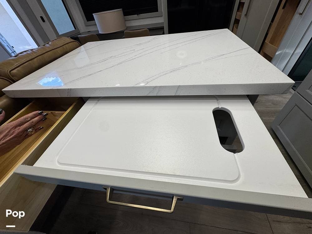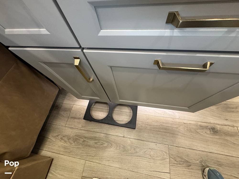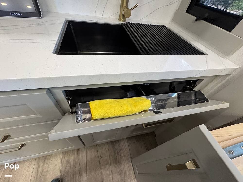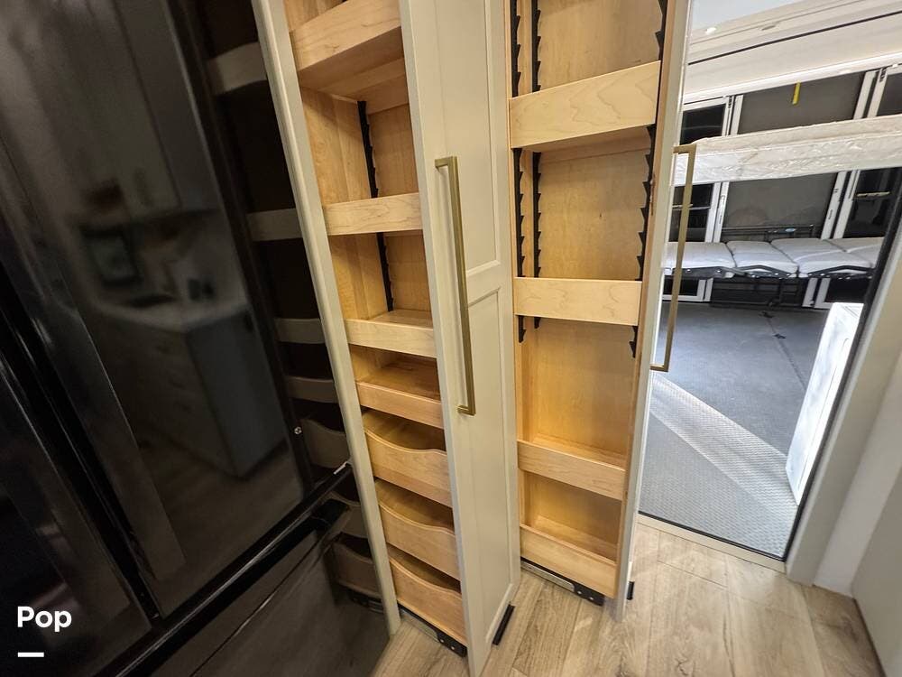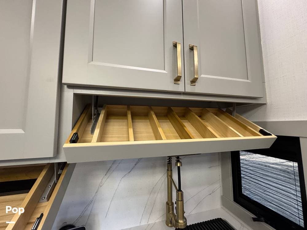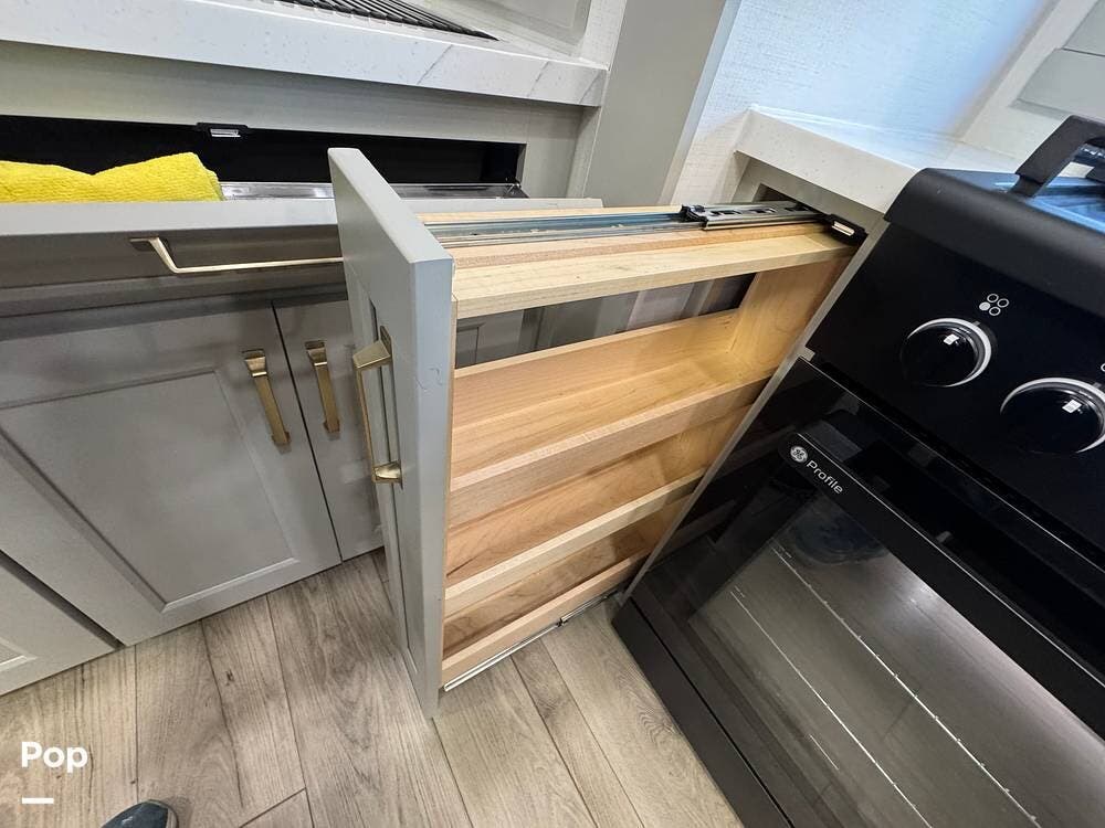 There's also smart storage: pull-down utensil trays, a magnetic knife rack, a large pantry/utility closet, adjustable drawer organizers, and even hidden pet bowls, if you're traveling with a dog.