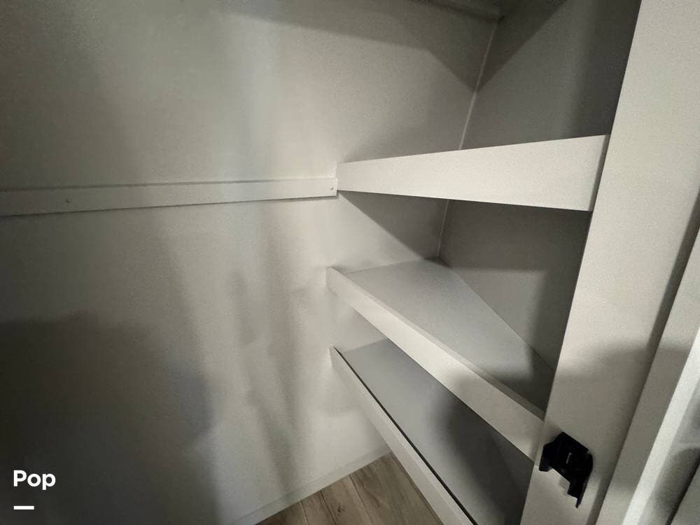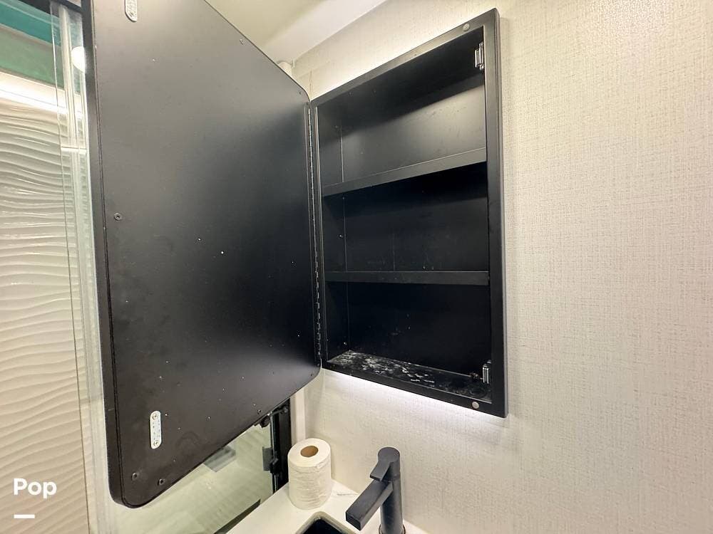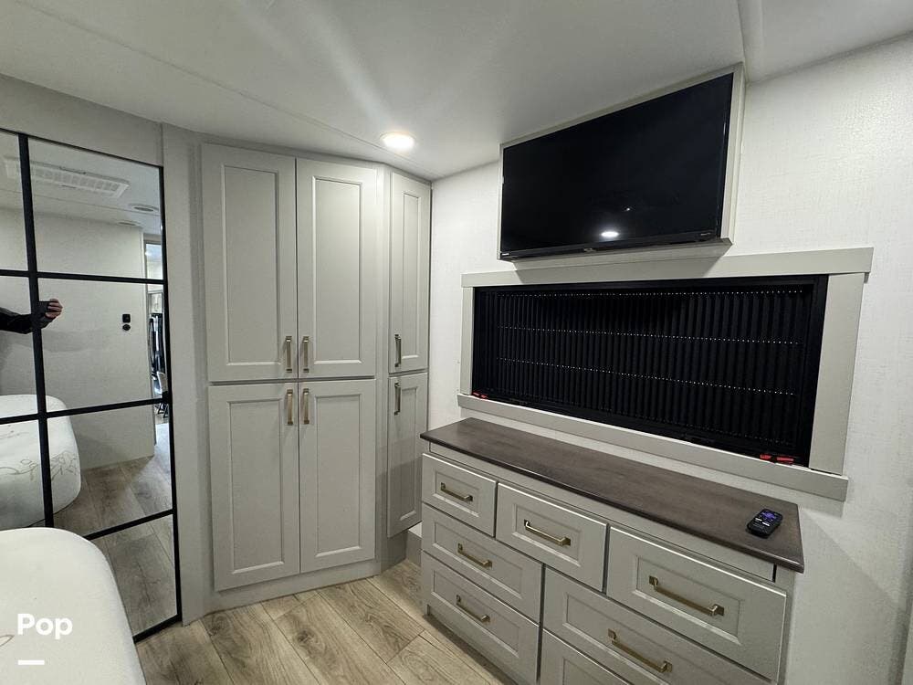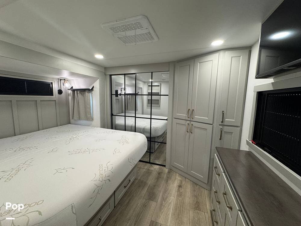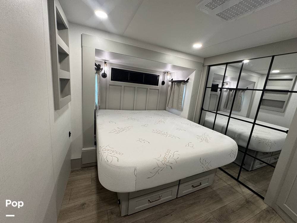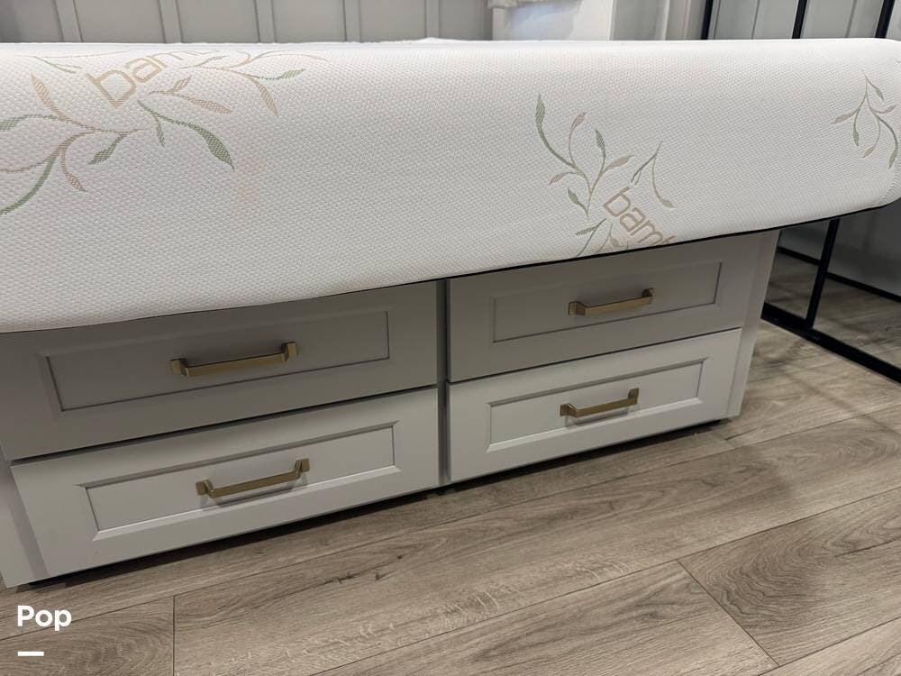 Up front, there's a king-size bed (70″ x 80″) with a 9″ memory foam mattress -- comfortable enough for full-time living or extended trips. Under-bed storage drawers, a walk-in closet with mirrored doors, a floor-to-ceiling storage cabinet, and a washer/dryer prep ensure you've got space for clothes, gear, and long-term living needs.