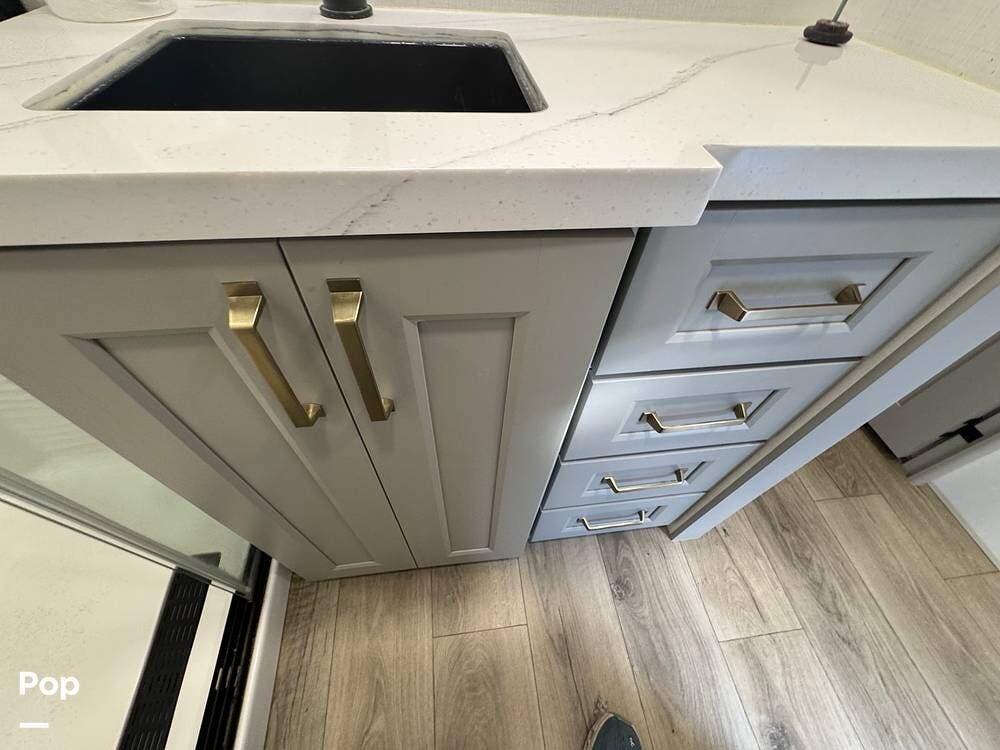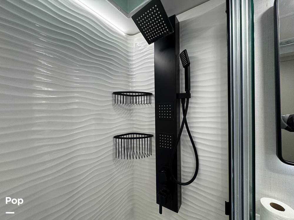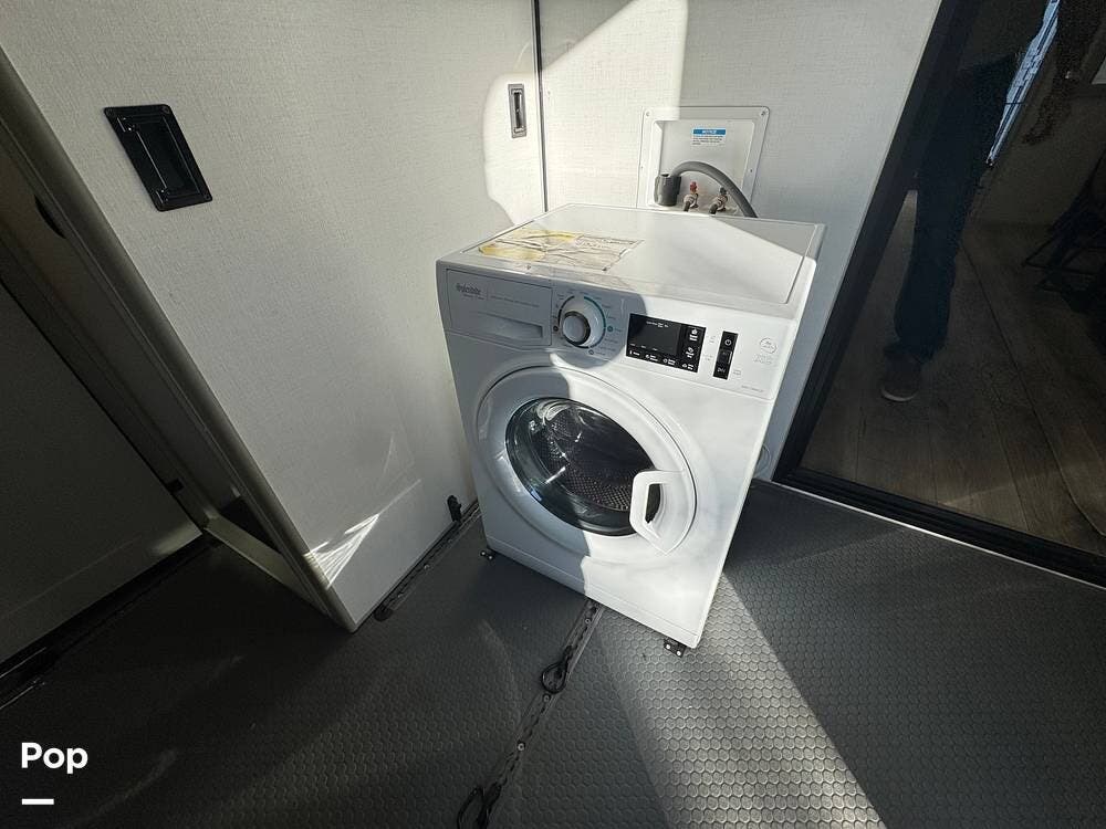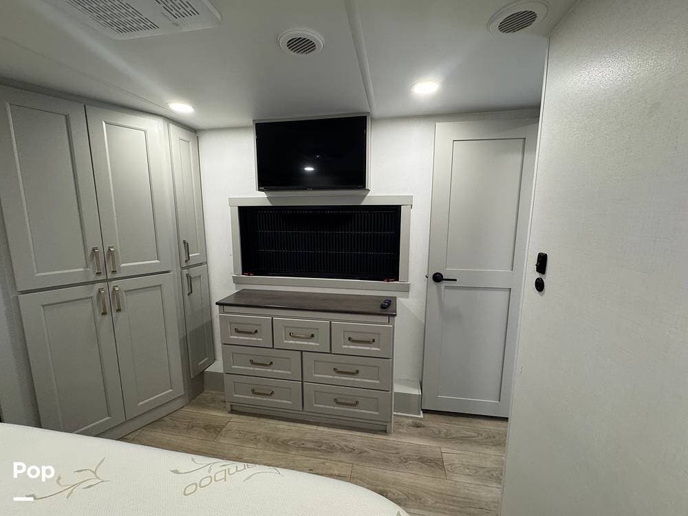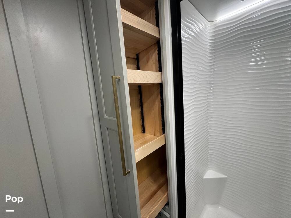 Up front, there's a king-size bed (70″ x 80″) with a 9″ memory foam mattress -- comfortable enough for full-time living or extended trips. Under-bed storage drawers, a walk-in closet with mirrored doors, a floor-to-ceiling storage cabinet, and a washer/dryer prep ensure you've got space for clothes, gear, and long-term living needs.