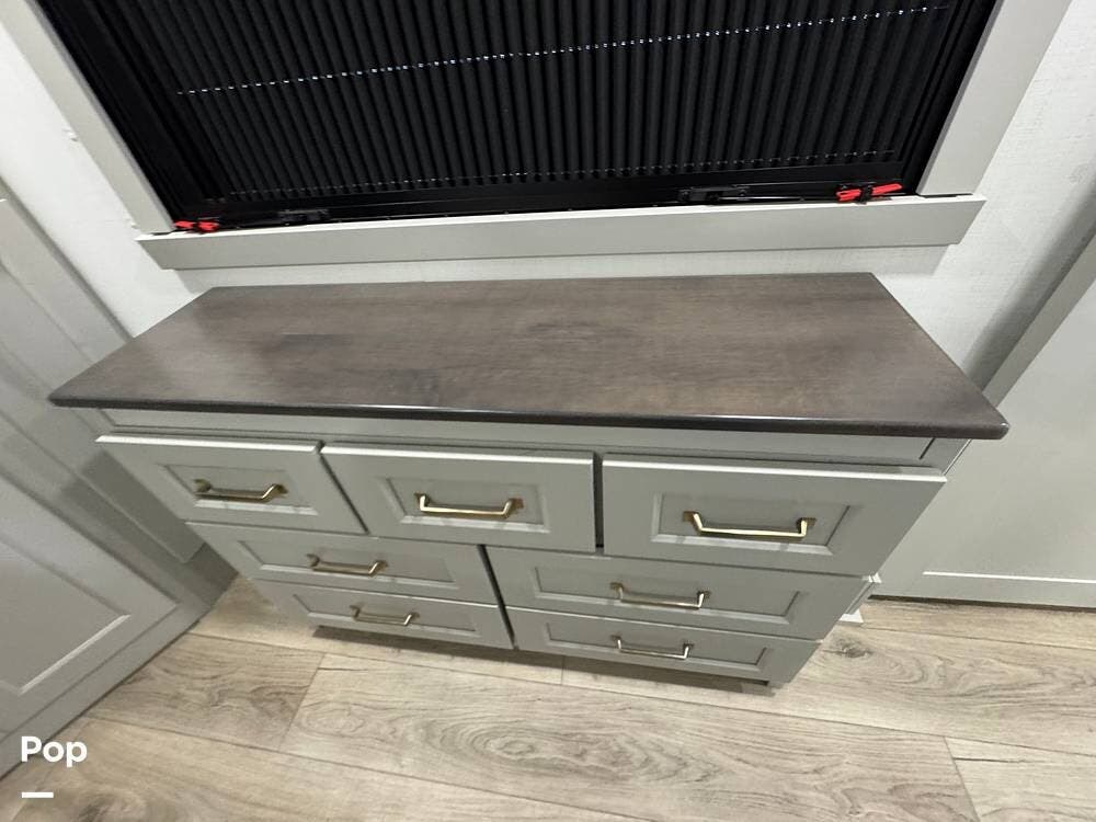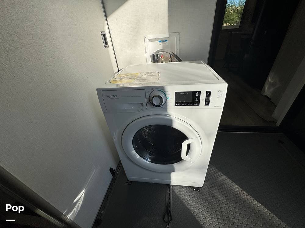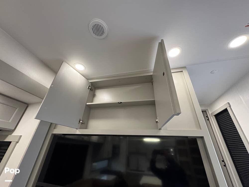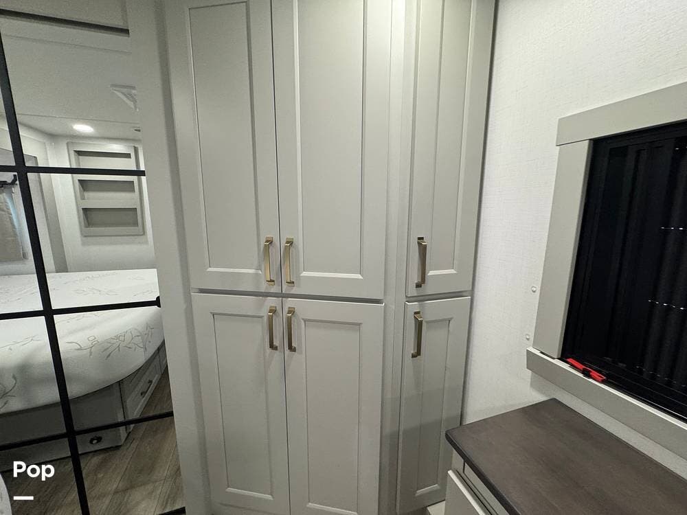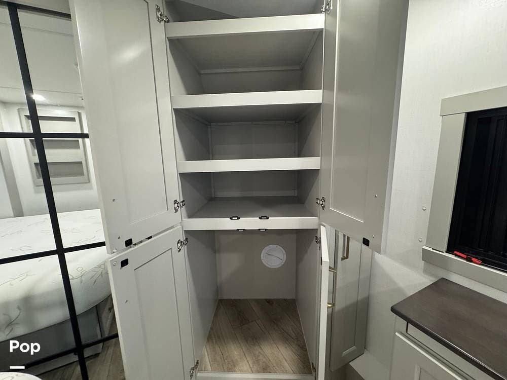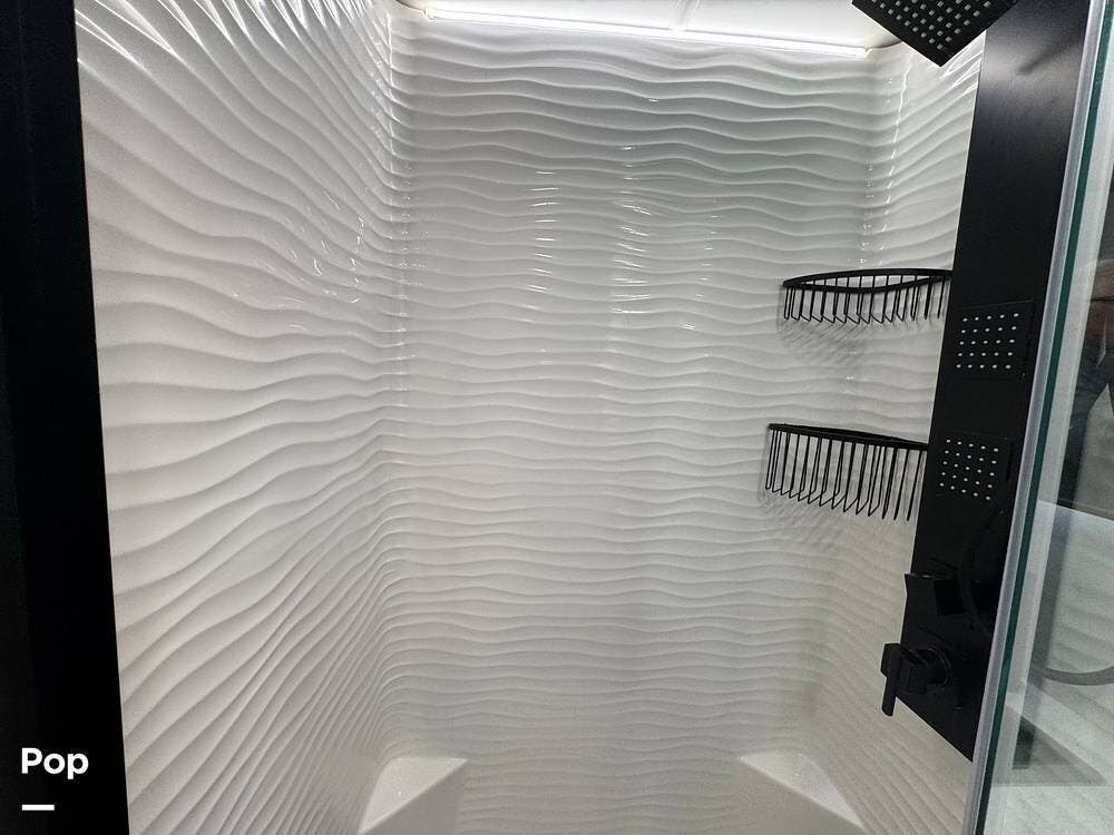 Up front, there's a king-size bed (70″ x 80″) with a 9″ memory foam mattress -- comfortable enough for full-time living or extended trips. Under-bed storage drawers, a walk-in closet with mirrored doors, a floor-to-ceiling storage cabinet, and a washer/dryer prep ensure you've got space for clothes, gear, and long-term living needs.