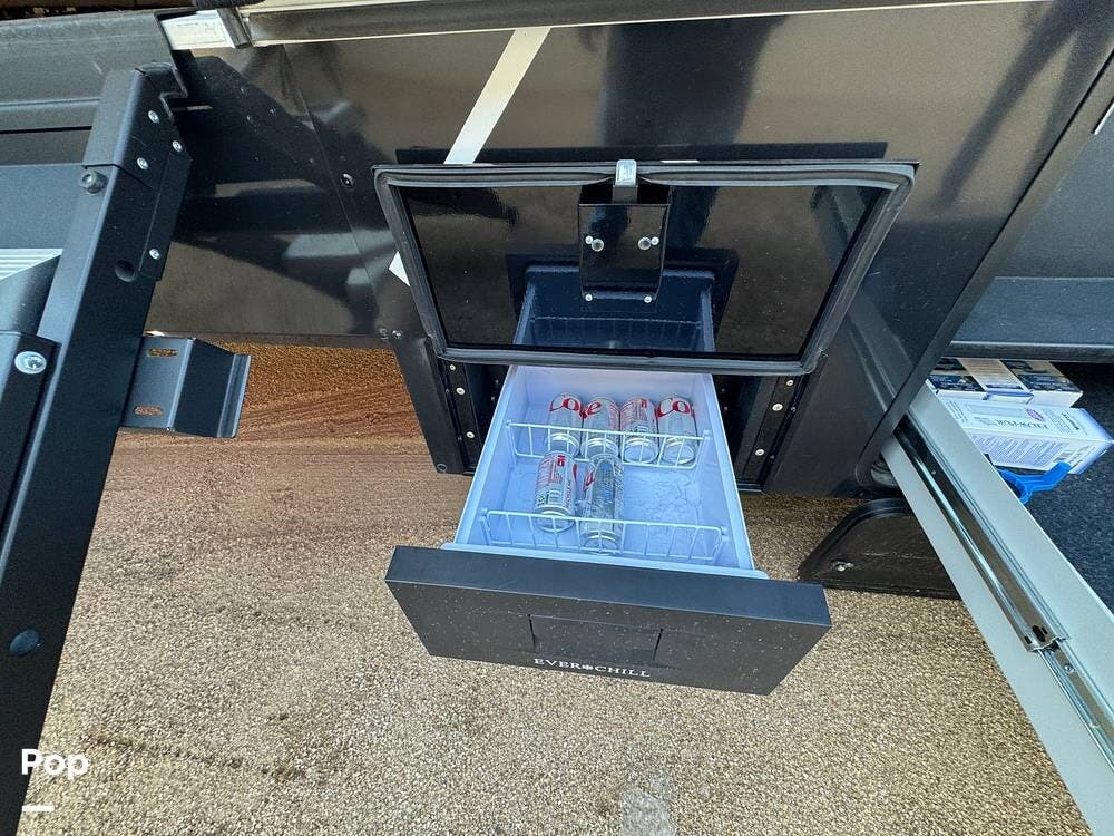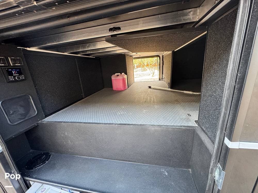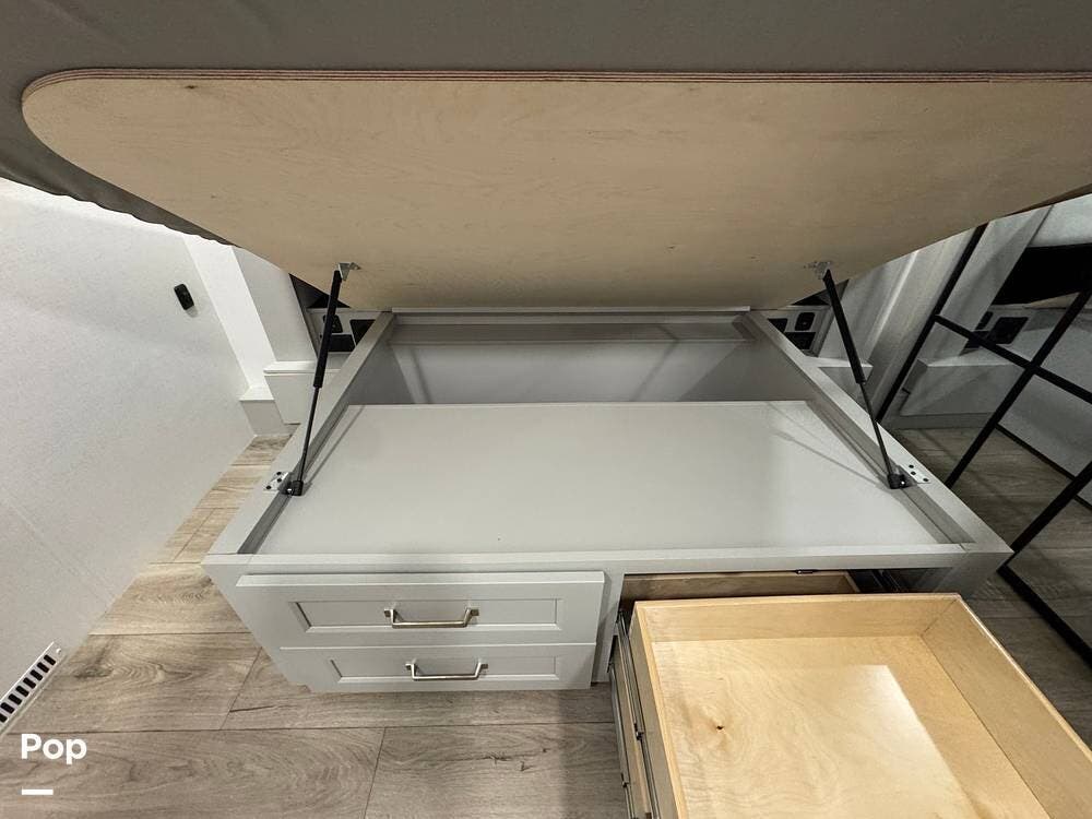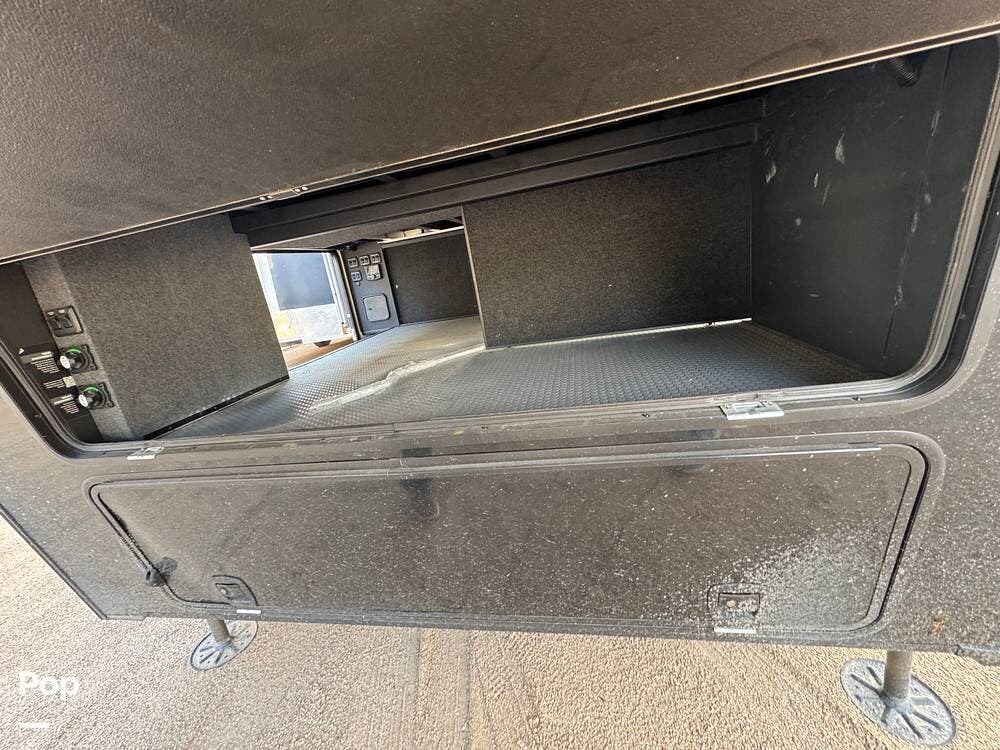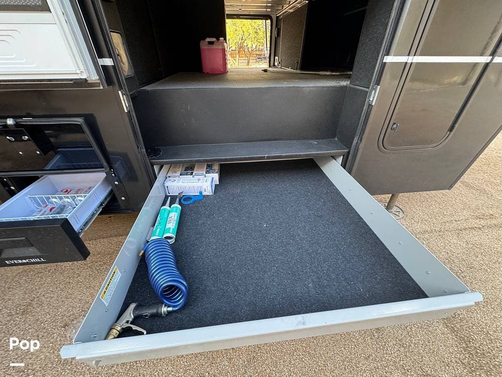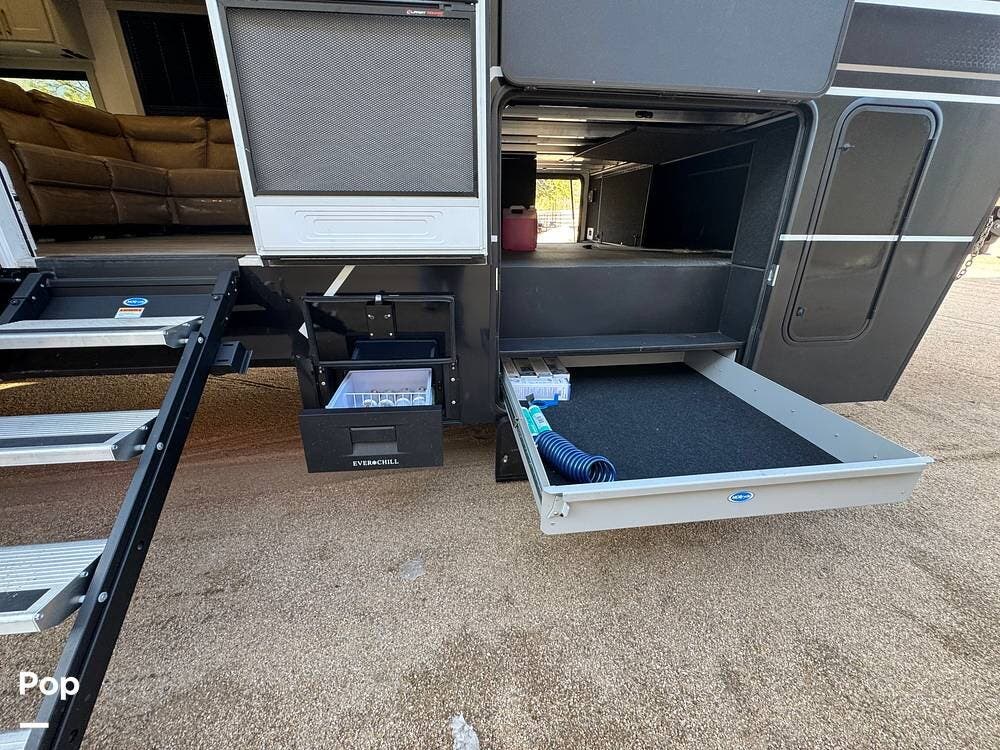 Storage and utility are on another level: deep under-I-beam compartments, massive three-way pass-through storage with flip-up bulkhead dividers, and three heavy-duty 48″ slide-out storage drawers under the frame -- each rated for ~250 lbs. Enough room for tools, gear, spare parts, and even extra supplies.