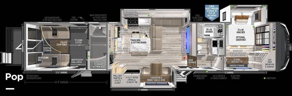 Conveniences like a built-in 60-gallon fuel/generator station, LP tanks (dual), air compressor, full holding tanks, and large power/water hookups -- all point to a design meant for rugged off-grid or remote camping without compromising comfort.