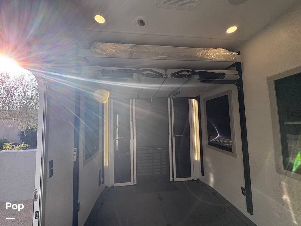 This is where the 3950 really shines as a toy hauler. The 14′ garage is not just storage -- it's equipped with an adjustable tie-down system (with recessed L-tracks), letting you secure heavy toys like ATVs, dirt bikes, and other small vehicles.