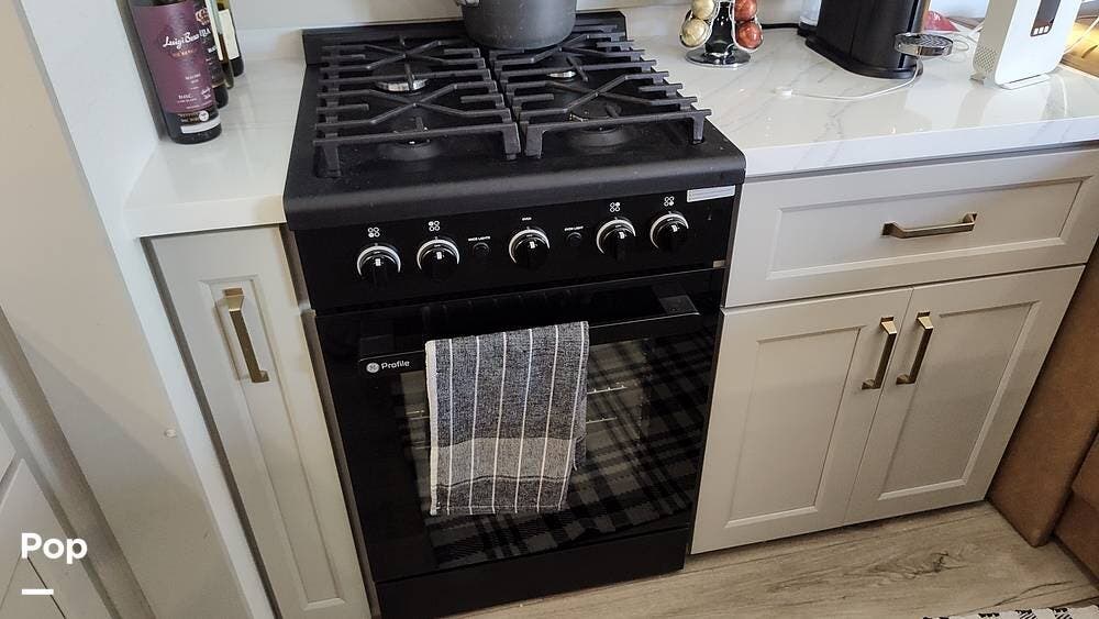 The kitchen has a full-size refrigerator, a four-burner stovetop with oven, and a microwave.