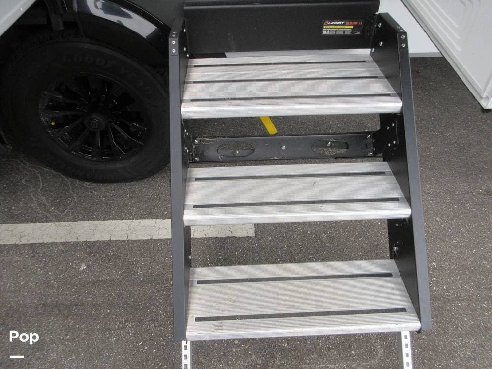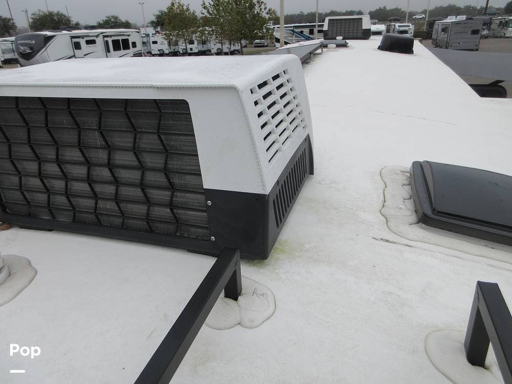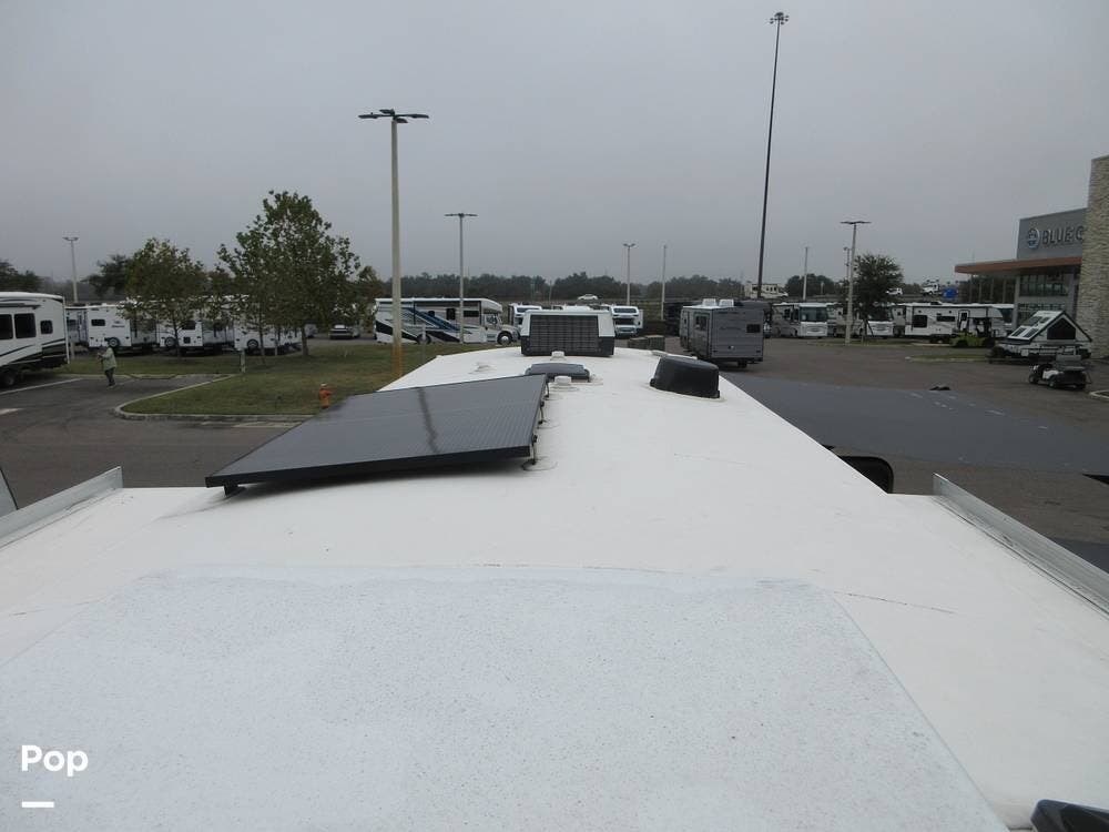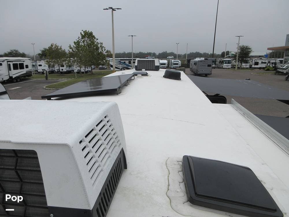 Two awnings outside and pass-through storage bins. Roof ladder and a solar panel between two A/Cs to keep you comfortable all year round. Even has a spare tire.