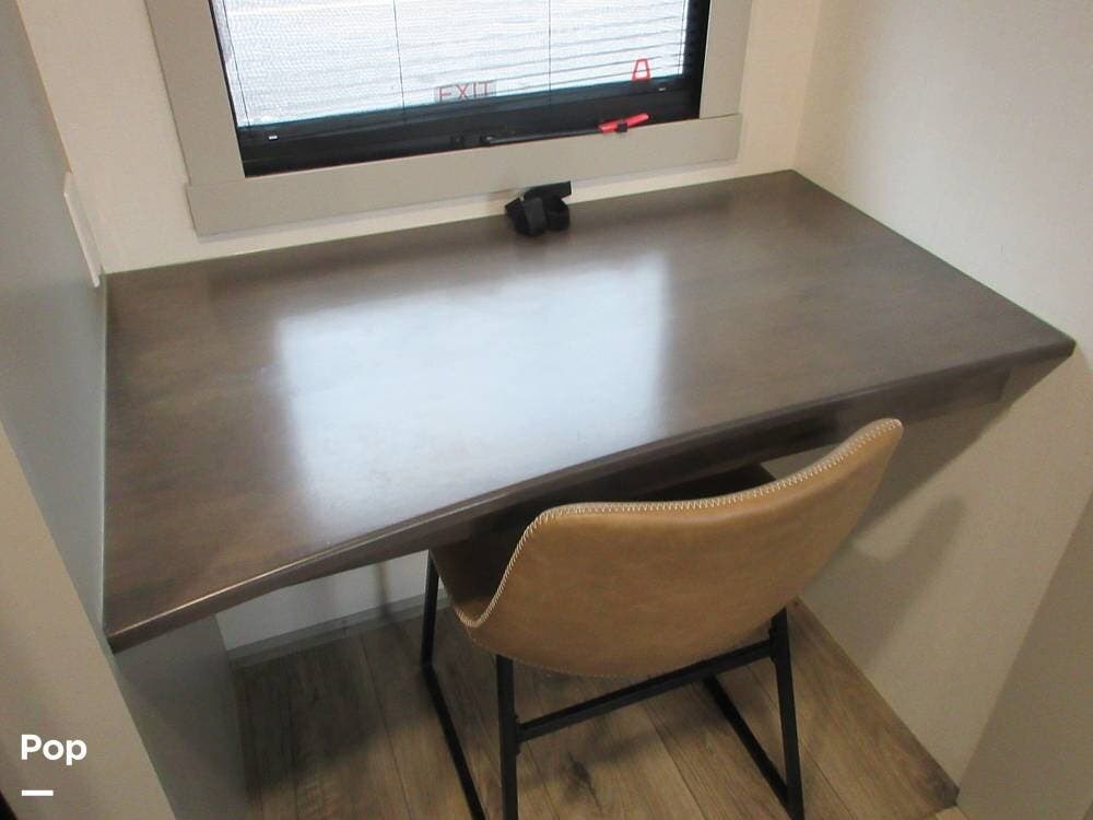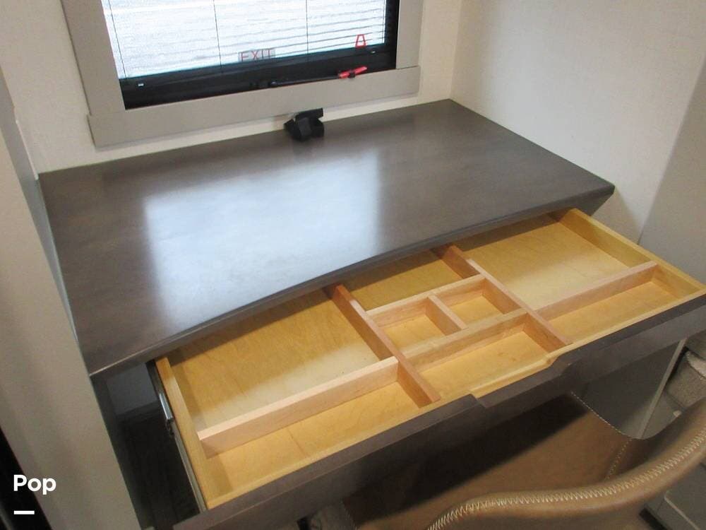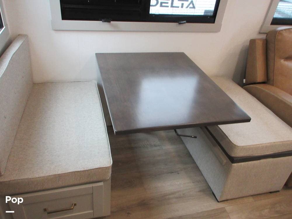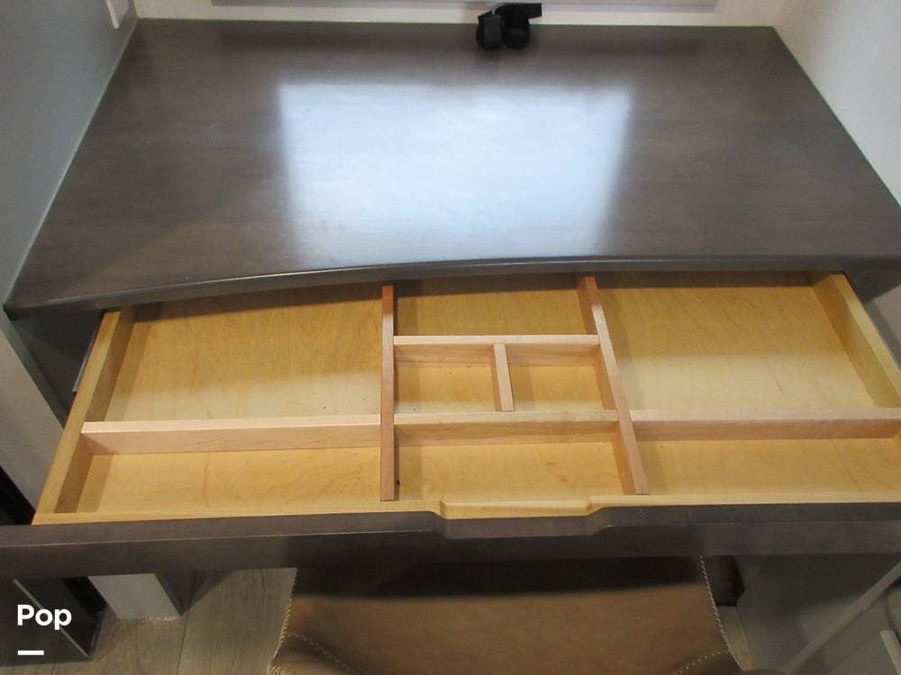 The dinette has one side with back rest a a bench seat on the other side that converts to an optional sleeping area. Big drawers under each seating area. Also, a desk and chair for a work area with a pull-out drawer.