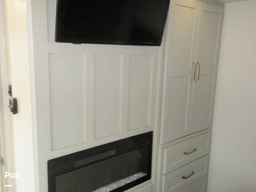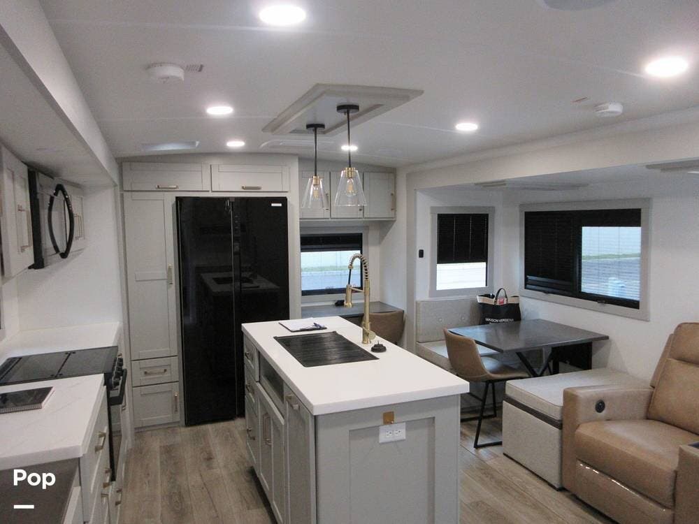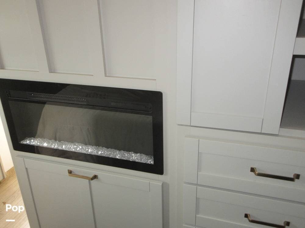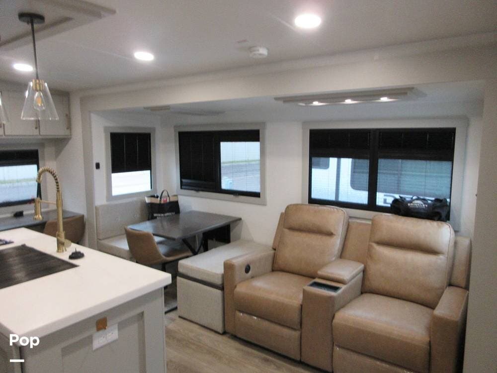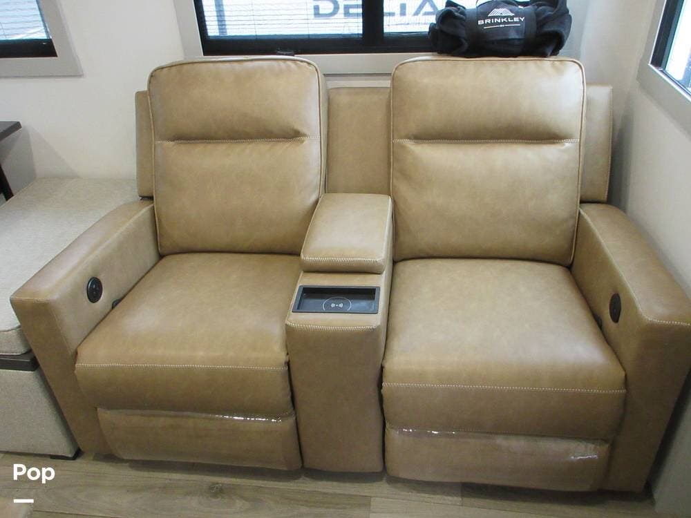2025 Brinkley Z Air 285 has two slide-outs for an open floor plan. Enter the open living area with two theater seats facing the TV over a fireplace.