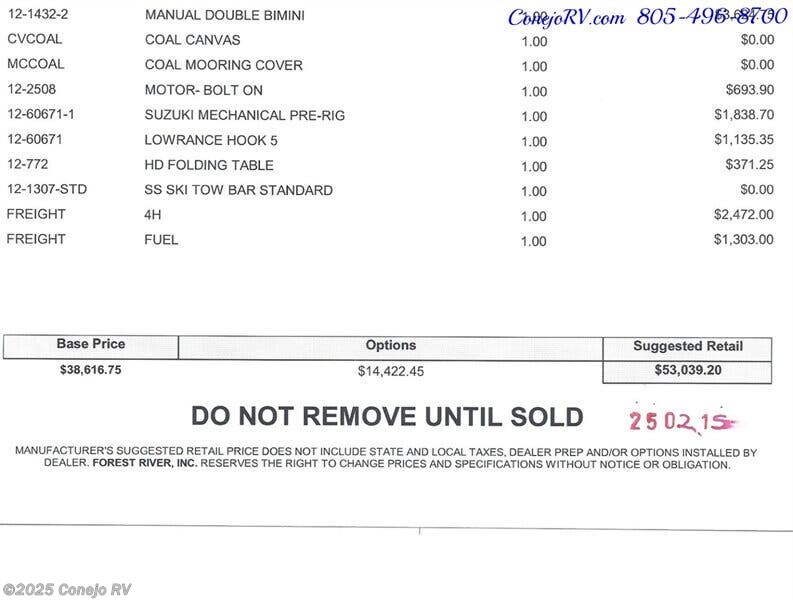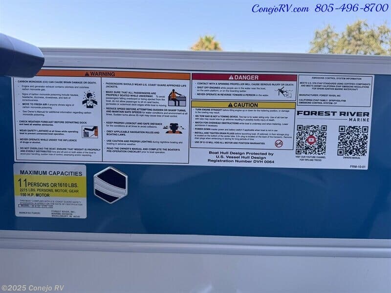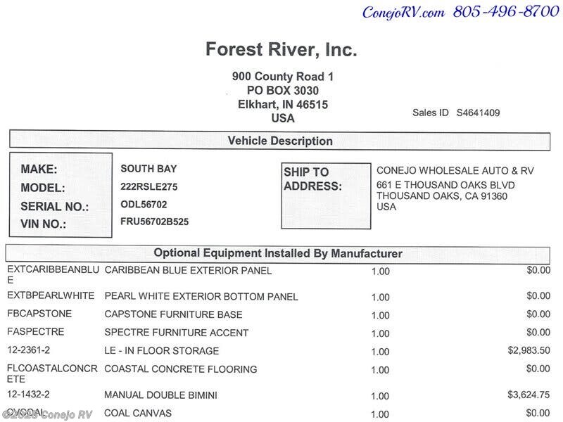 2025 South Bay 22RS LE **Our Price Only 59,990** Suzuki 4 Stroke Engine, Tri Toon, Caribbean Blue Exterior Top Panel, Pearl White Exterior Bottom Panel, Capstone Furniture Base, Spectre Furniture Accent, In Floor Storage, Clarion Bluetooth Stereo, 28 Gallon Fuel Tank, Livewell, Ski Tow Bar, Double Bimini, Coal Canvas, Coal Mooring Cover, 22’ Length, Deck Length 20’.5”, Width 8’.6”, Optional Lowrance Hook 5 Fish Finder & Chart Plotter, 11 Person Capacity, **Our Price Only $59,990 ** We Have Some Fantastic Financing and Take Trades Also! It is our #1 Goal That Your Experience With Our Company is an Enjoyable One with Our Staff of Industry Professionals, Conejo Wholesale Auto & RV, Exclusive Ventura County Dealer For Winnebago Navion, Revel, Solis, Ekko, Travato, Porto, Roam, Era, Storyteller Mode, Crew and Hilt, Tiffin GH1, GT1, and Open Trail, Roadtrek, Zion, & Agile and Play, Westfalia, South Bay Pontoon Boats, We Also Carry a Large Selection of Quality Pre-Owned Motorhomes which come with Our 45 Day/1000 Mile In-House Warranty at No Charge, Conejo RV, 661 E. Thousand Oaks Blvd, Thousand Oaks, CA 91360, 805-496-8700, Open 7 Days, 9am to 6pm, All Coaches Fully Inspected, Serviced and Detailed, Come Experience the No Pressure No Haggle Sales Approach at Conejo RV, We Also Buy Clean Late Model Coaches, 1 Year Free Camping Membership Included Ask For Details! (***plus tax & license fees***)