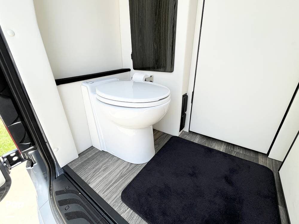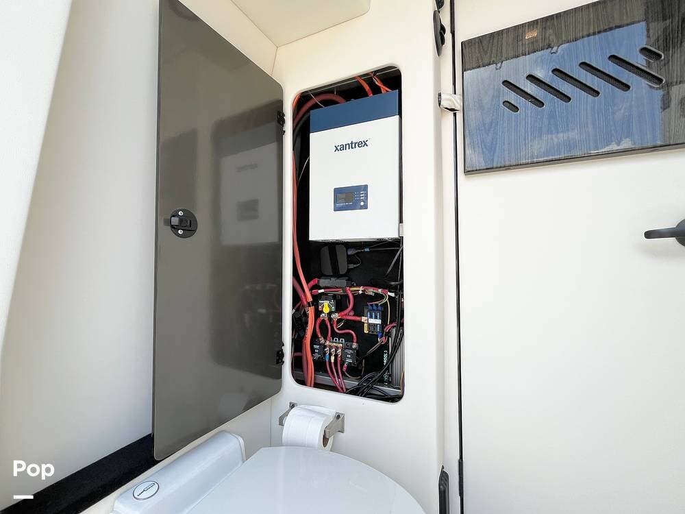 This V-Cruise has a private bathroom and an efficient kitchenette with a sink, refrigerator, and microwave. The toilet has a waste tank and wastewater washout.