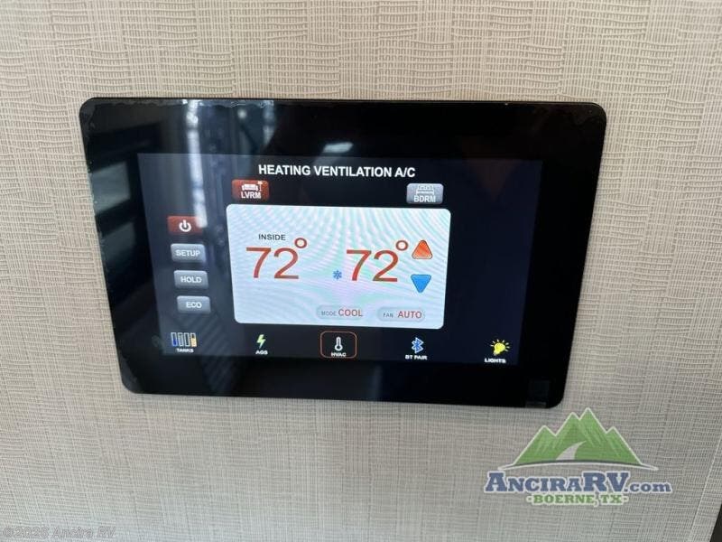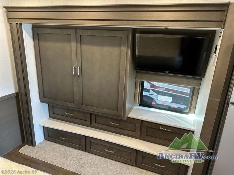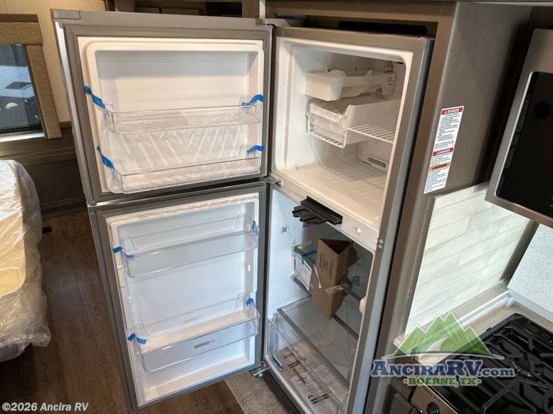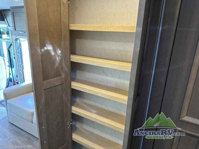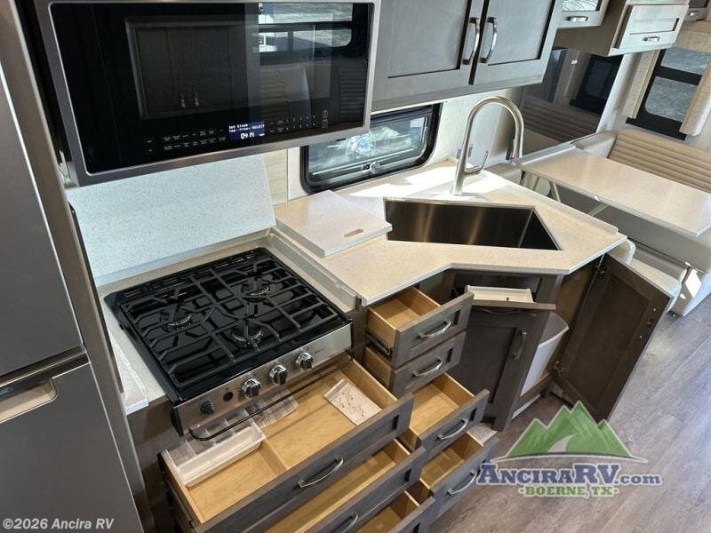 There is much to love about this motorhome! The full-wall slide provides added space, along with the king bed slide out in the rear private bedroom. You can easily prepare meals on the three burner cooktop, or use the stainless steel convection microwave, and the pantry will be perfect for dry goods or snacks. This model includes a 74" sofa comfort lounge and a booth dinette (sleeper) for seating and sleeping space, plus there is a Samsung LED TV in the living room and bedroom so you can watch your favorite shows. You'll find storage space up front, plenty of overhead compartments, plus lit basement storage.