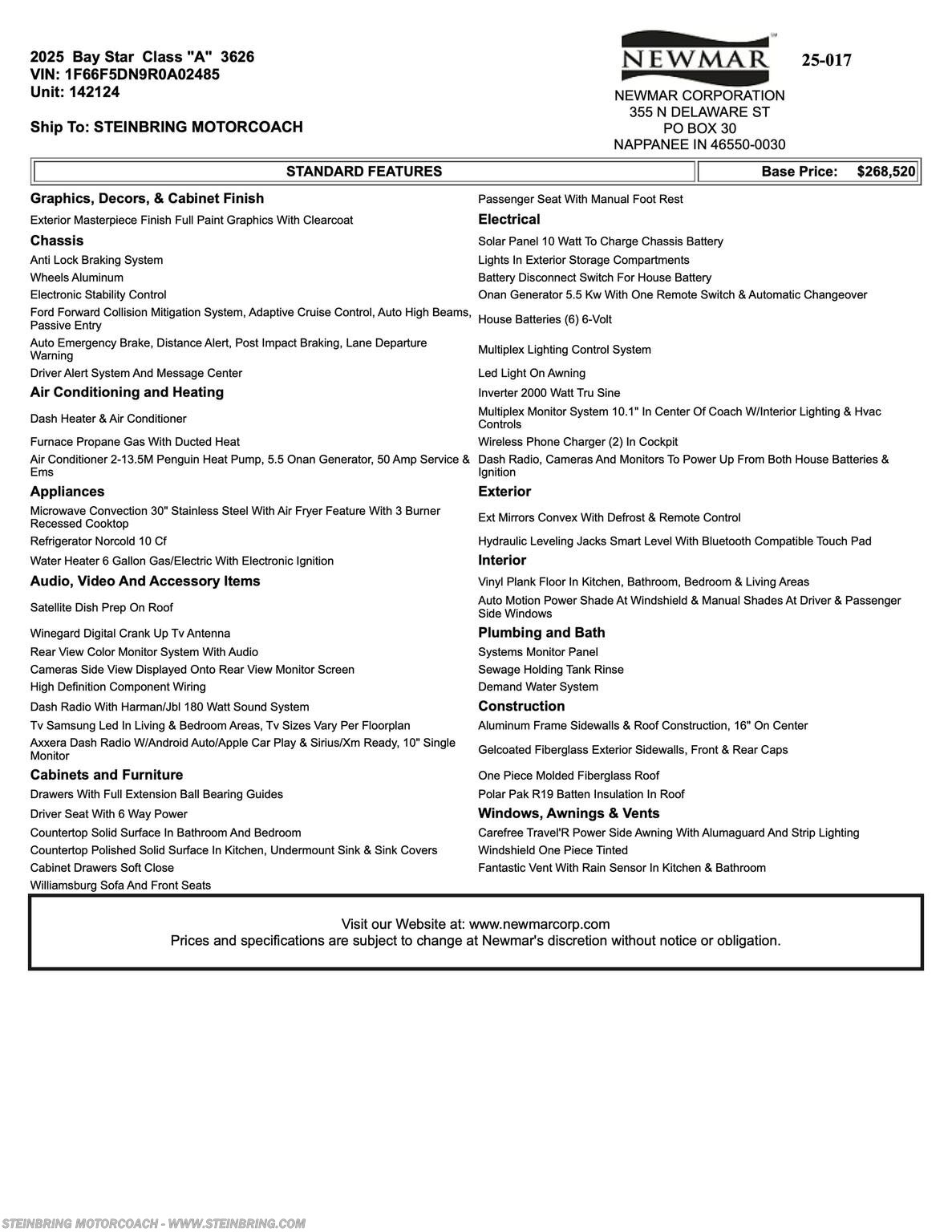 Request More Info on this 2025 Newmar Bay Star 3626 Offered for sale by Steinbring Motorcoach