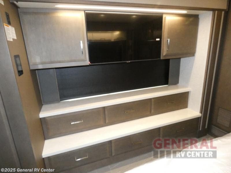There is much to love about this motorhome! The full-wall slide gives you plenty of room to walk from the front to the back and the two additional slide outs giving you even more space. The main living area offers theater seating, and a buffet dinette for dining with a 50" TV on power lift by it. You will also be able to utilize the driver/passenger seats which include six-way power lumbar, recline, and footrest when drinking your glass of wine or cup of coffee. The kitchen offers everything you will need to make any meal, plus the stainless steel appliances are stylish. The rear private bedroom has a king bed slide for a good night's rest, a dresser with adjustable shelves on either side, and a rear wardrobe with sliding mirror doors, shoe storage and even a safe!
