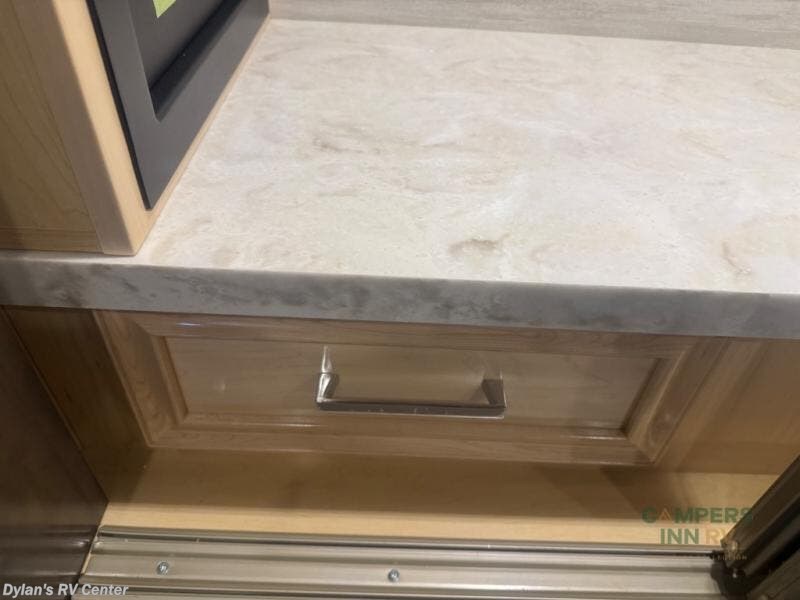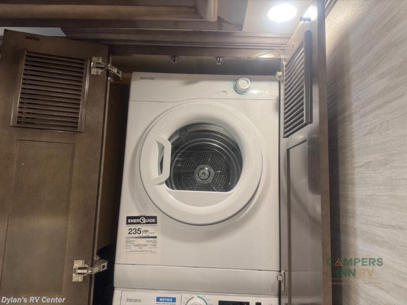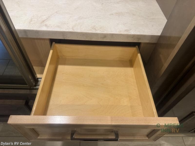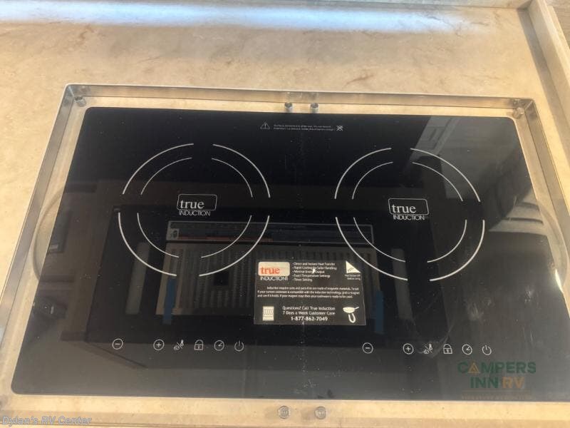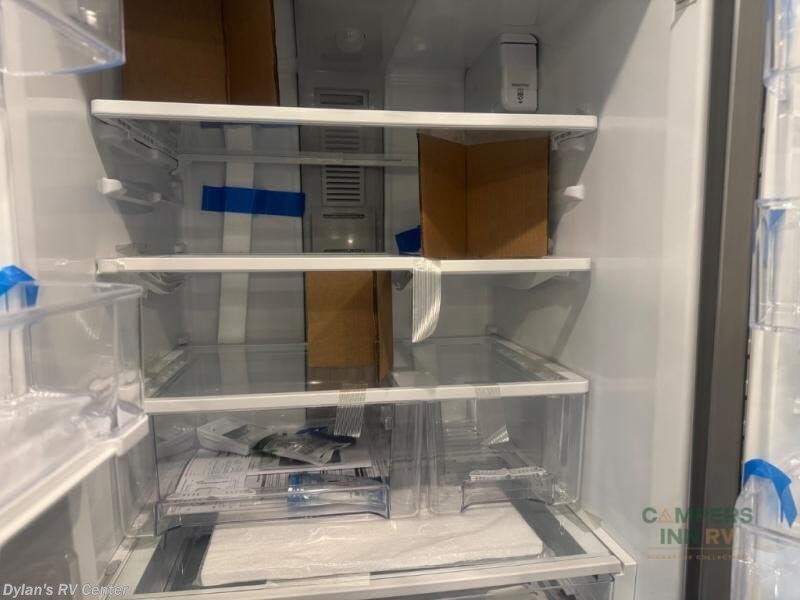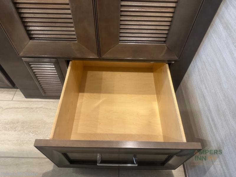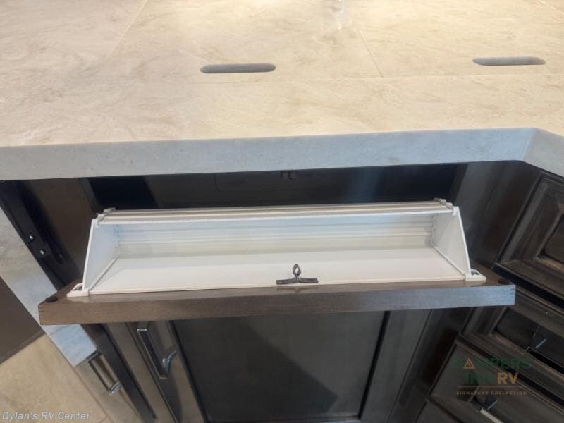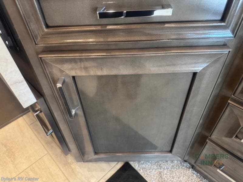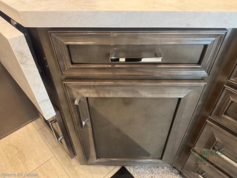 This triple slide out coach will fit your family or group of six perfectly! There is a rear private bedroom with a retracting queen bed slide out, a wardrobe with sliding mirror doors, plus washer and dryer prep. The little ones will love the bunks with drawers below to keep their things organized, and the full bath is right across from the bunks for easy nighttime use. You could even close the two sliding doors here to make one bunkhouse suite! Head to the main living area to relax on the hide-a-bed sofa across from the TV on power lift, or you can play a game at the booth dinette. The kitchen includes everything you need to prepare meals each day, including an all-electric flush mount induction cooktop plus a Whirlpool 19.7 cu. ft. refrigerator and pantry for food storage!