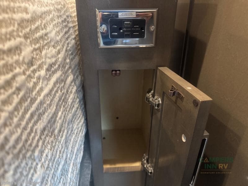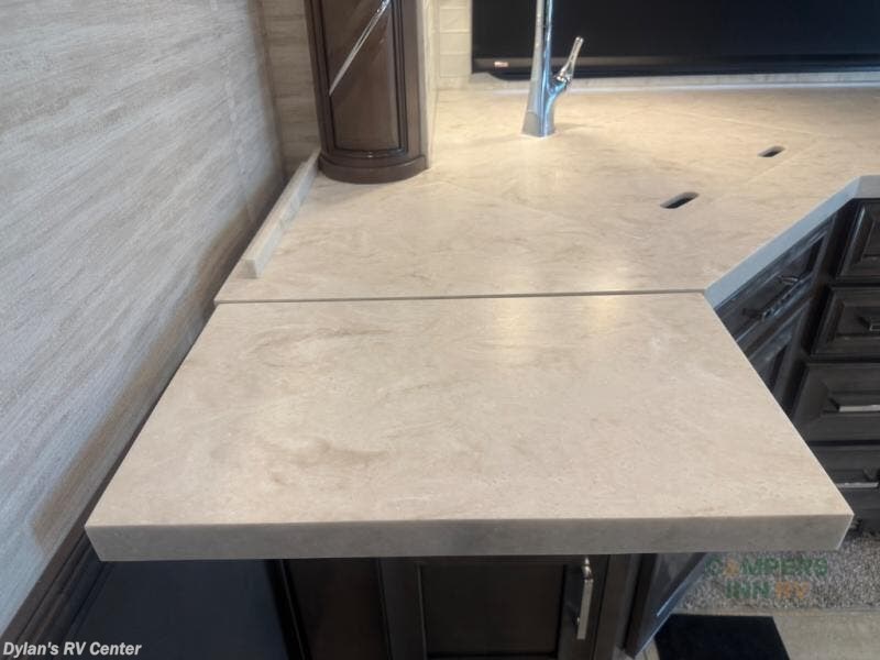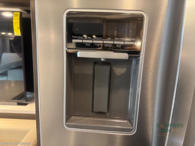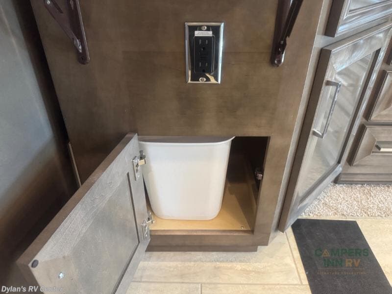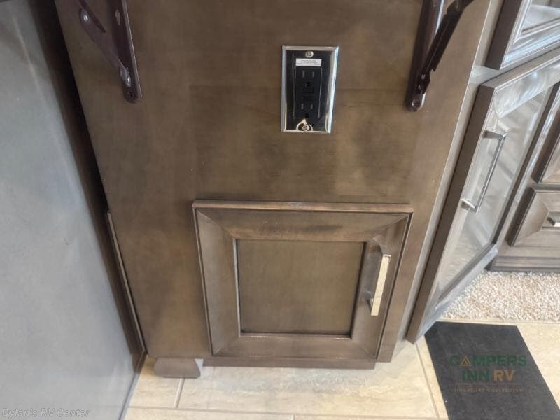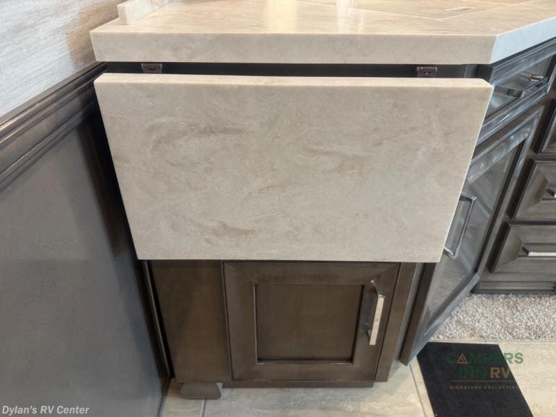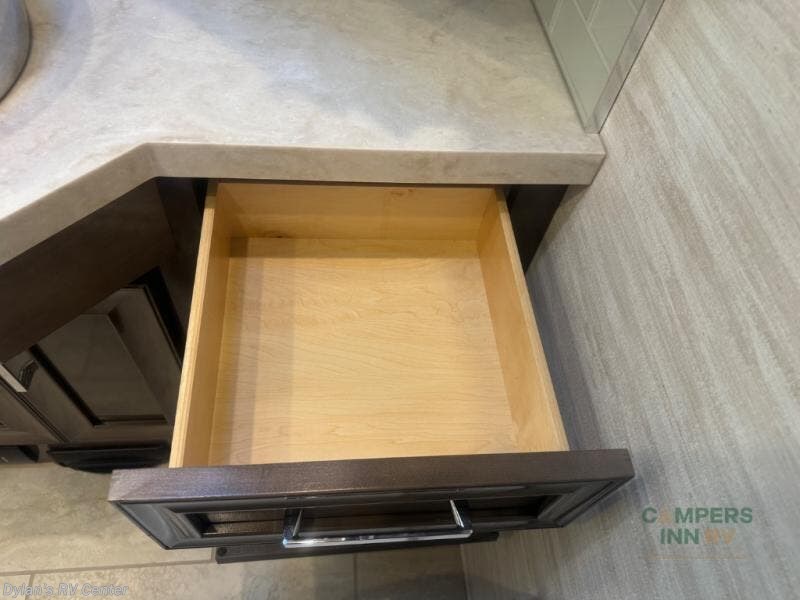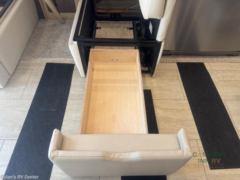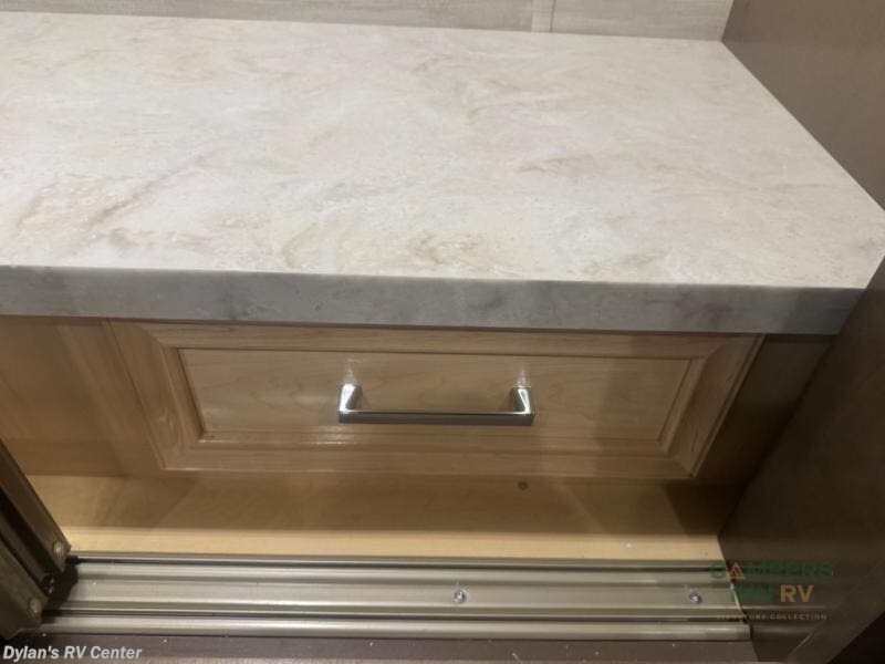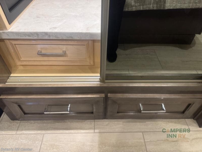 This triple slide out coach will fit your family or group of six perfectly! There is a rear private bedroom with a retracting queen bed slide out, a wardrobe with sliding mirror doors, plus washer and dryer prep. The little ones will love the bunks with drawers below to keep their things organized, and the full bath is right across from the bunks for easy nighttime use. You could even close the two sliding doors here to make one bunkhouse suite! Head to the main living area to relax on the hide-a-bed sofa across from the TV on power lift, or you can play a game at the booth dinette. The kitchen includes everything you need to prepare meals each day, including an all-electric flush mount induction cooktop plus a Whirlpool 19.7 cu. ft. refrigerator and pantry for food storage!