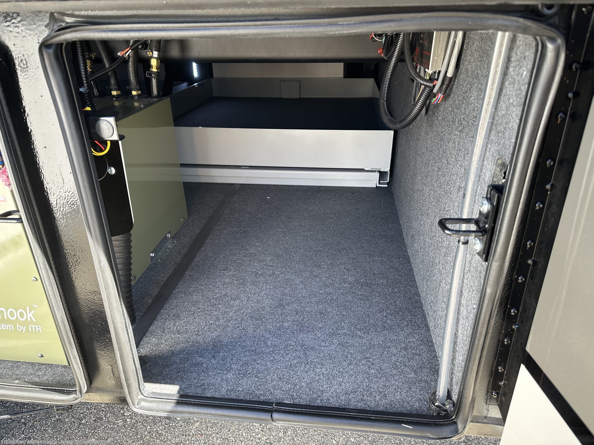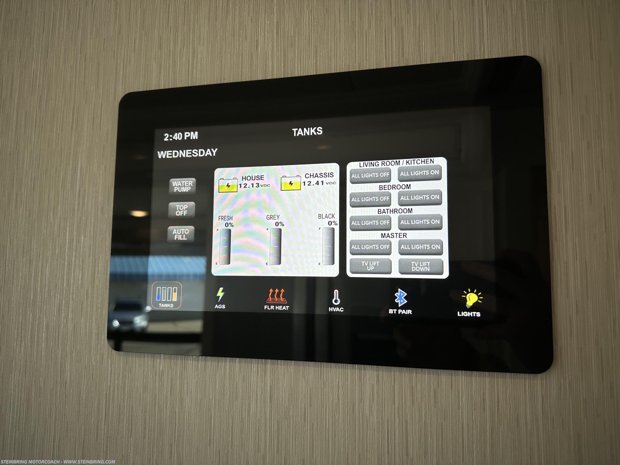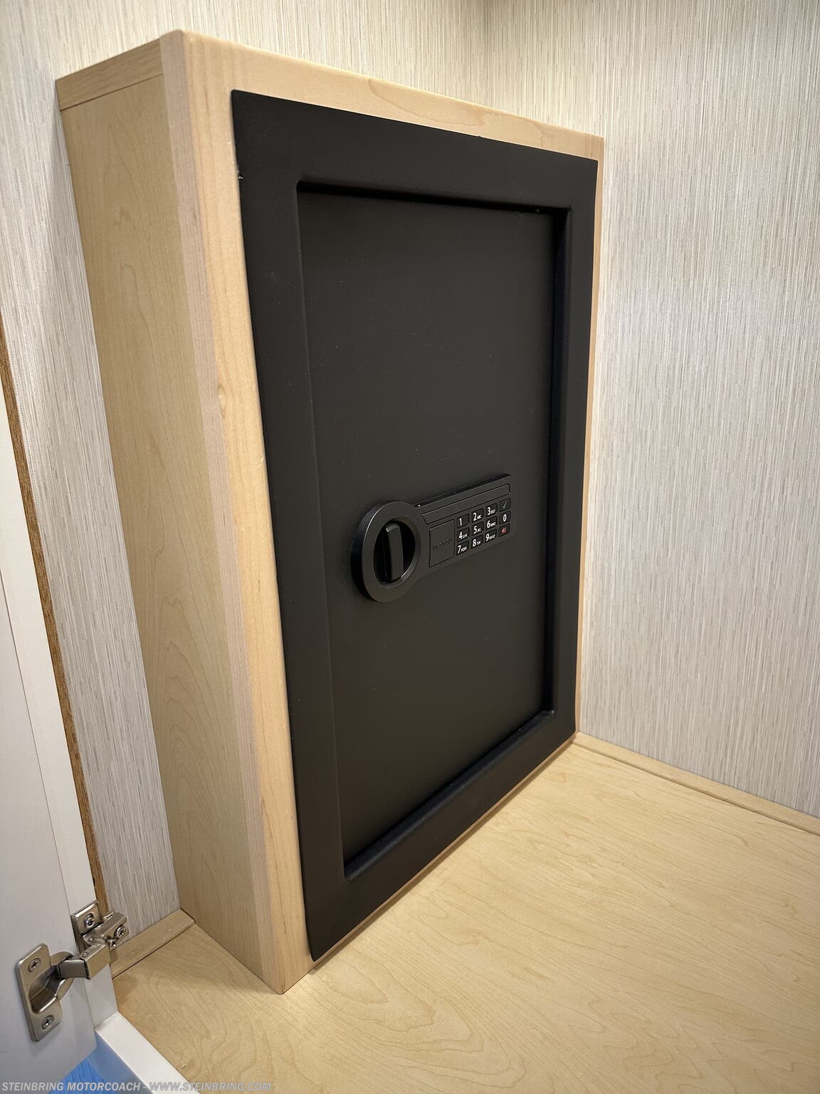 - Storage and utilities: transfer switch with surge protector, electric heat below floor tile, and a safe in the bedroom area