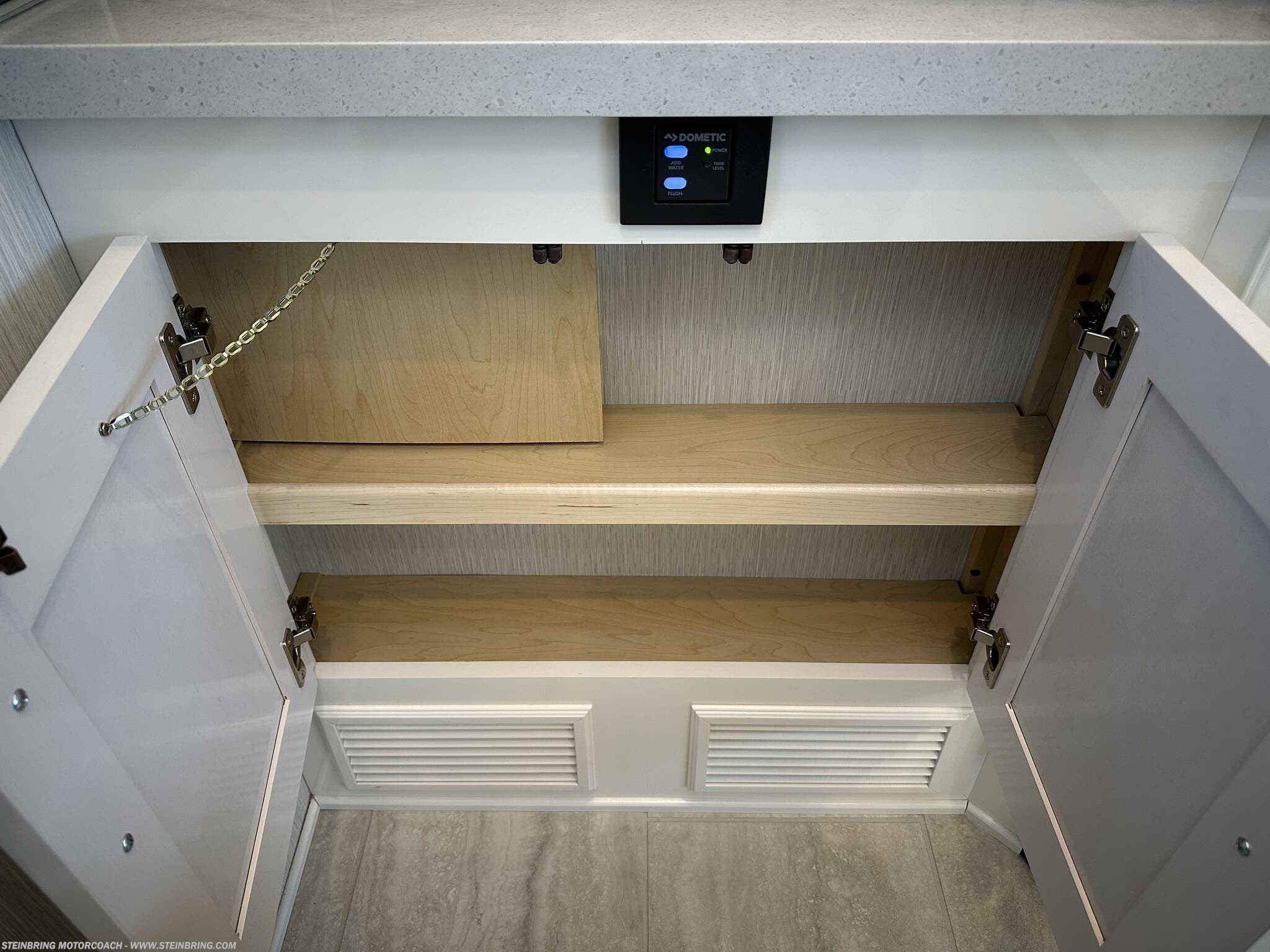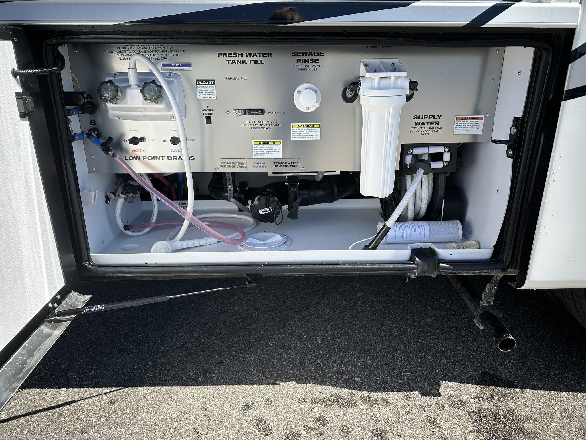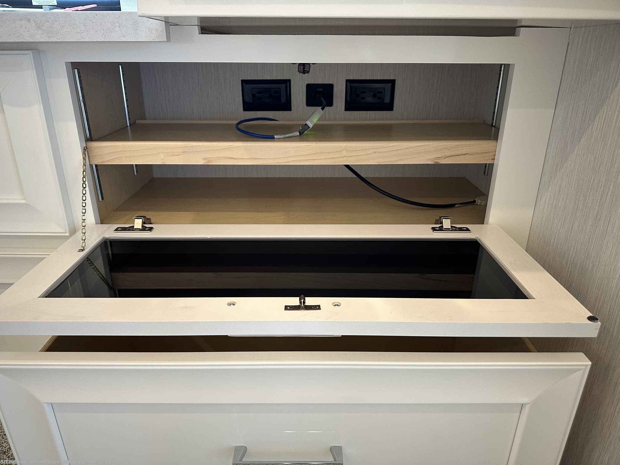 - Storage and utilities: transfer switch with surge protector, electric heat below floor tile, and a safe in the bedroom area