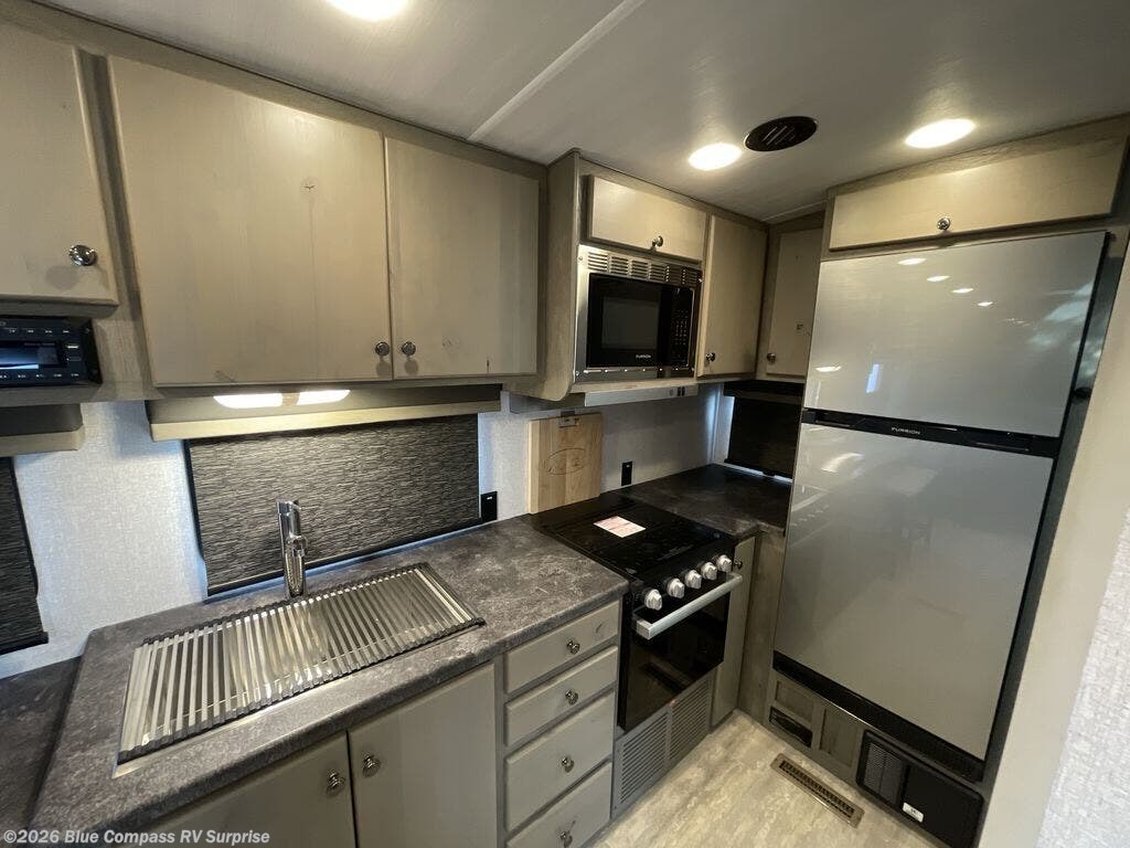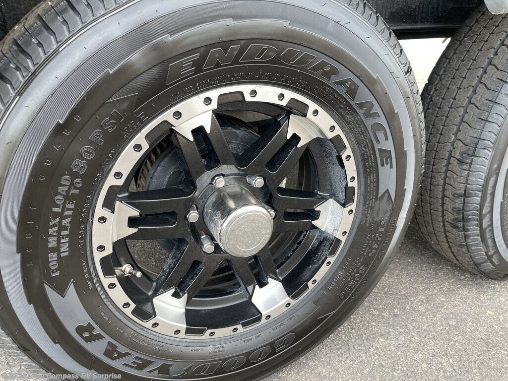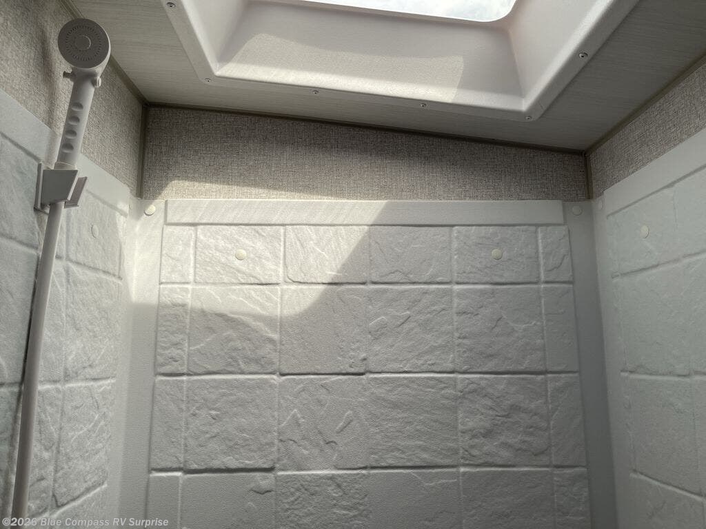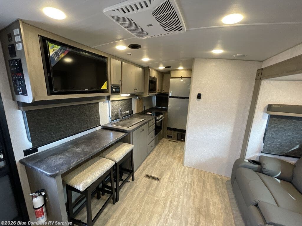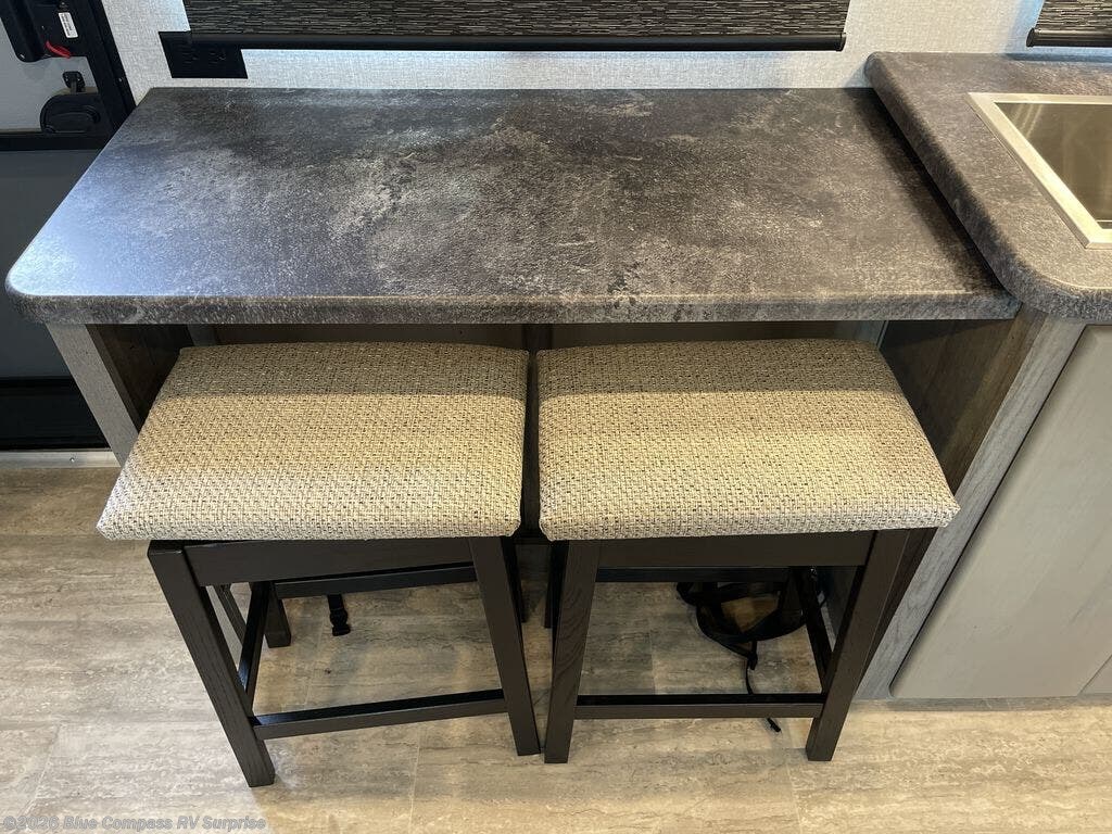 This is the perfect couple's trailer for all your adventures! You can wake up on the queen bed feeling refreshed each morning, and the wardrobe by the foot of the bed will keep your clothes organized. There is a theater seating slide out for more floor space and a place to relax each day, and the dining bar with bar stools gives you a place to enjoy meals together. And don't overlook the full bath with a shower skylight, a foot-flush toilet, and a linen closet for clean towels!
