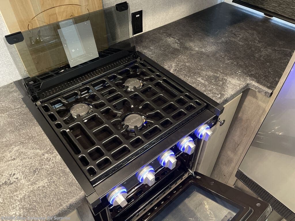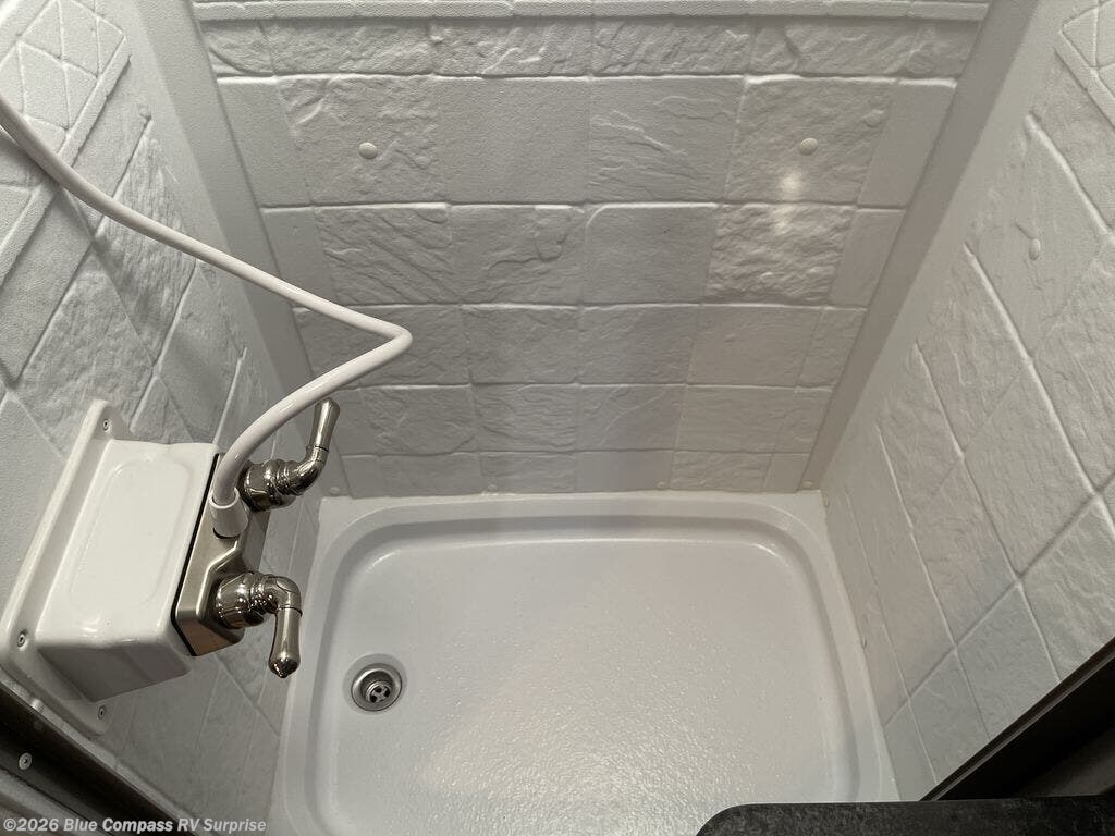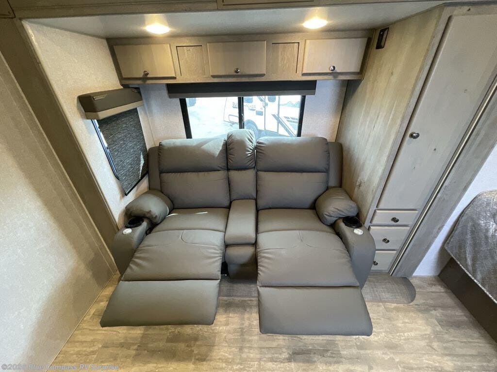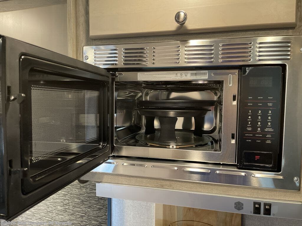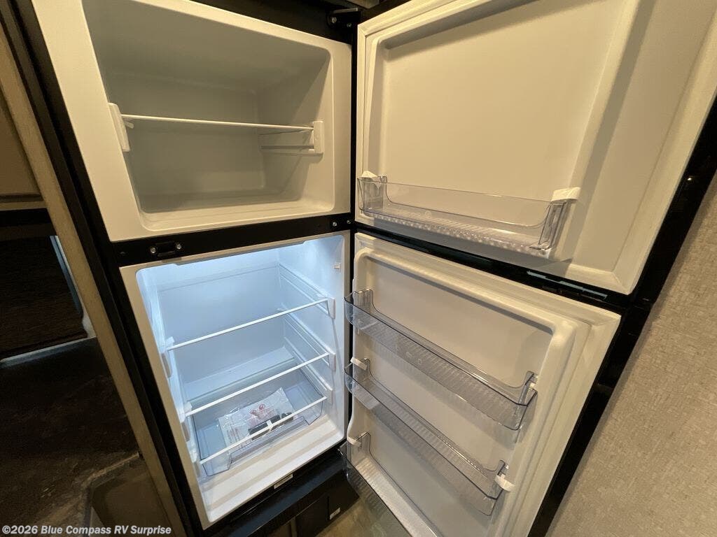 This is the perfect couple's trailer for all your adventures! You can wake up on the queen bed feeling refreshed each morning, and the wardrobe by the foot of the bed will keep your clothes organized. There is a theater seating slide out for more floor space and a place to relax each day, and the dining bar with bar stools gives you a place to enjoy meals together. And don't overlook the full bath with a shower skylight, a foot-flush toilet, and a linen closet for clean towels!