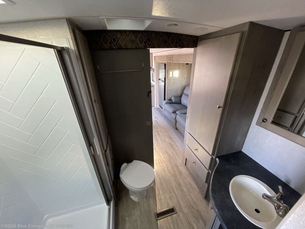 Camping trips in this travel trailer are sure to bring great memories! There are dual entry doors that allow you to enter in through the rear kitchen or the front master bedroom. Your crew can get comfy on the 68" theater seating, play a game at the booth dinette, or visit outdoors under the 15' 12V LED awning! The spacious walk-through bath includes two linen closets plus additional storage to keep bath necessities and clean towels close by, and you'll love having the front master bedroom all to yourselves!