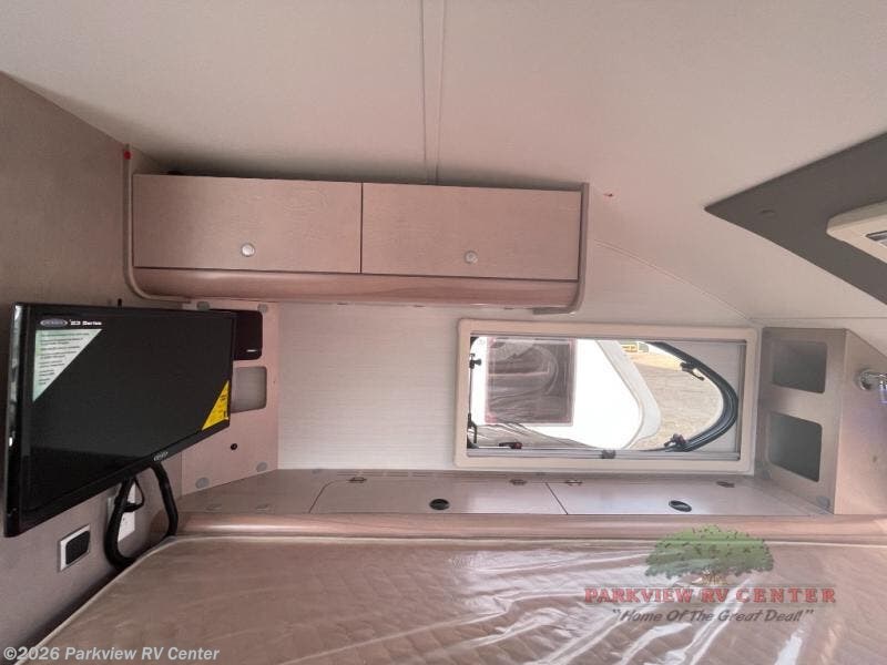 You will find a pass-thru window on this Cirrus truck camper. The exterior has a Maggie roof rack for bringing along extra gear, and there is a motorized 8' side awning to protect you while you're living life outside. The convection microwave/oven is going to make your meal prep easier and faster, and the air conditioning will keep this camper's interior at a desirable temperature even when it's hot outside. This model also comes with an HDTV dish and a great sleeping area with the Froli sleep system.