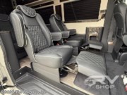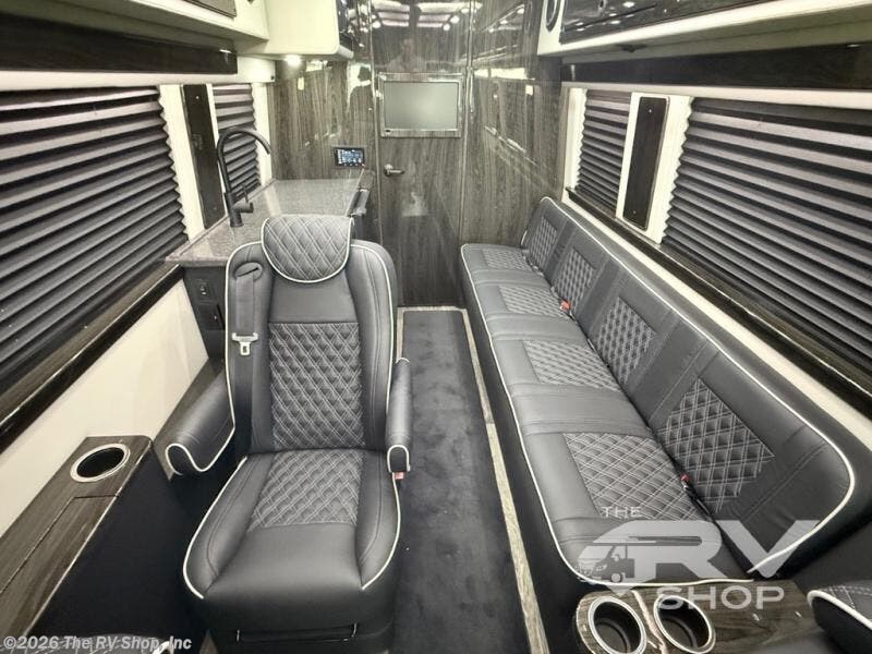 Are looking for a van to take on day trips? This coach will seat nine perfectly with five captain's chairs and a sofa/foldout bed, which will double as sleeping space for one to two if you need to take it overnight. The kitchenette across from the sofa includes a sink to freshen up with, and there is a 3.75 cu. ft. 12V refrigerator for cold drinks. A rear toilet includes a privacy door and there is luggage storage for added convenience. This model also includes a 32 gallon black/grey combination tank, and an optional partition wall can be added for chauffeur driven customer requirements!