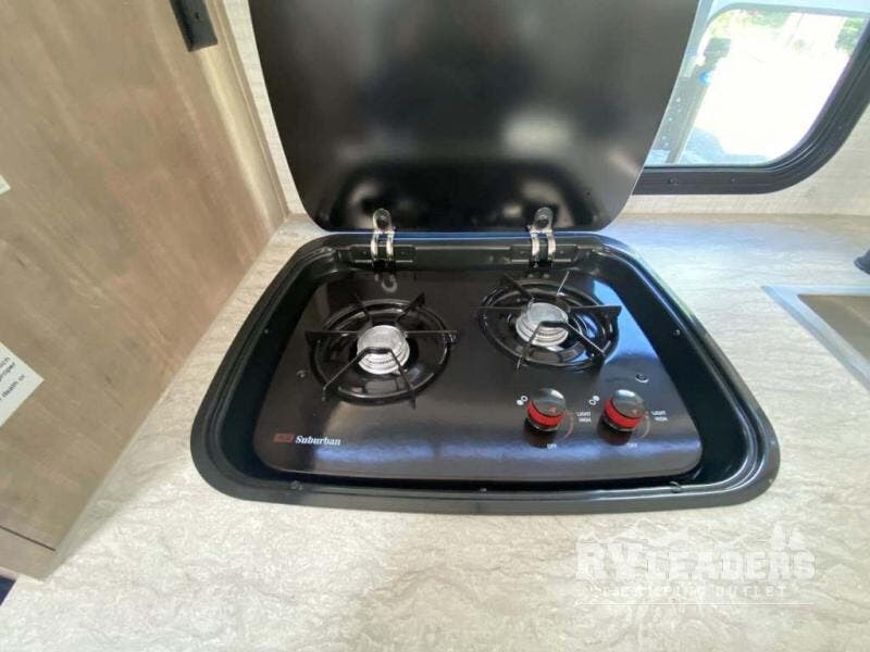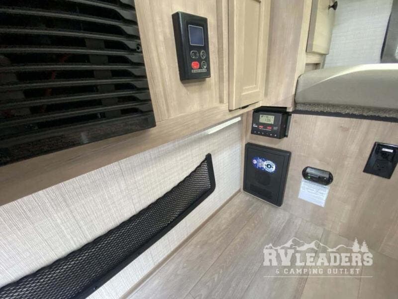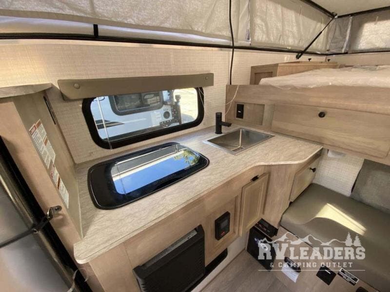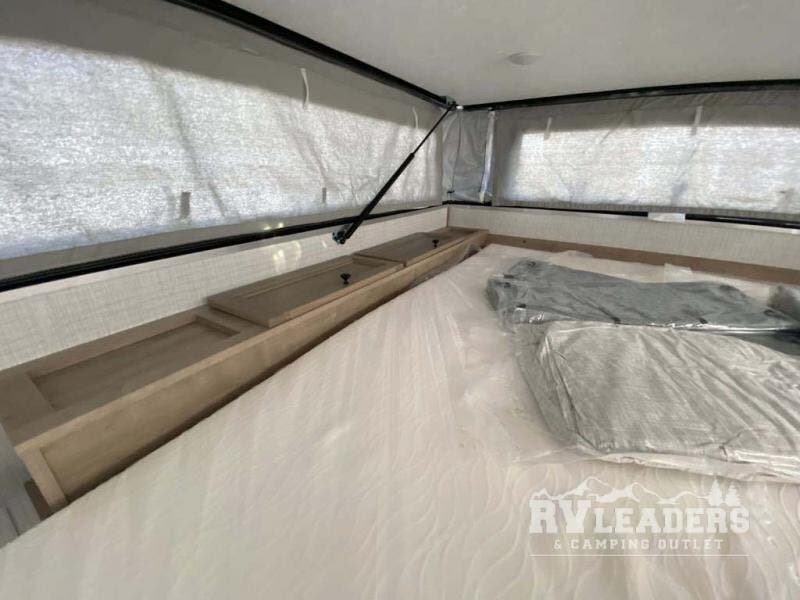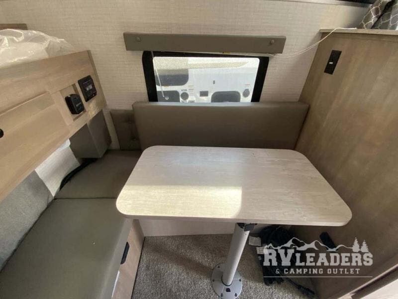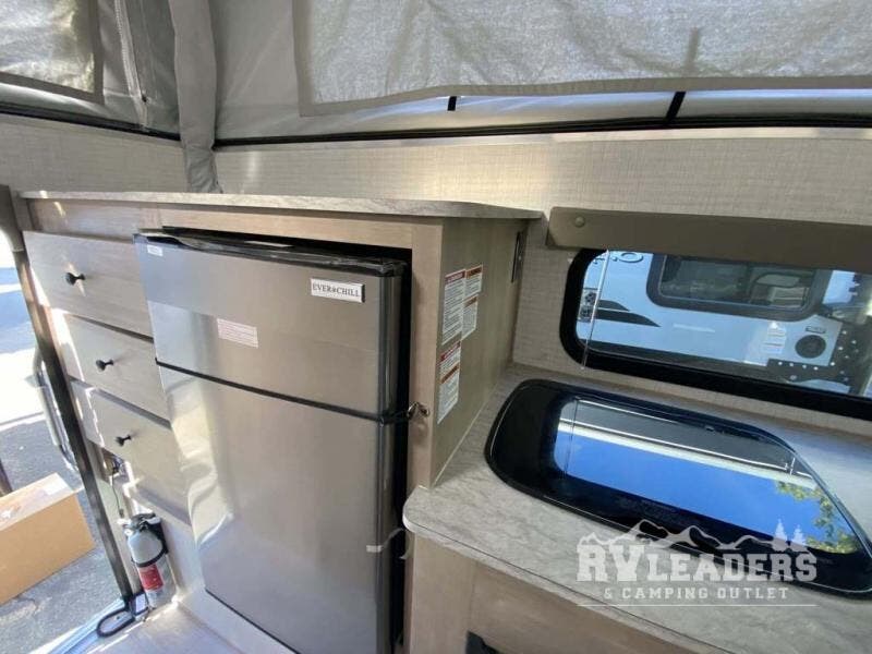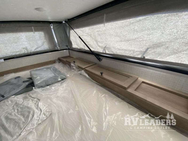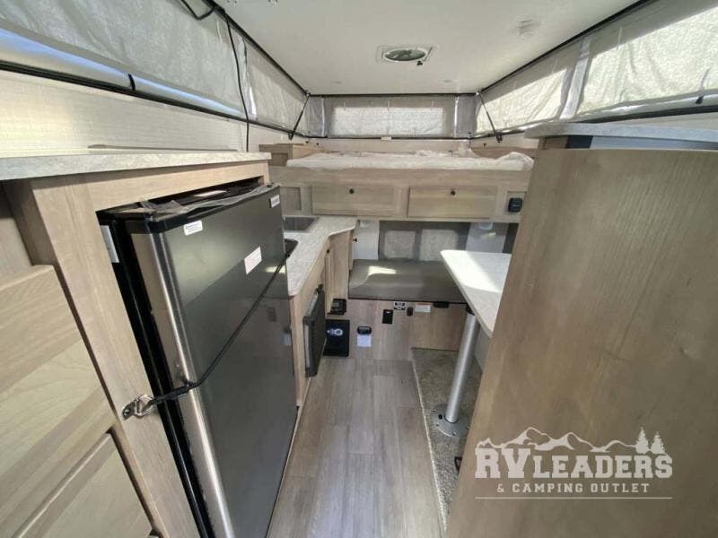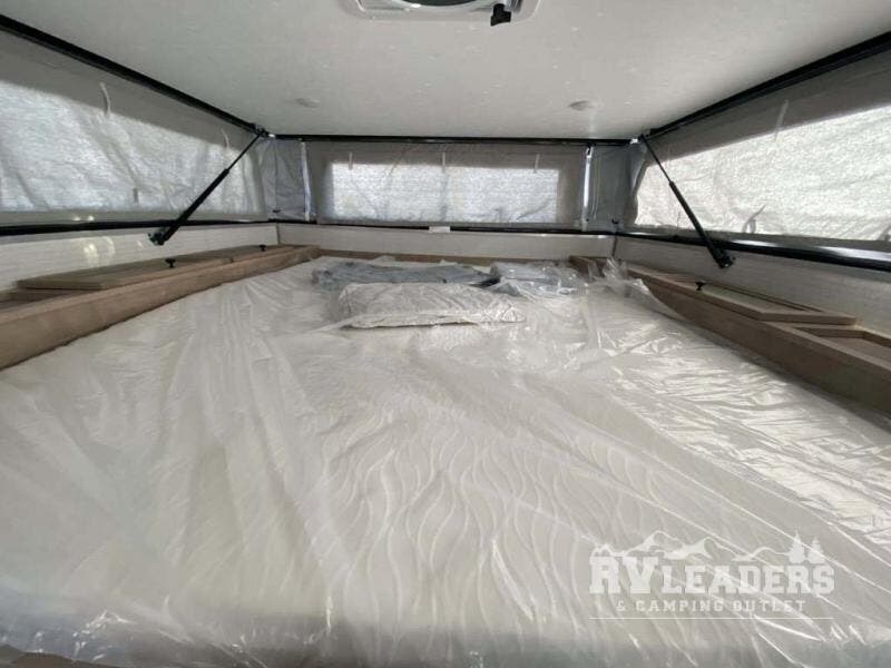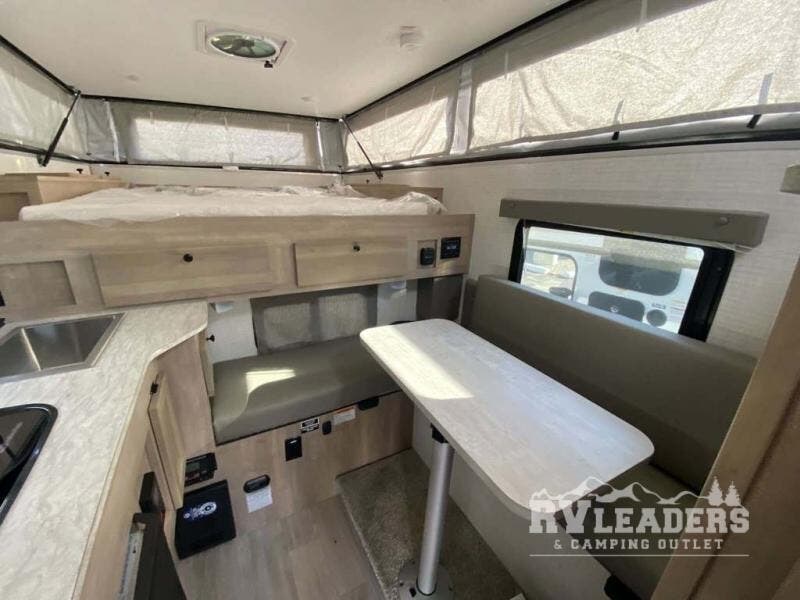 Make the most of all your adventures with this soft side truck camper! Start each morning feeling recharged after sleeping on the front queen bed with foot lockers and bedroom storage on either side of it, and freshen up in the wet bath with storage to keep your towel nearby. There is storage across from the bathroom for your canned goods, a refrigerator to keep your perishables fresh, and a two burner cooktop to prepare your best meals. Enjoy your meals at the seating area with a table then grab a board game from the storage area under the seating!