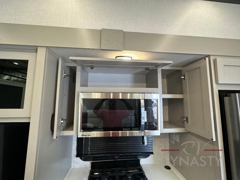 Camping with friends and family just got a whole lot easier in this spacious fifth wheel! Up front, you'll find a private bedroom with a king bed slide out, a dresser, a wardrobe with a shelf, plus washer and dryer prep if you plan to go full-time. The master bedroom towards the back includes a queen bed slide out, a wardrobe and a dresser, plus a full rear bath with a unique rear entry door. There is also a loft bed with a ladder above this rear room for added sleeping or storage space! Everyone can meet in the middle kitchen and living room that includes theater seats with tables, a kitchen island, an entertainment center with a fireplace, plus a pantry and hutch for added storage. You don't want to miss out on this fifth wheel!