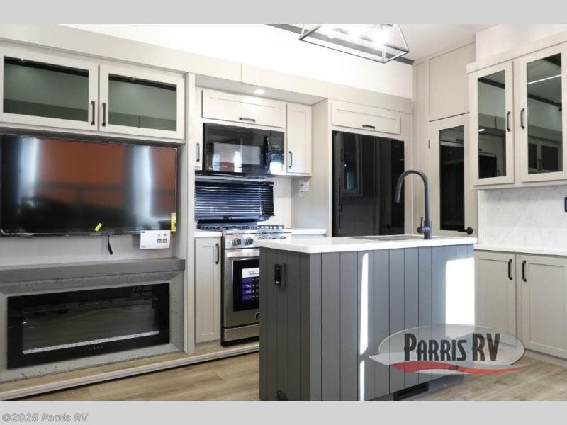Camping with friends and family just got a whole lot easier in this spacious fifth wheel! Up front, you'll find a private bedroom with a king bed slide out, a dresser, a wardrobe with a shelf, plus washer and dryer prep if you plan to go full-time. The master bedroom towards the back includes a queen bed slide out, a wardrobe and a dresser, plus a full rear bath with a unique rear entry door. There is also a loft bed with a ladder above this rear room for added sleeping or storage space! Everyone can meet in the middle kitchen and living room that includes theater seats with tables, a kitchen island, an entertainment center with a fireplace, plus a pantry and hutch for added storage. You don't want to miss out on this fifth wheel!