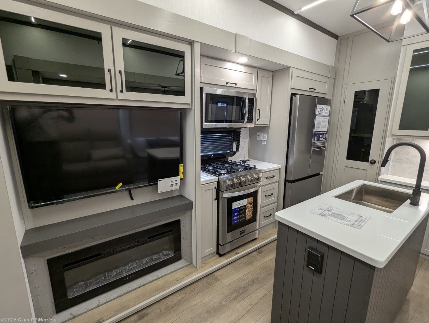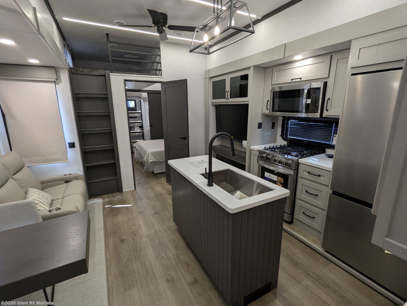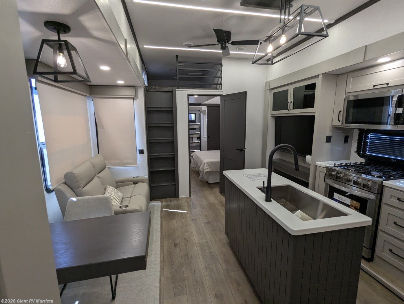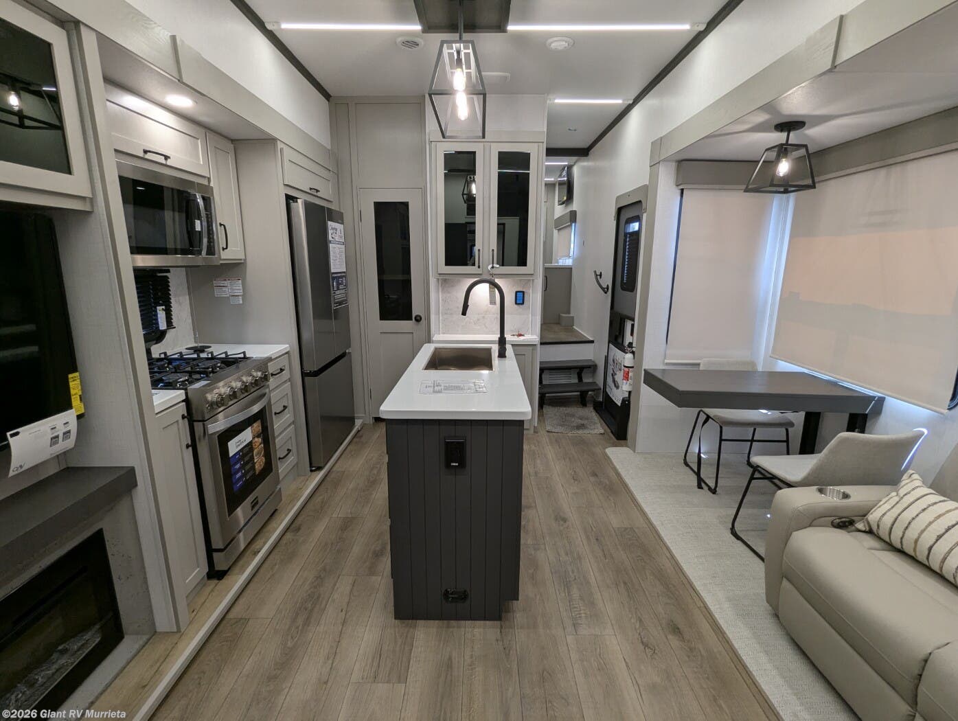 - Central Living Area: Theater seating, kitchen island for RV camping