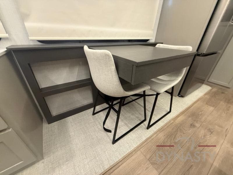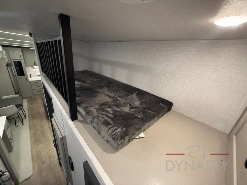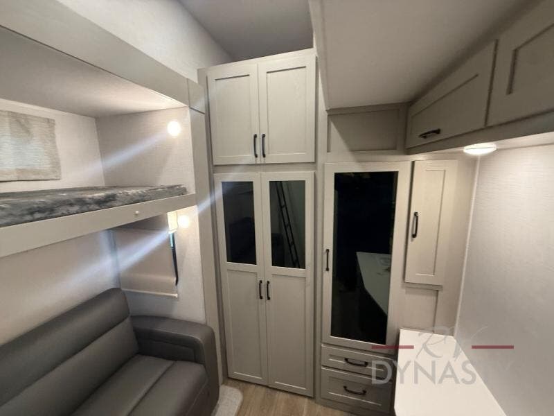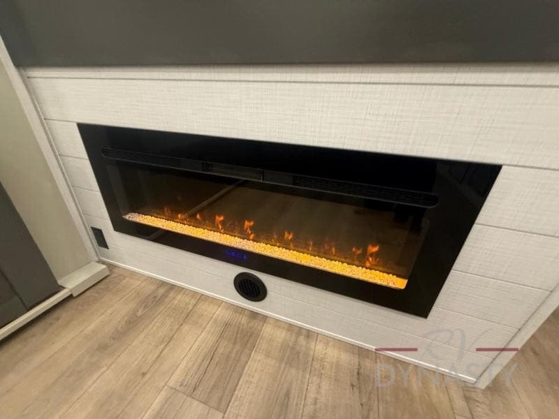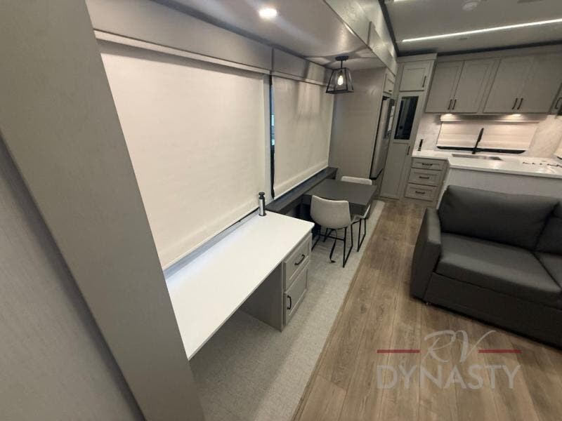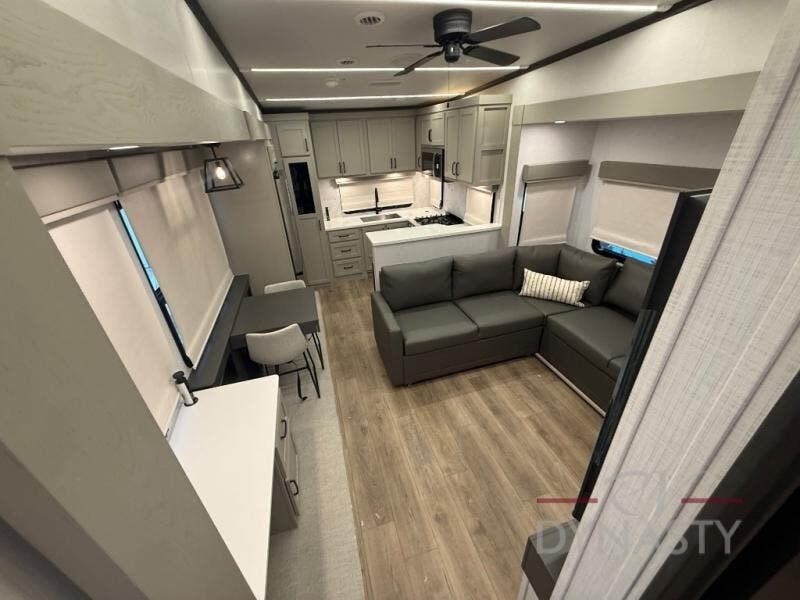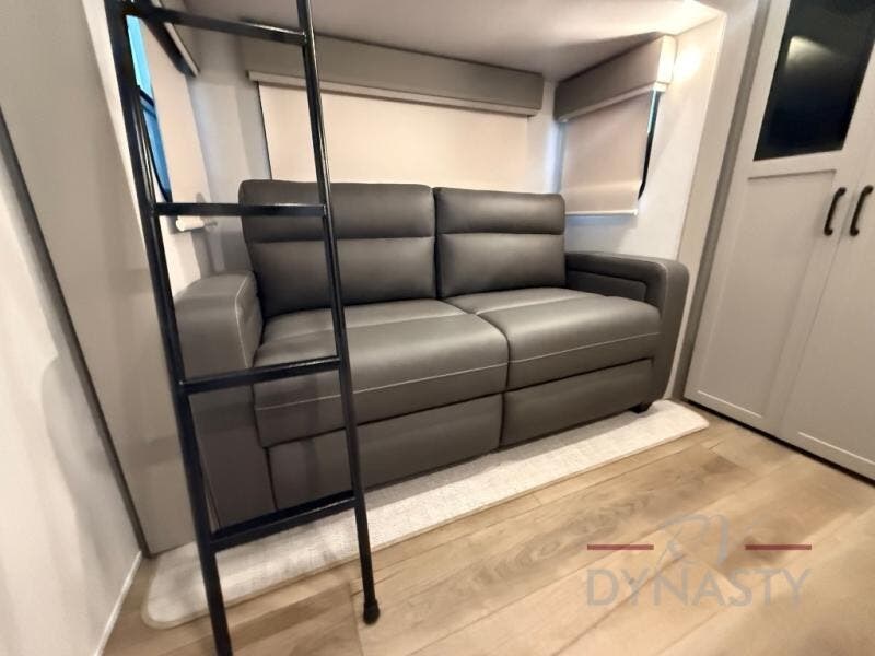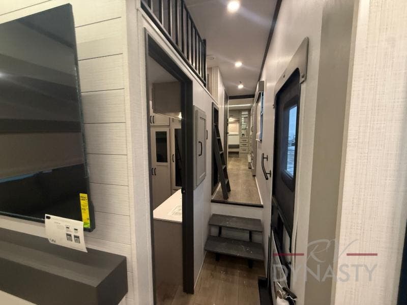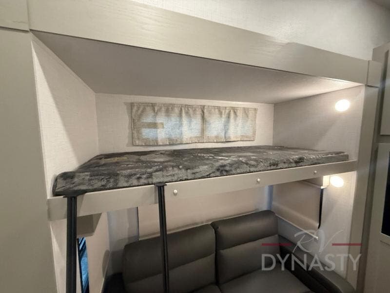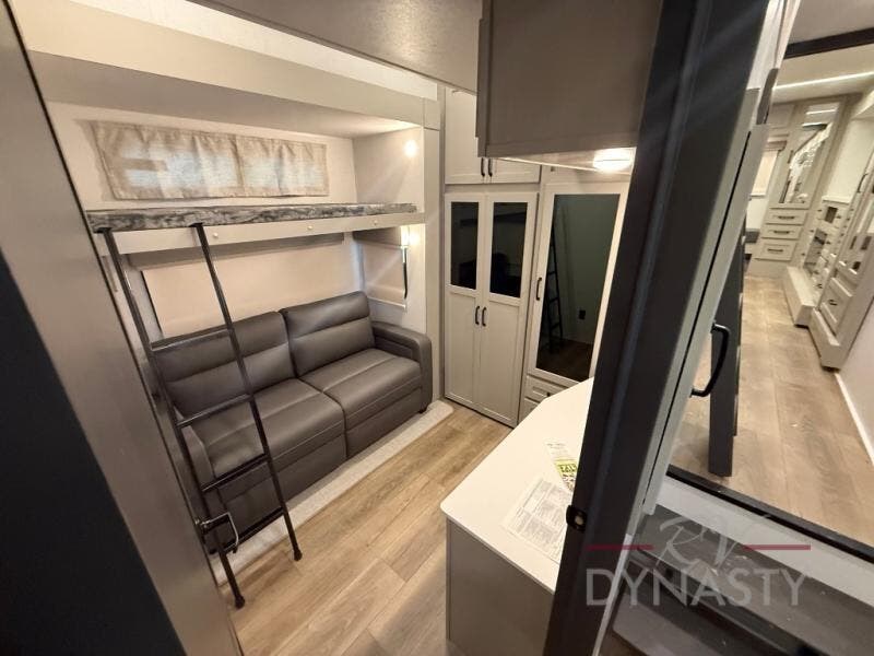 If you enjoy camping with a large group of family or friends, this fifth wheel will be perfect for you! There are five slides, giving your crew plenty of space to relax, plus there is a mid-bunk room with a tri-fold sofa, a 30" x 68" bunk, and a desk. And above this room is a 30" x 68" loft for even more sleeping or storage space. You can claim the front private bedroom all to yourselves which includes a king bed, front bench with dual wardrobes, plus a bedroom fireplace and Smart TV. Everyone can enjoy visiting together in the middle living room on the L-lounge by the entertainment center with a second fireplace. There is a table and chairs for dining space, plus a desk with a chair if you need to get some work done. And don't overlook the rear kitchen with a large refrigerator and pantry, all the appliances to make meals, plus ample counter space, including a bar top that overlooks the main living area!